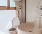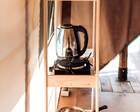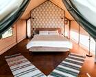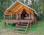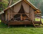 9 сафари‐тентов стандарт и увеличенных — для пары с доп. местами. В каждом глэмпе: душ, умывальник, туалет, шкаф, обогреватель, электричество и розетки.