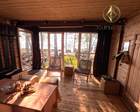 Русская парная на дровах с витражным окном — пар становится мягче и ароматнее, когда солнечный свет преломляется через цветное стекло.