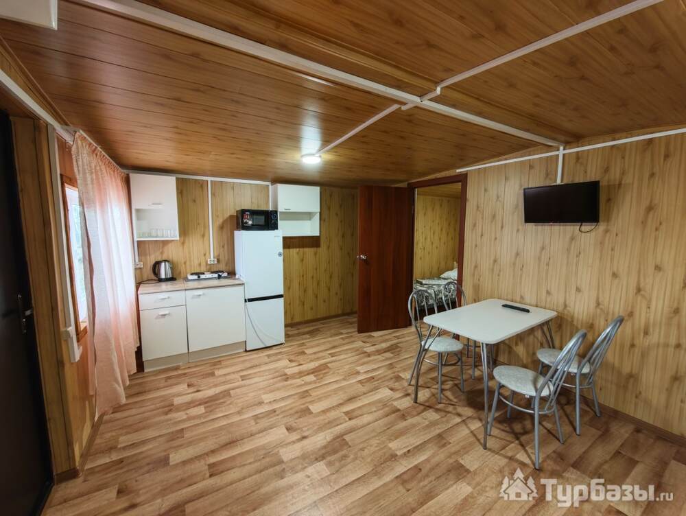 Формат питания здесь гибкий: кухня в номере, а на территории есть место для пикника, беседки и мангалы, что удобно для самостоятельной готовки и отдыха на свежем воздухе. Рядом также упоминаются кафе и продуктовый магазин, поэтому организовать питание на месте несложно.