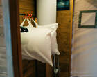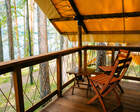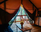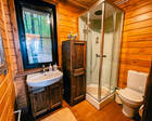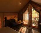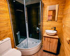 - Глэмпинг (34 м2) — для 2–4 человек, двуспальная кровать, мини‐бар, чайник и кофеварка, собственная ванная.