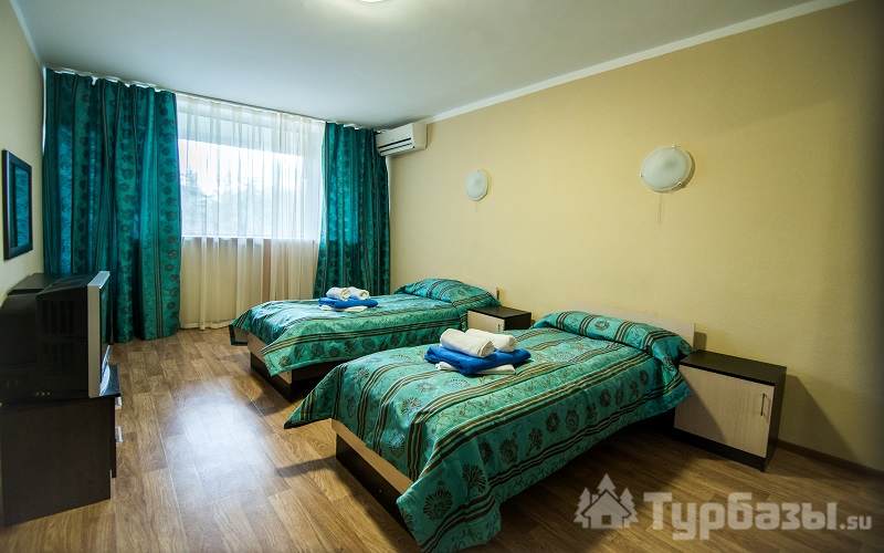 В «Голубой волне» отдыхающих размещают в двух корпусах. В каждом из таких корпусов могут одновременно проживать 250 человек. Однокомнатные номера рассчитаны на 2-3 места. Номера «люкс» и «полулюкс» двухместные, состоят из двух комнат. Во всех номерах имеются санузел, мебель, спутниковое телевидение. В номерах «люкс» и «полулюкс» - телефон, кондиционер. В каждом номере – лоджия с красивой плетеной мебелью.