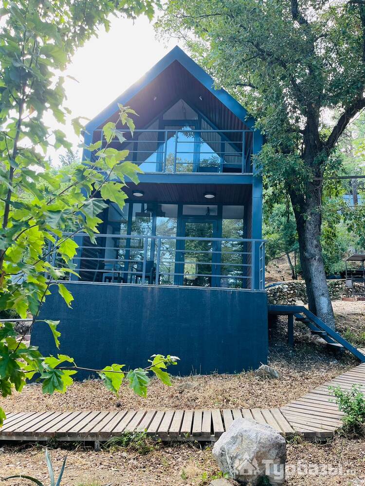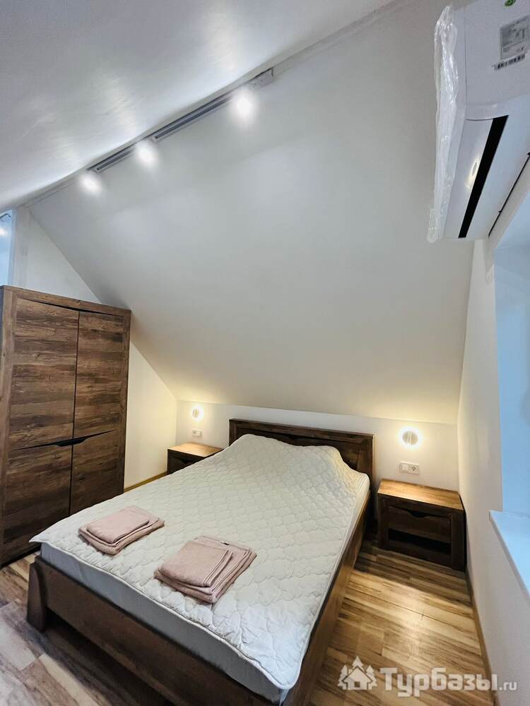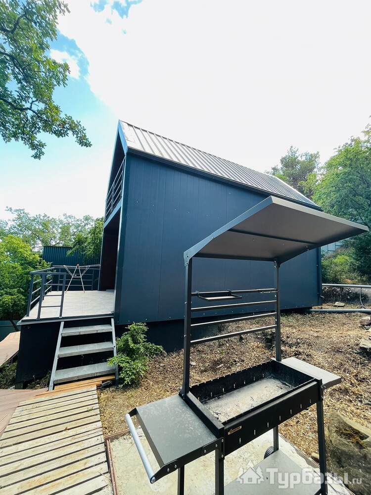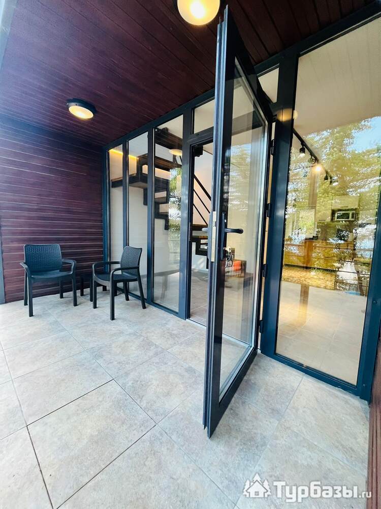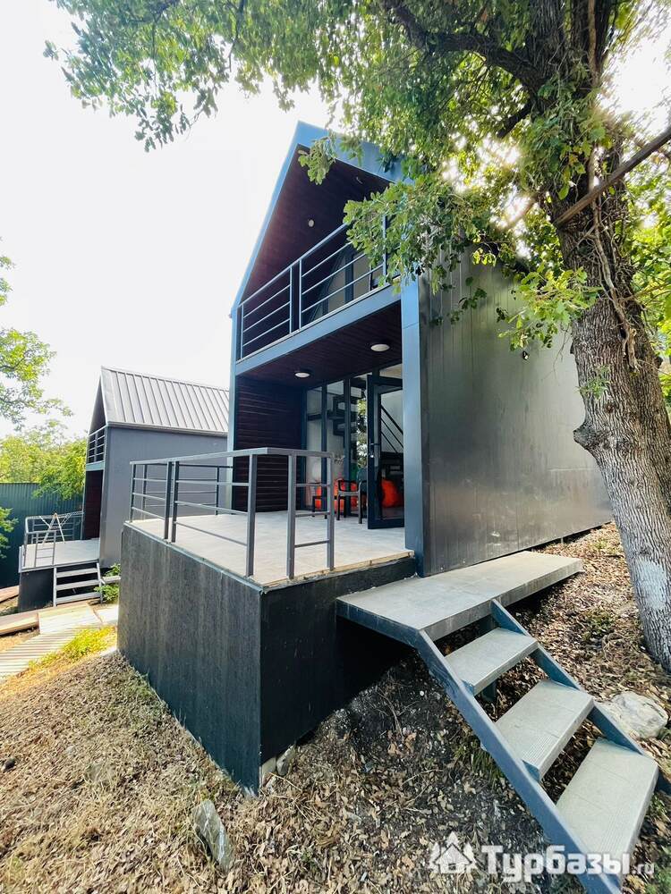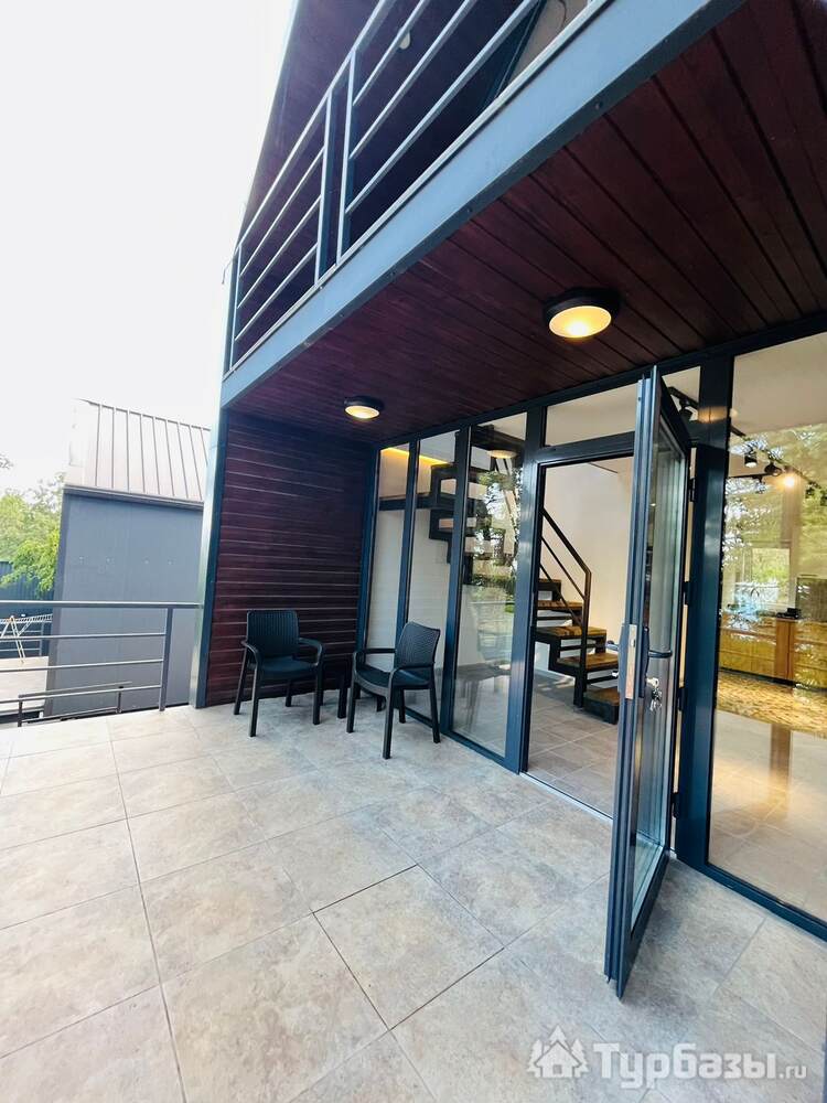 На территории расположен 2-х этажный домик с отдельным входом, широкими балконами на первом и втором этажах. Дом рассчитан на проживание до 4-х человек (2-х спальная кровать и два кресло-кровати). На первом этаже кухня-гостиная и санузел с душем. В домике новое оборудование, включая кофемашину.
