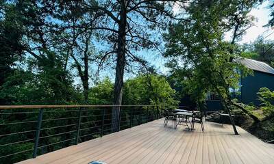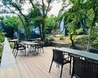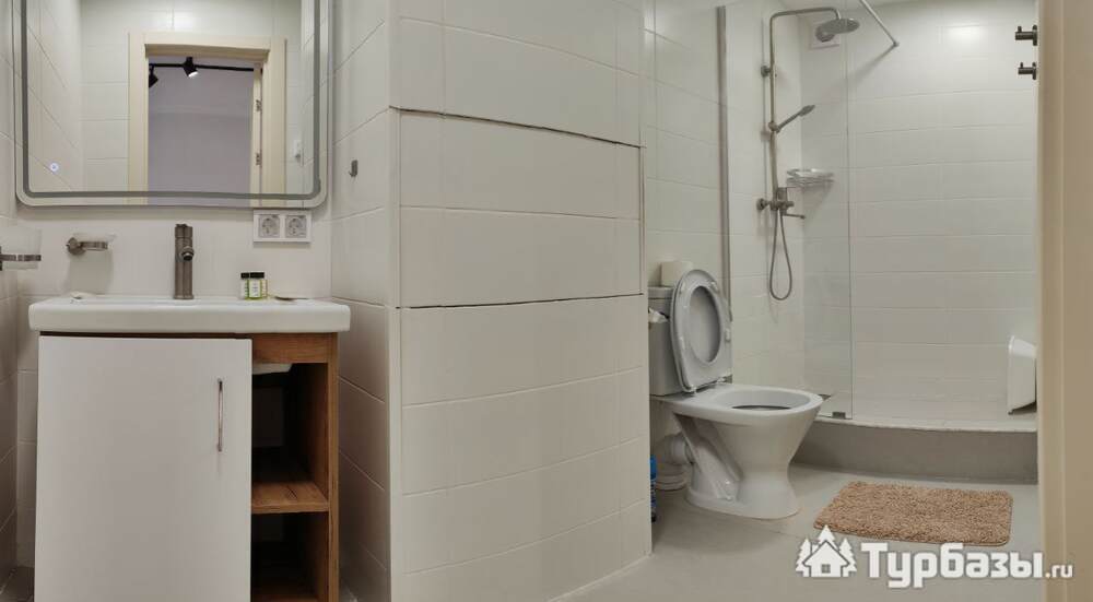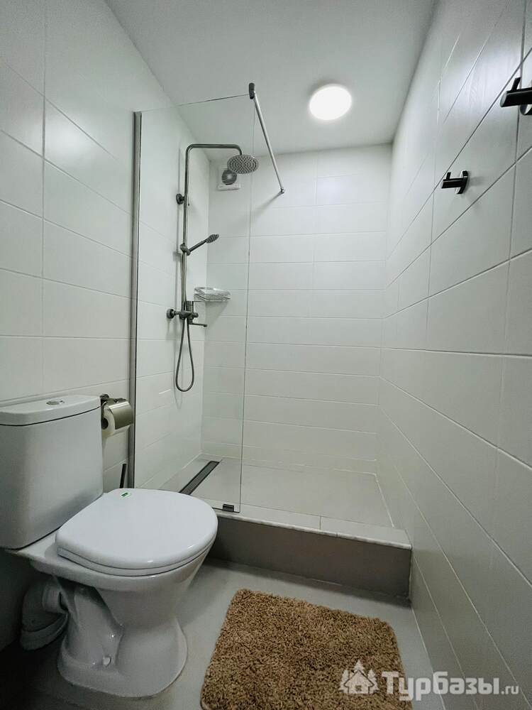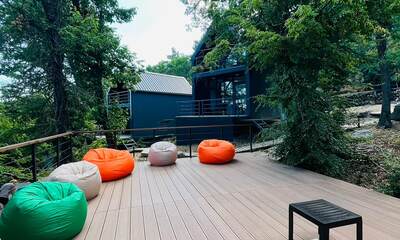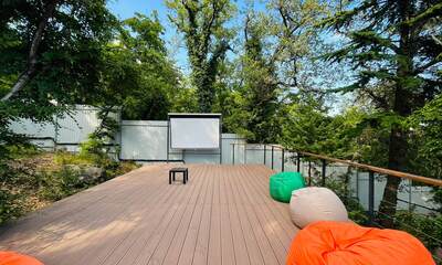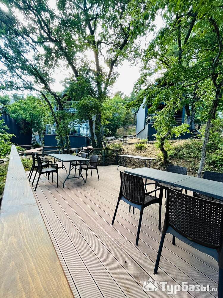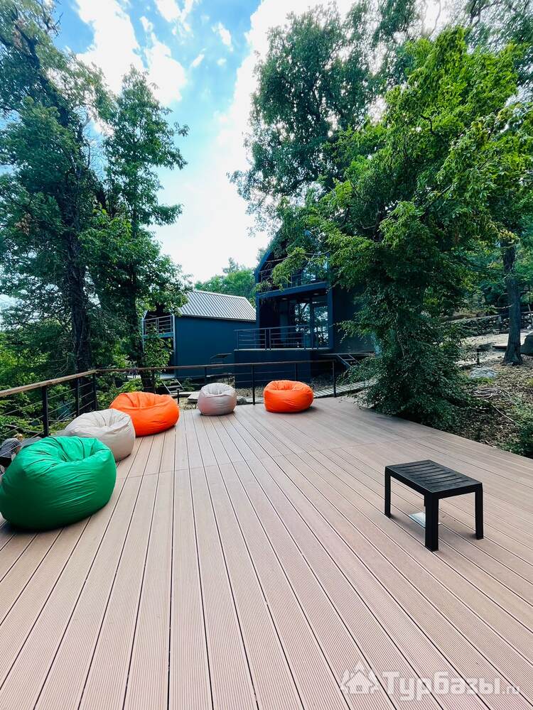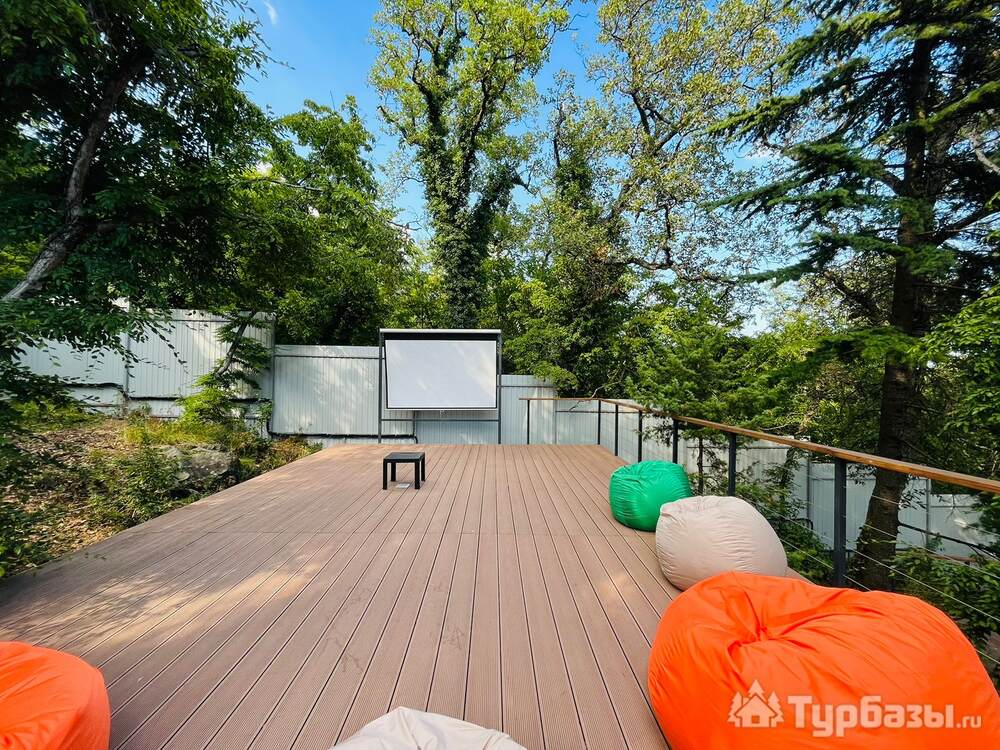 На территории обустроено несколько террас для комфортного отдыха. Верхняя терраса — летний кинотеатр с экраном и проектором и пуфами, внизу широкая терраса с купелью, столами, шезлонгами, ночным освещение для вечерних посиделок. Подразумевается совместное использование всеми гостями террас и доп. аксессуаров. Также имеется 2 мангала с шампурами и решетками для рыбы и казан. На территории расположено подсобное помещение со стиральной машиной, утюгом и гладильной доской.