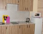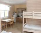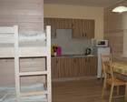 Двухэтажный дом с террасой и балконом на втором этаже. У каждых апартаментов отдельный вход с террасы/балкона. Апартаменты представляют собой квартиру студию площадь 30м2. В каждых апартаментах: кухня (плита, чайник, микроволновка, плита), санузел (туалет, душ), обеденный стол, две односпальный кровати и одна двухъярусная.