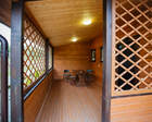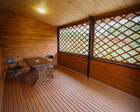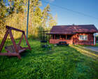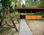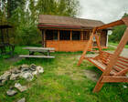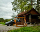 ● На улице — зона отдыха с мангалом, столом и деревянными качелями, летняя веранда.