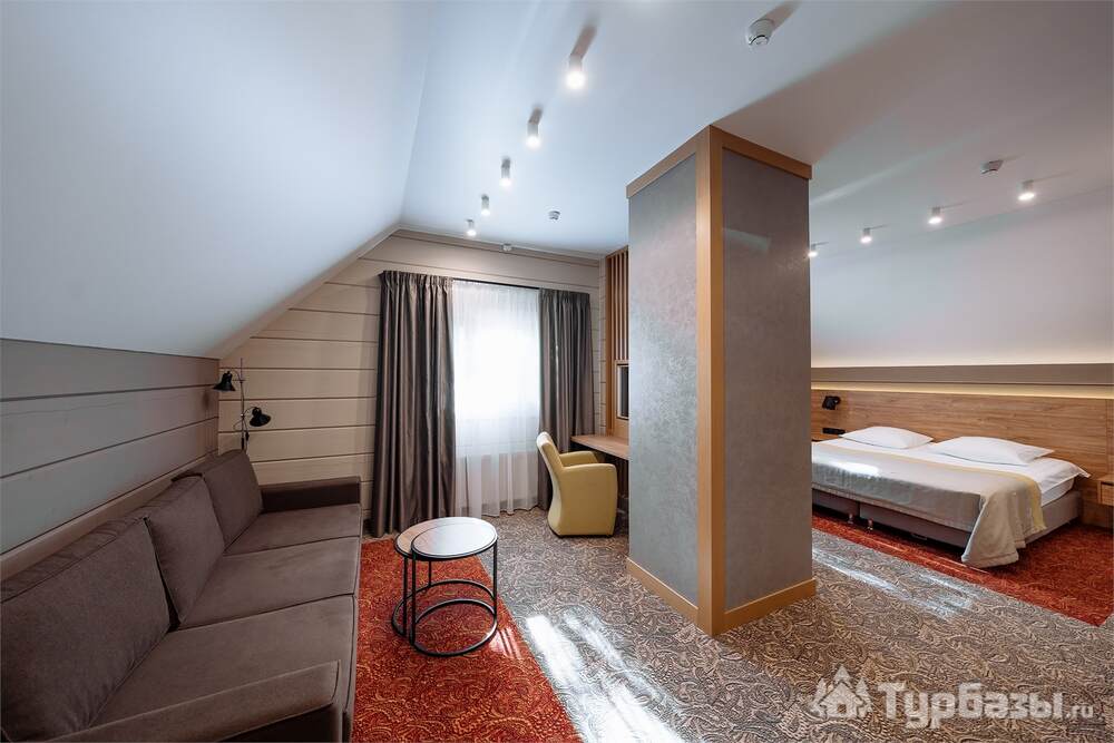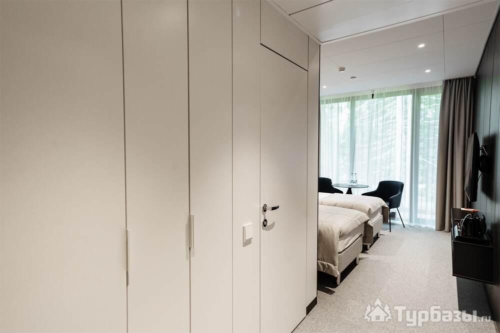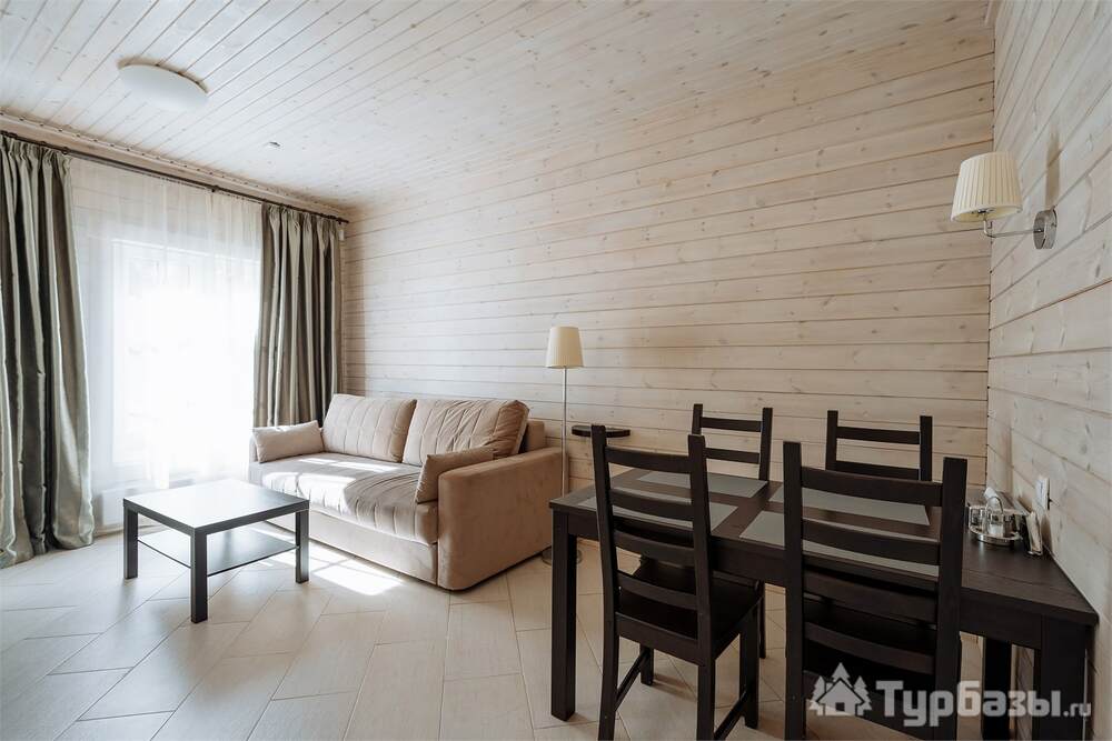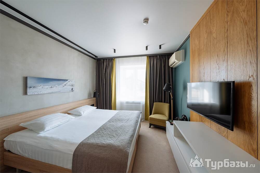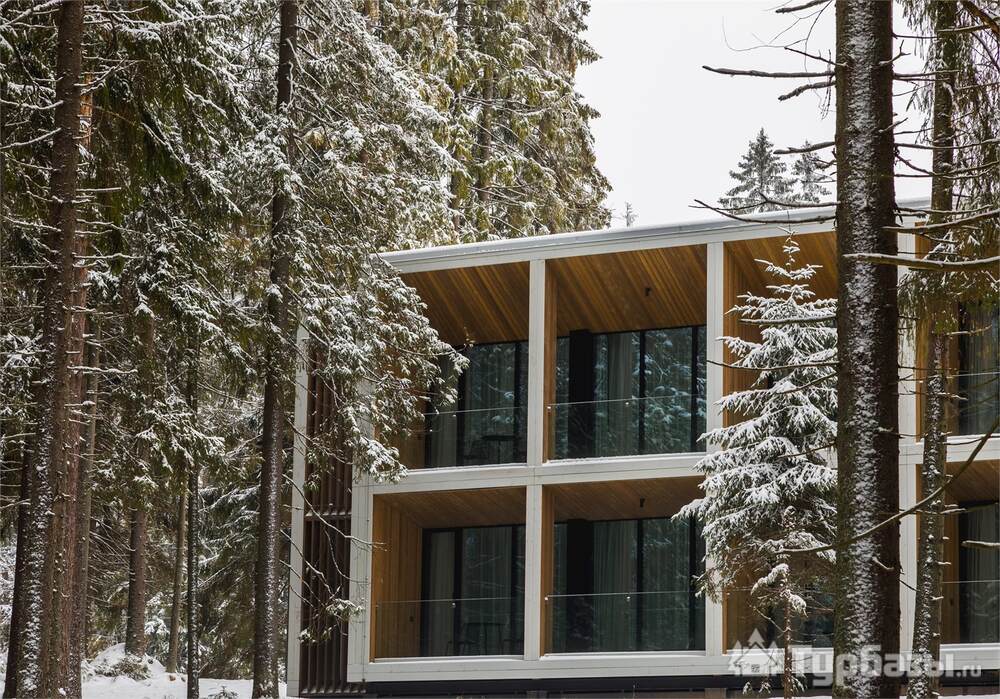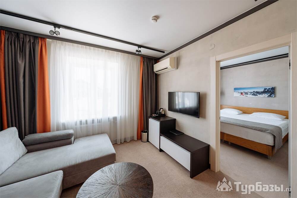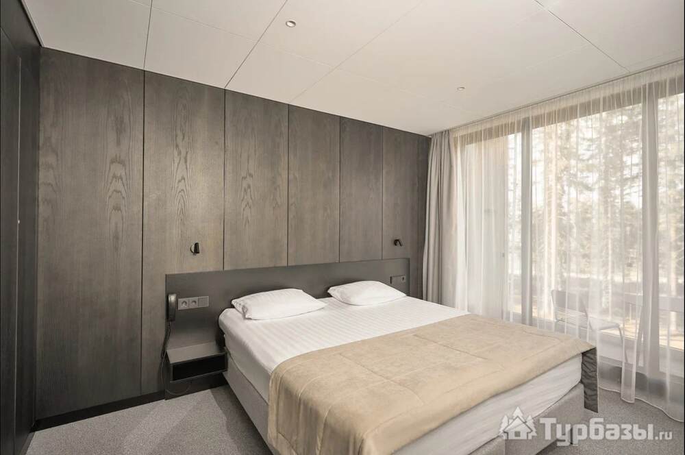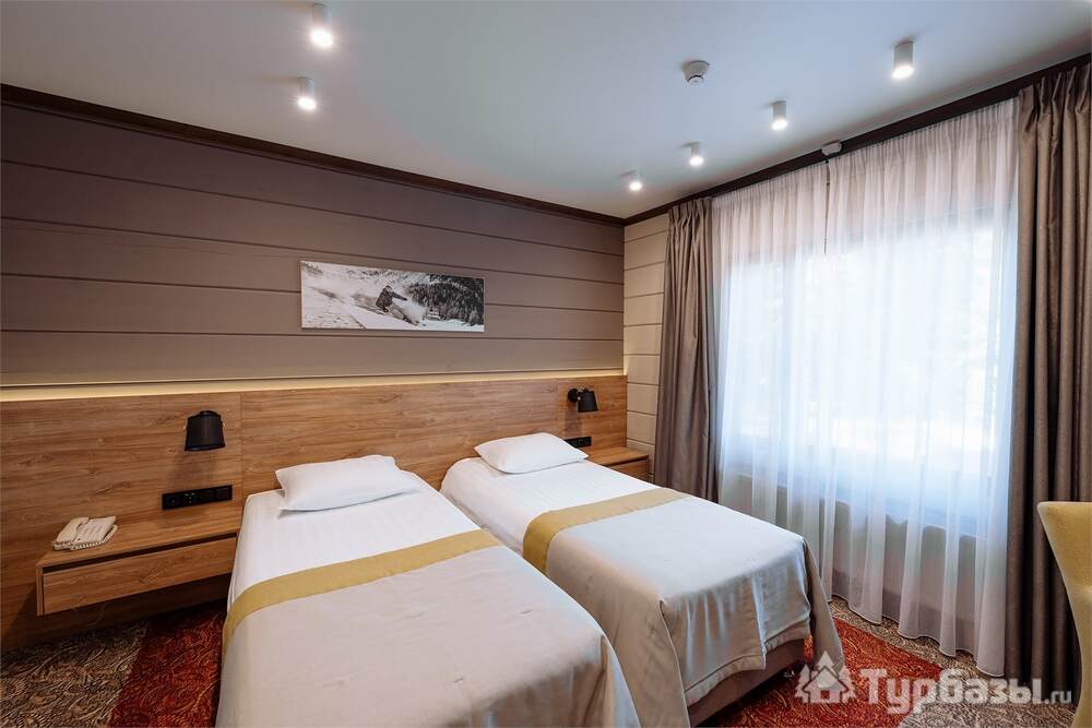 Проживание на курорте организовано в нескольких форматах — от классического отеля до апарт- и коттедж-зоны. Гостиничная часть предлагает стандартные номера и семейные апартаменты с видом на сосновый бор; отдельно выделены коттеджи и таунхаусы для тех, кто приезжает компаниями или на длительный отдых. Для быстрых спортивных заездов есть апарт-отель у подножия склонов — удобно добираться до трасс пешком или на шаттле.