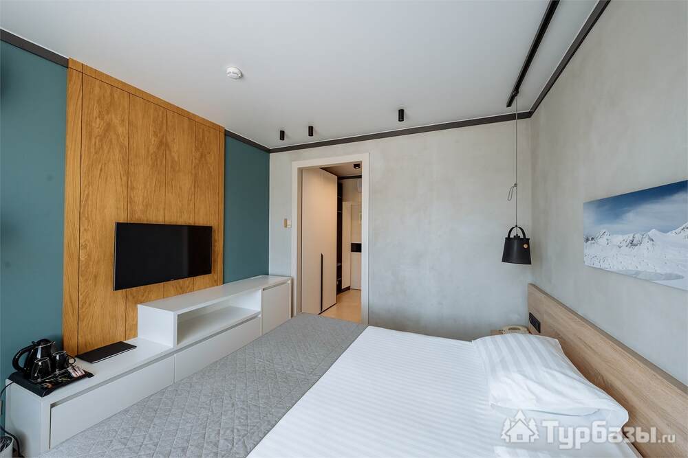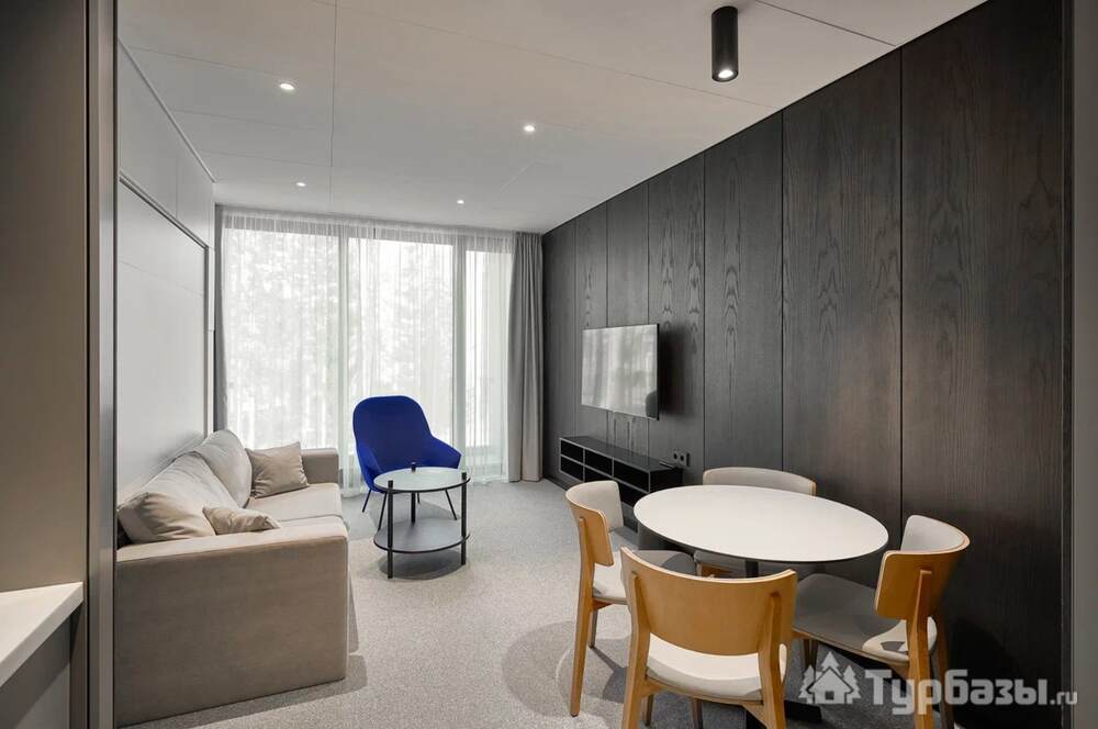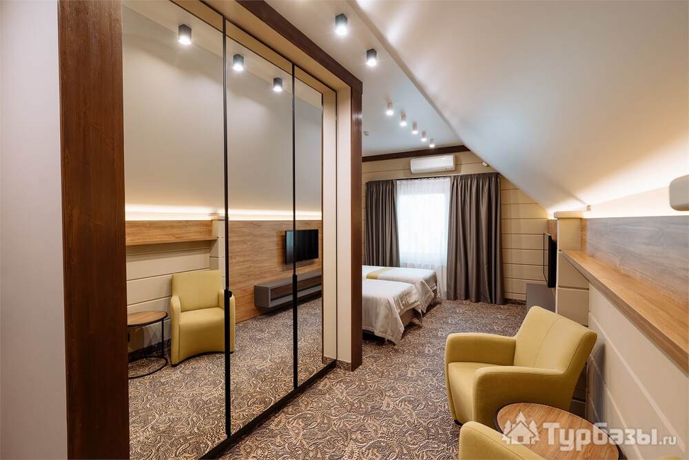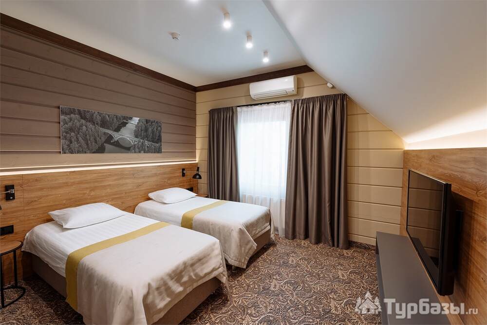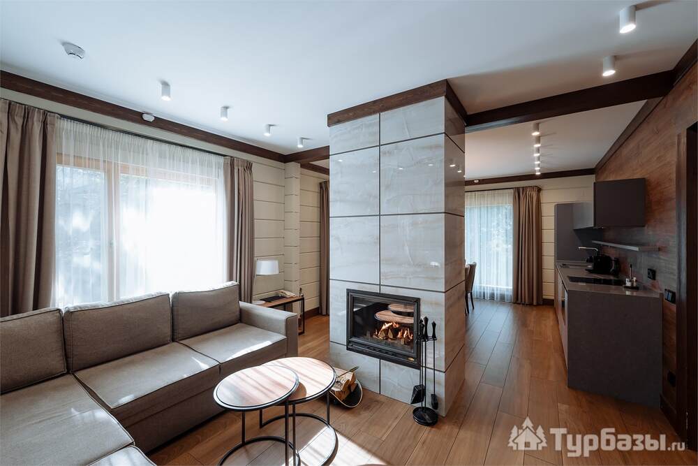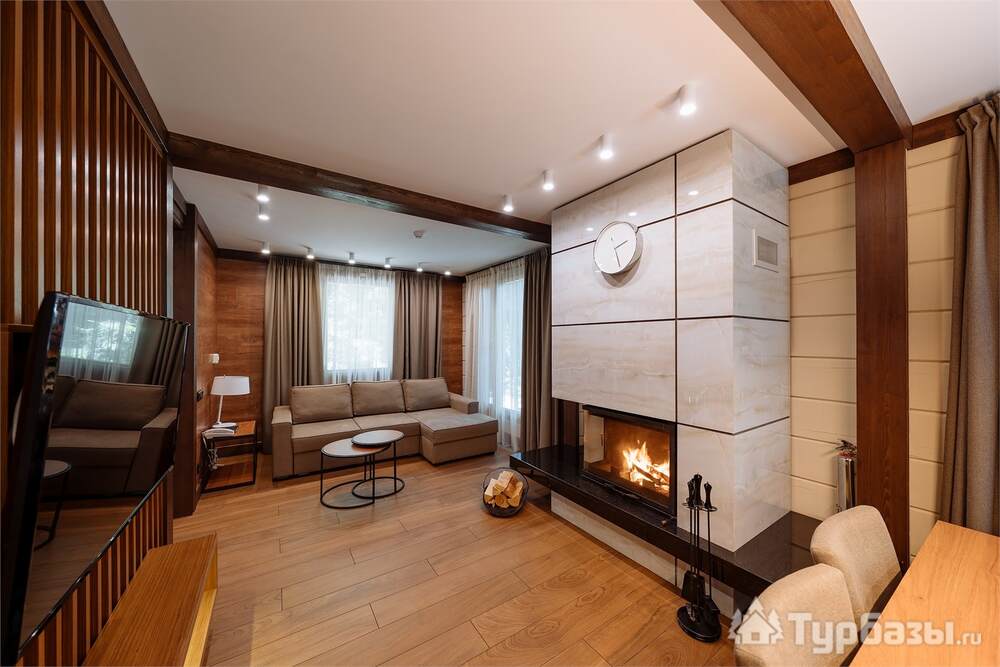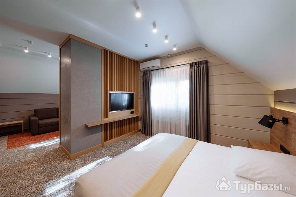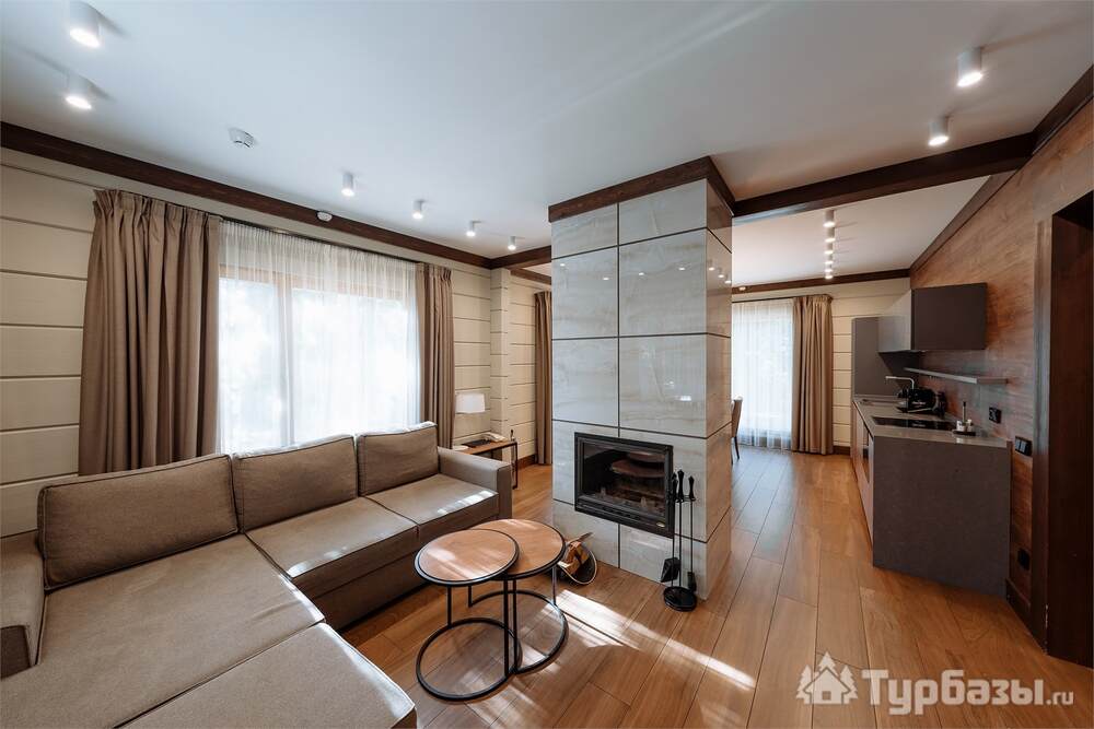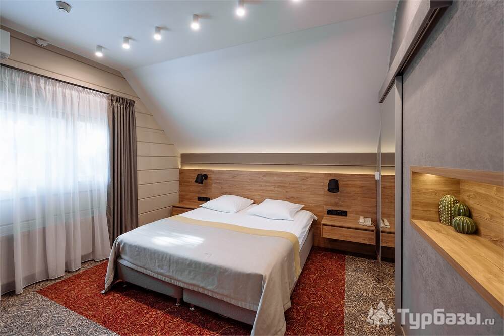 Проживание на курорте организовано в нескольких форматах — от классического отеля до апарт- и коттедж-зоны. Гостиничная часть предлагает стандартные номера и семейные апартаменты с видом на сосновый бор; отдельно выделены коттеджи и таунхаусы для тех, кто приезжает компаниями или на длительный отдых. Для быстрых спортивных заездов есть апарт-отель у подножия склонов — удобно добираться до трасс пешком или на шаттле.