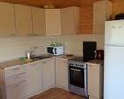 Двухэтажный коттедж. На 1 этаже находится прихожая, оборудованная кухня-гостиная с диваном и бытовой техникой, спальная комната с двумя полуторными кроватями, санузел с душевой кабиной и открытая терраса. На 2 этаже расположены две спальные комнаты, оборудованные собственными санузлами. В одной комнате установлена одна двуспальная, в другой – две полутороспальные кровати.