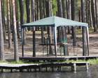 На озере находятся 4 деревянные беседки с окнами и дверьми, имеется стол и лавки, в комплект также входит мангал, имеется электричество. Перед беседкой расположен деревянный настил, где можно позагорать или поставить дополнительный стол. Беседка расположена в 20 метрах от берега.