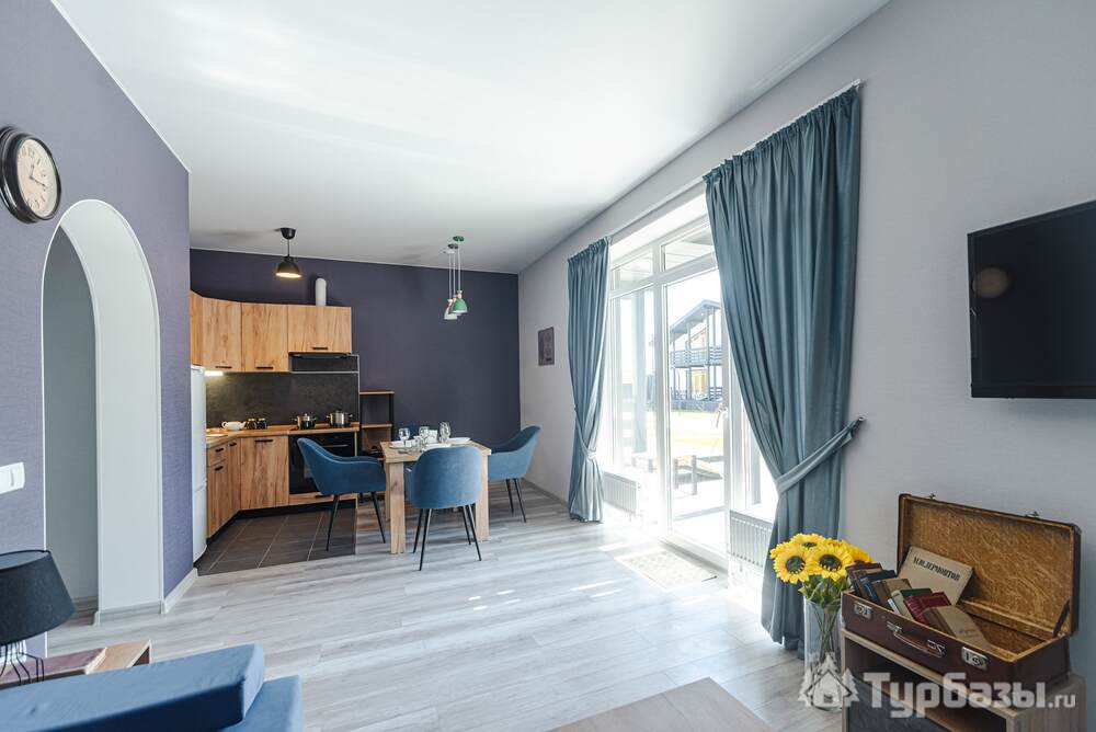 Комплекс состоит из набора отдельно стоящих коттеджей — 8–9 домов разной площади (стандартные домики ≈110 м², есть и расширенные варианты около 200 м²). Каждый коттедж спроектирован как семейный загородный дом: здесь несколько спален, просторная кухню-гостиная с выходом на террасу и два санузла в стандартном варианте. Номера и домики оборудованы всем необходимым для самостоятельного проживания — от кухонной техники до постельного белья и Wi-Fi; некоторые блоки оформлены тематически и носят названия классических российских писателей.