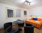 - гостиная со столом, удобными креслами, ЖК-телевизором 32" (спутниковое ТВ) и с большой двуспальной кроватью, которая при необходимости трансформируется в две раздельные кровати