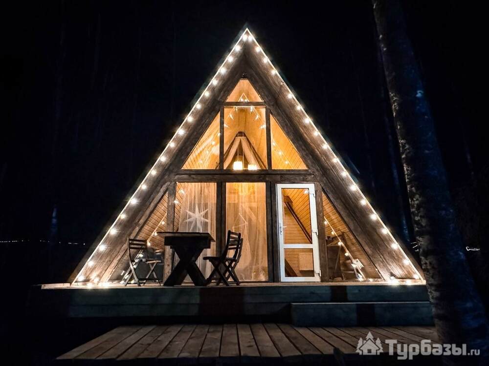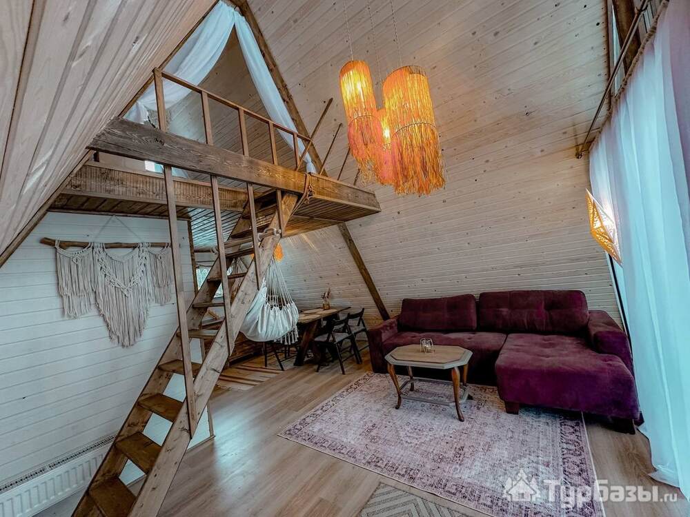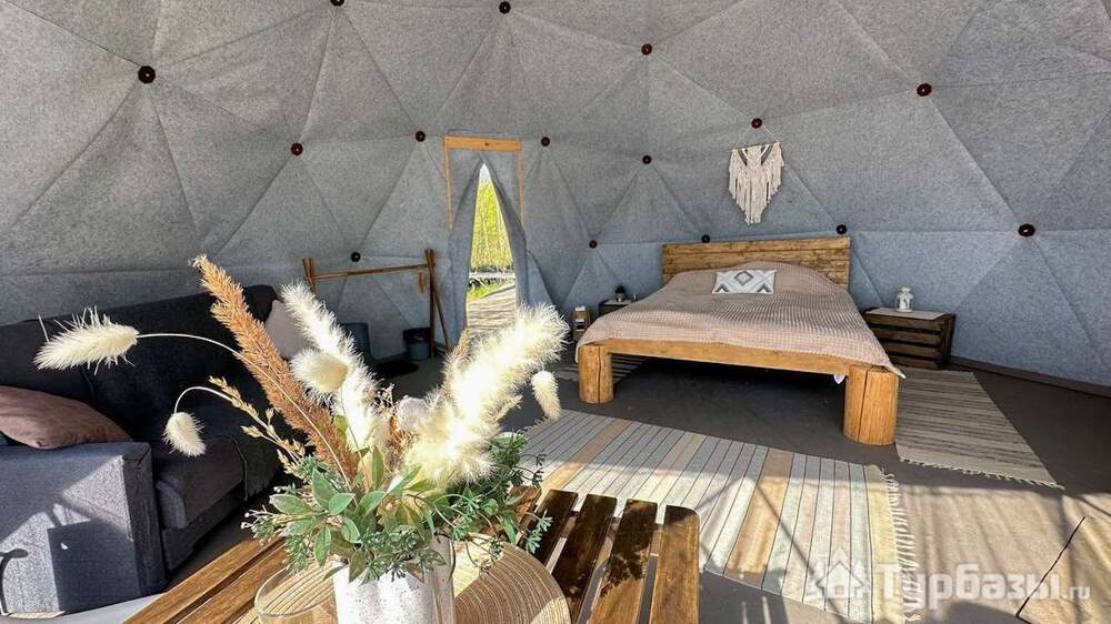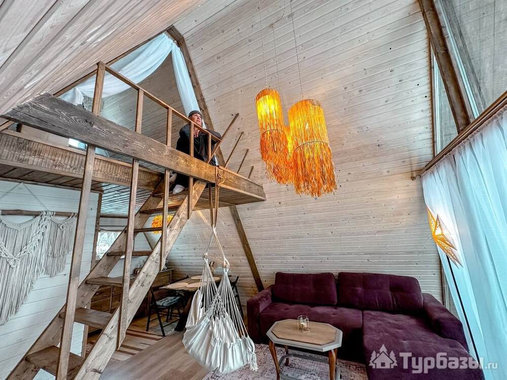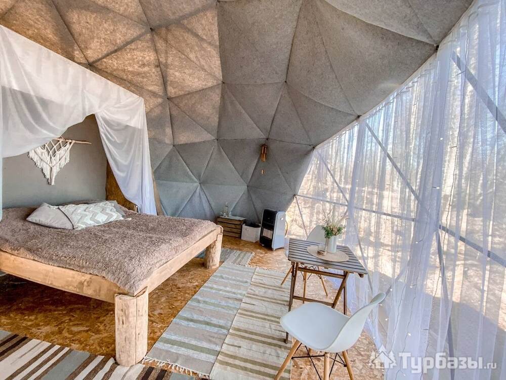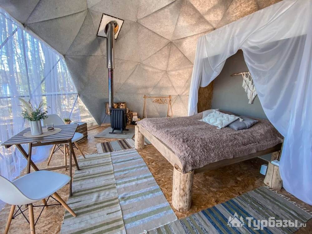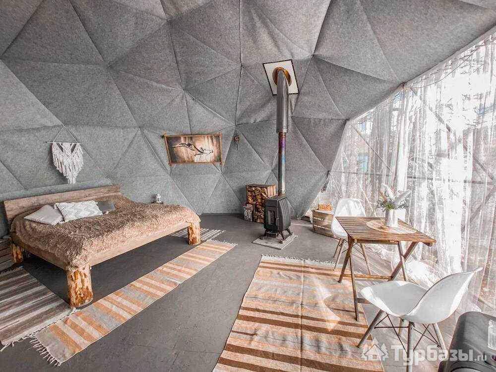 На территории представлены три основных формата жилья — A-Frame домики, safari-lodges и купольные «соты»/домики-сферы. Все юниты спроектированы для круглогодичного использования: тёплые полы, уютные спальни, террасы с видом на озеро и у многих — собственная лаунж-зона. Вместимость комплекса позволяет принять до ~45 гостей одновременно, поэтому объект хорошо подходит как для романтического отдыха, так и для небольших компаний.
