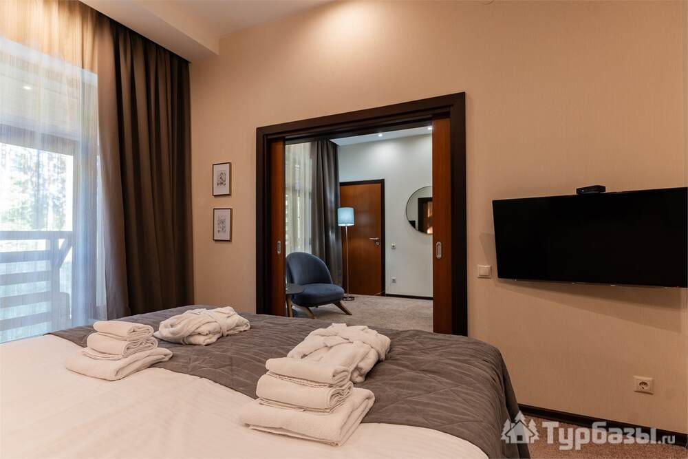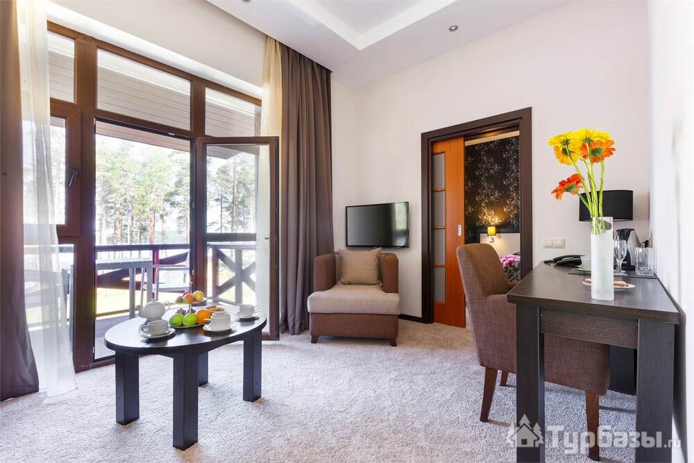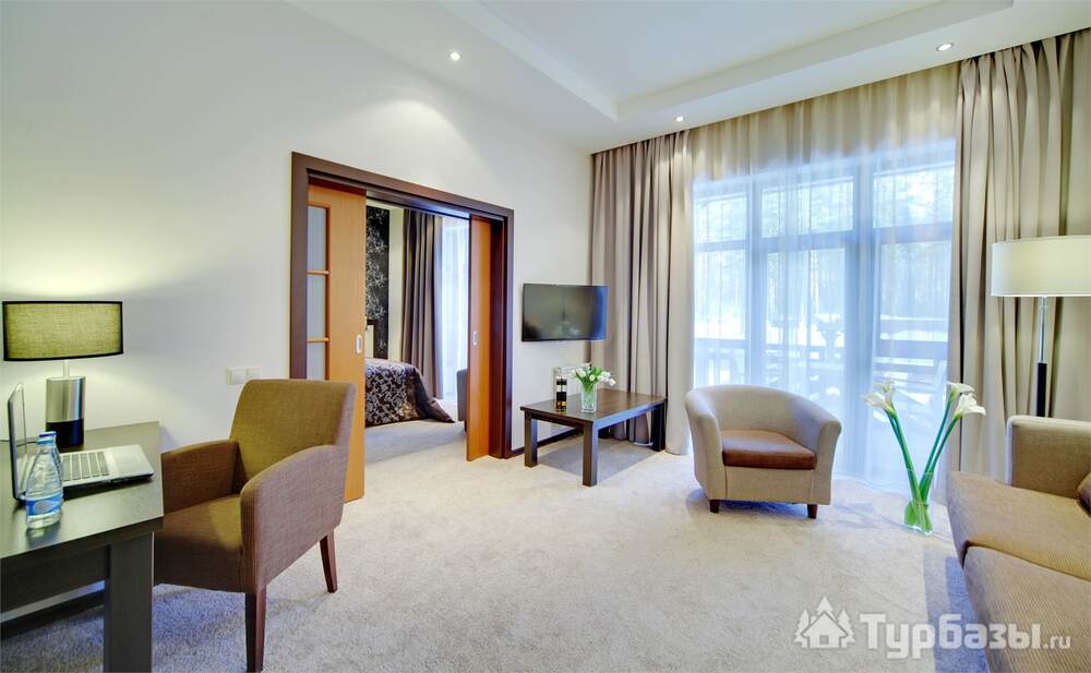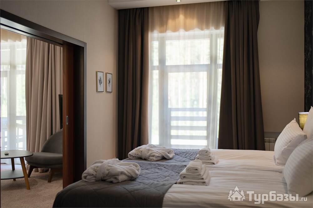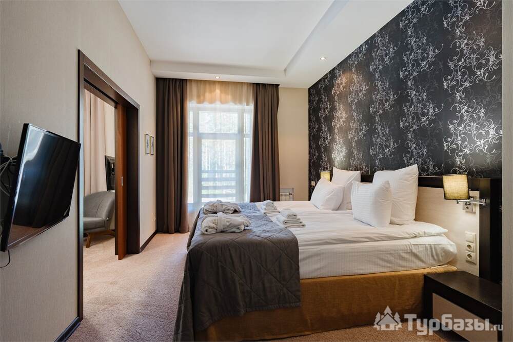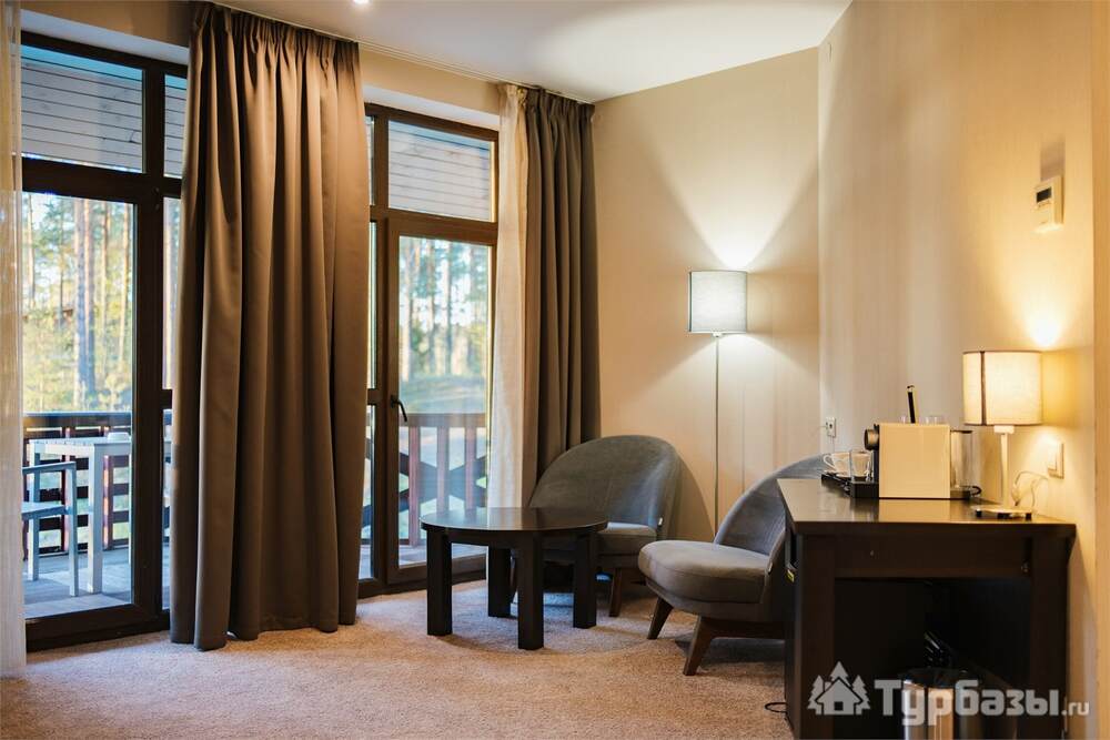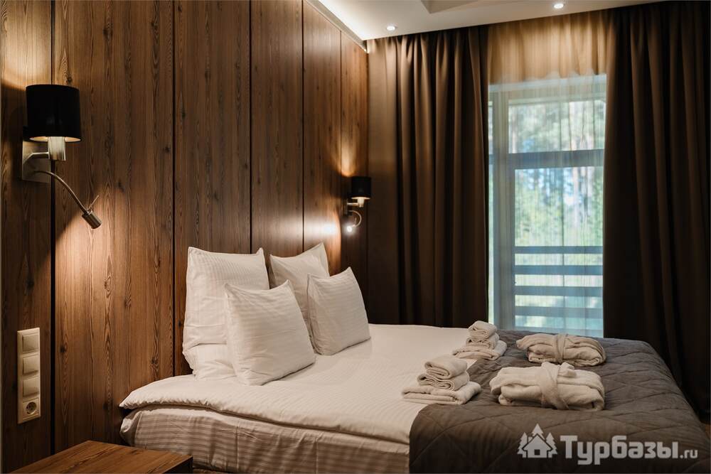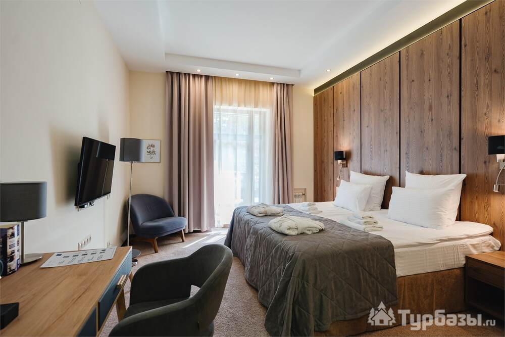Номерной фонд совмещает уют загородного отеля и комфорт современного курорта: стандартные номера, семейные апартаменты и улучшенные люксы с видом на озеро или на лес. Во всех номерах — качественные кровати, климат-контроль, набор для чай/кофе и беспроводной интернет; в ряде категорий есть балконы и увеличенная гостевая зона. Для тех, кто хочет приватности, отель предлагает номера с отдельными террасами и выходом к прогулочным дорожкам парка.