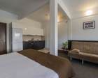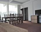 Коттедж сдается на 16 чел. Но можно его снять и на 6 чел. Это будет только первый этаж, полностью оборудованная кухня-столовая с двух- местным диваном и с двумя отдельными комнатами. В каждой комнате: двухспальная кровать (либо две односпальные), диван, трюмо, минихолодильник, шкаф, ТВ, душ, туалет.