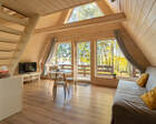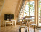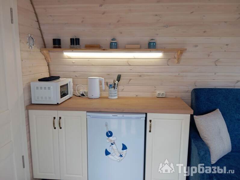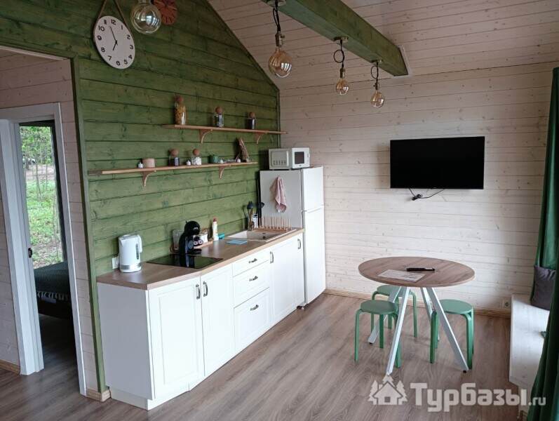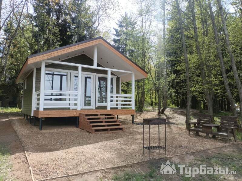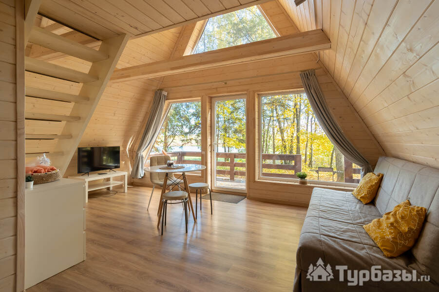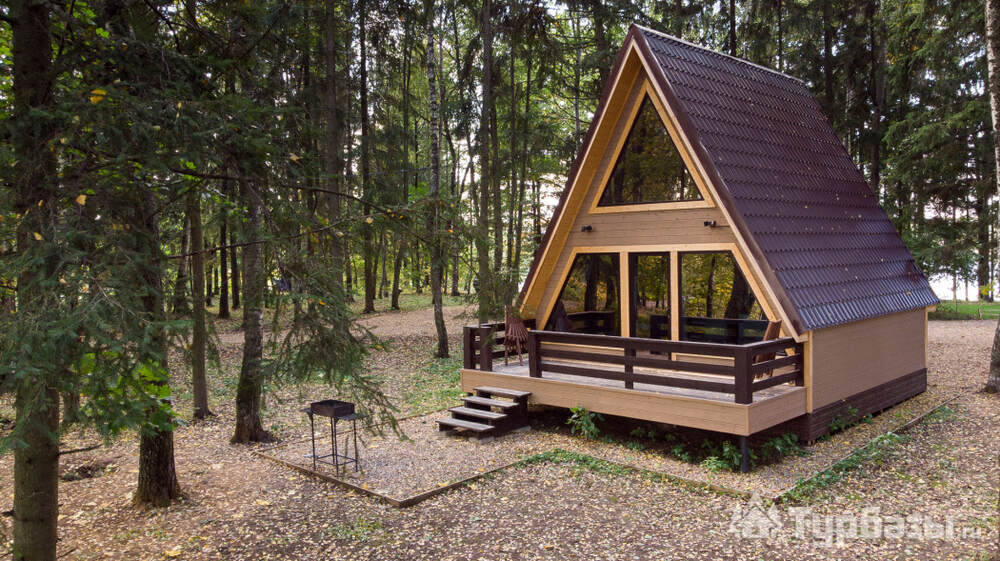 На базе — несколько типов домиков (одно- и двухэтажные, A-frame и эко-домики) с кухнями или мини-кухнями, террасами и панорамными окнами; рядом — парковка и оборудованные места для барбекю. Для любителей парной действует баня у воды (аренда возможна поминутно/по сеансам). Готовят и завтраки по заказу.