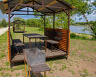 Здесь можно арендовать беседку на берегу, баню-бочку, летнюю площадку с купольной беседкой, а также всё, что нужно для праздника на природе.