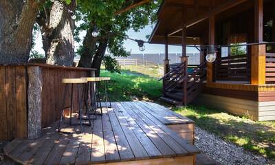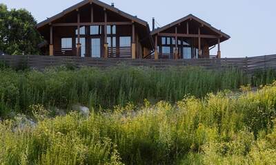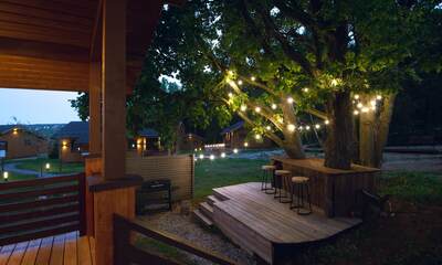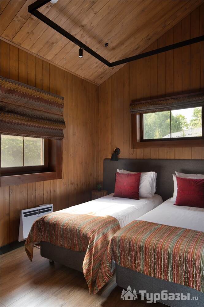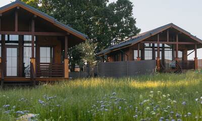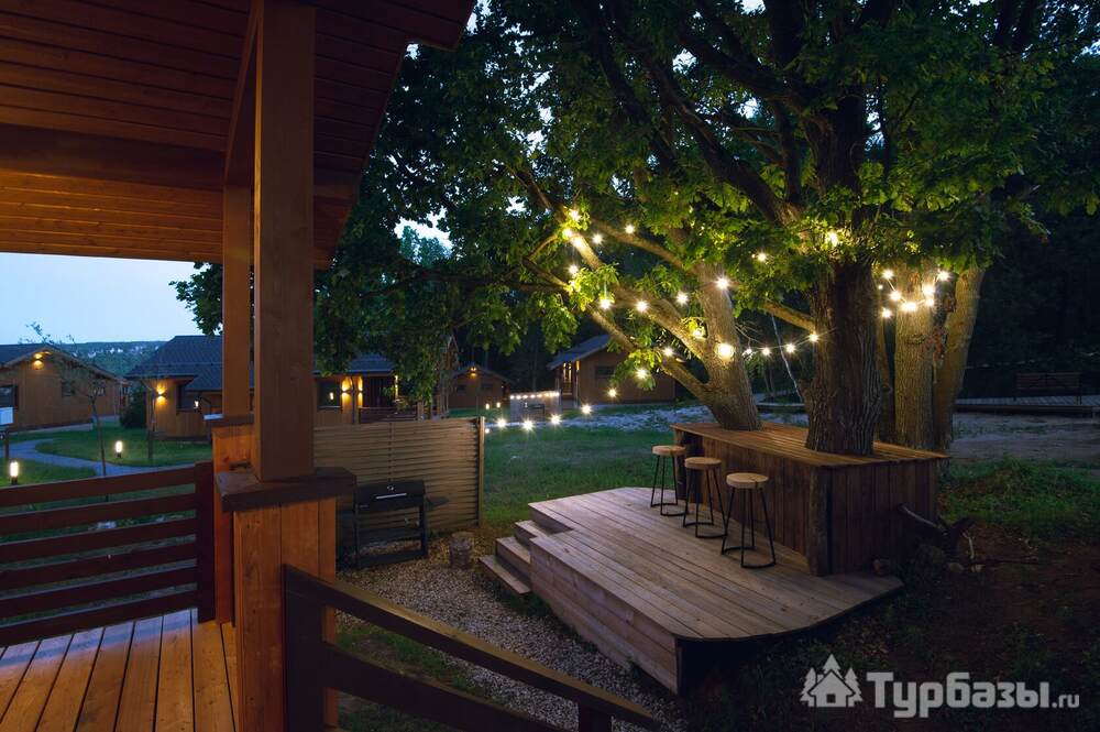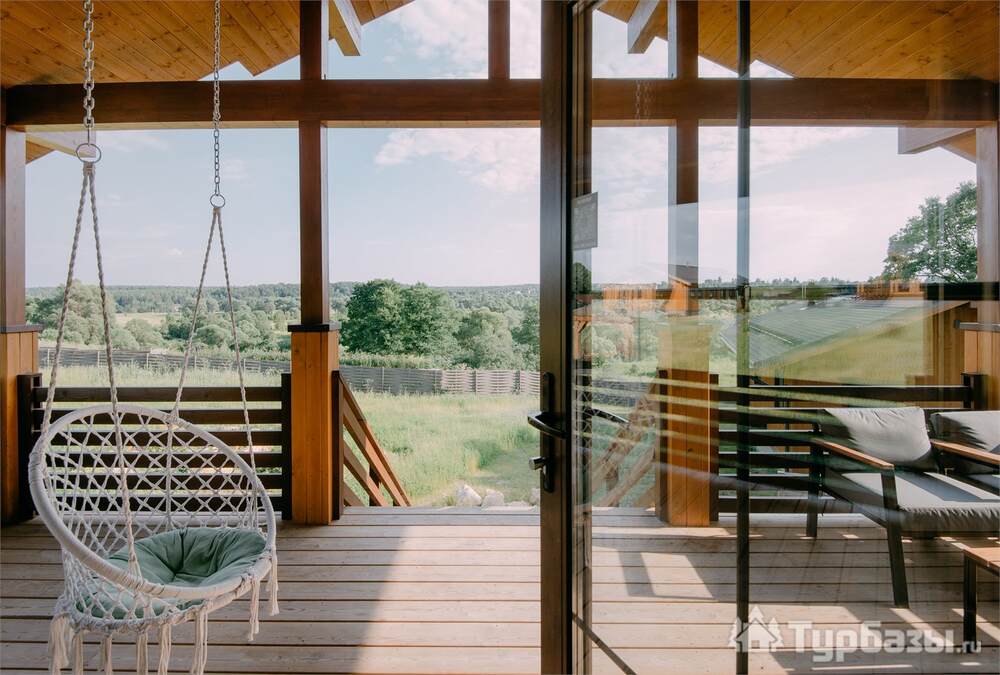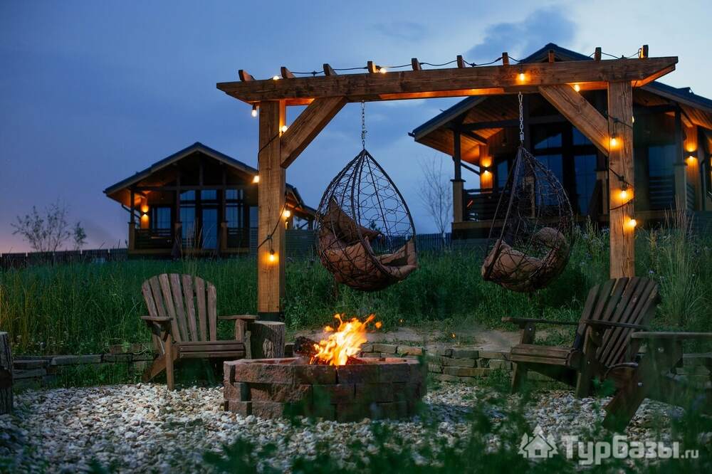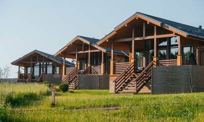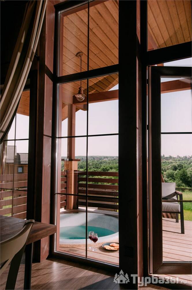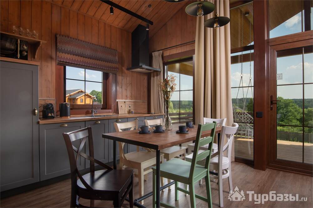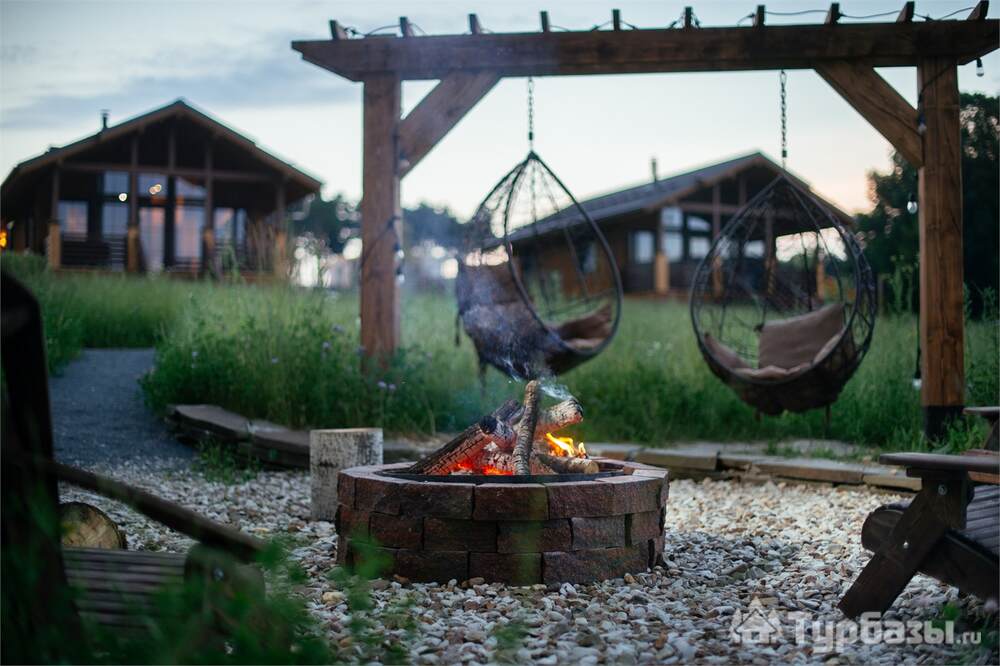 Гостей ждут стильные эко-лоджи с панорамными окнами и просторными террасами. Каждый домик оборудован камином, мини-кухней и зоной для отдыха на воздухе. Варианты размещения разные: от компактных коттеджей для двоих до просторных семейных домов с купелью или панорамной ванной.