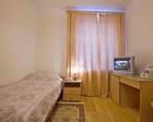 Номер площадью 8 м2, состоящий из спальни с одной односпальной кроватью, раковиной с горячей и холодной водой, санузла с ванной или душевой кабинкой на этаже. В номере: телевизор, набор полотенец.