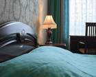 Номер находится в мансардной части здания. В нем есть все необходимое для отдыха: бытовая техника, посуда, журнальный столик и два кресла, шкаф для одежды, двуспальная кровать, прикроватный коврик и тумбочка.