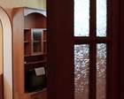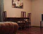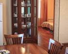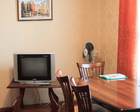 Гостиная представляет собой светлую комнату с телевизором, уютным диваном для отдыха, большим обеденным столом со стульями, буфет для посуды и столовым сервизом.