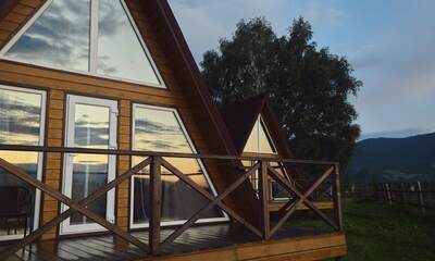 Трёхугольные домики А-фрейм — настоящая фишка «Поляны Алтай». Их форма напоминает палатки, но внутри вы получите полноценный комфорт: простор, панорамные окна, много света и свежего воздуха. Каждый дом рассчитан на 1–4 человека, оснащён кухней со всеми необходимыми приборами и уютной обеденной зоной.