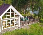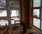 Первый этаж оборудован под кухню. Здесь есть холодильник, посуда и другой инвентарь. Так же здесь расположена гостиная с камином, душ и туалет. Возле камина установлена удобная мягкая мебель для отдыха. Из огромных панорамных окон открывается прекрасная панорама на озеро.