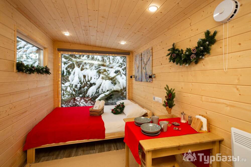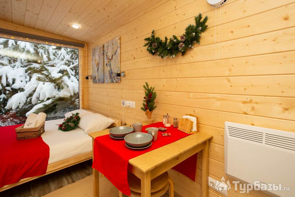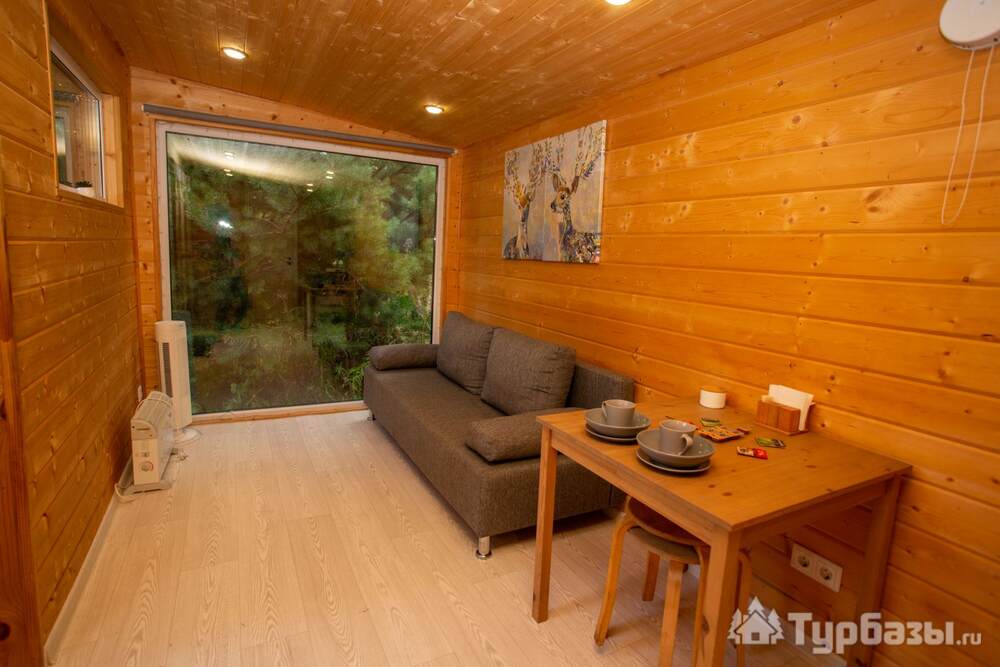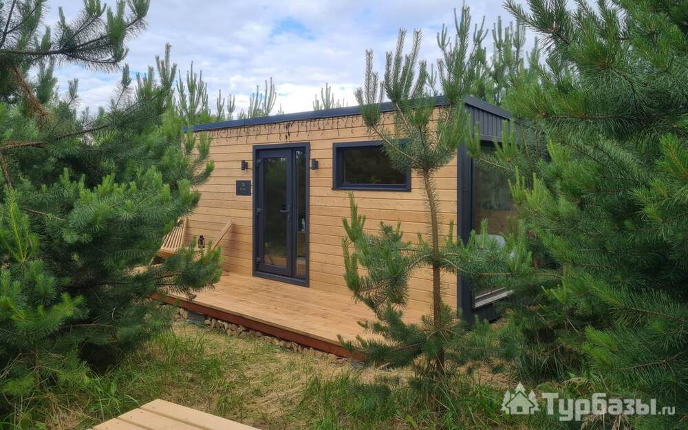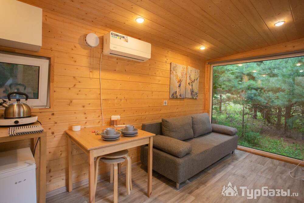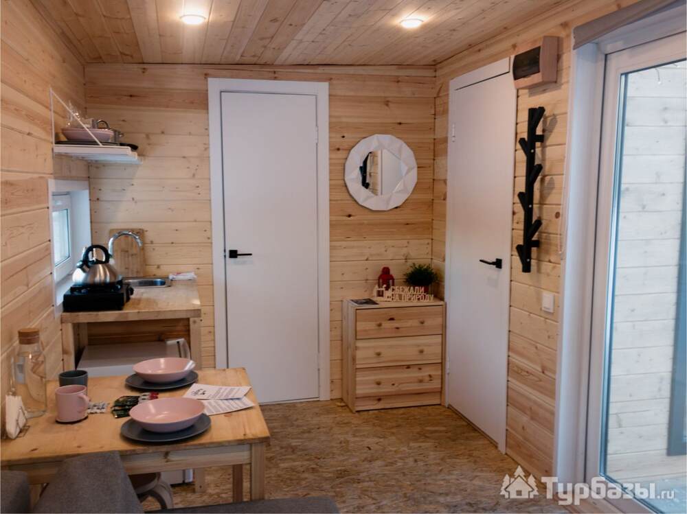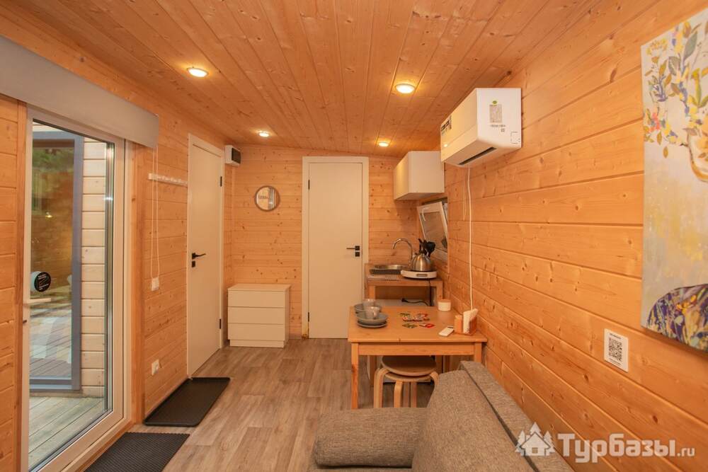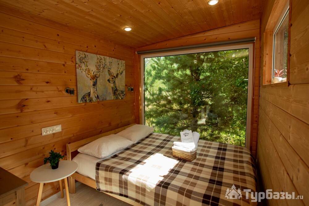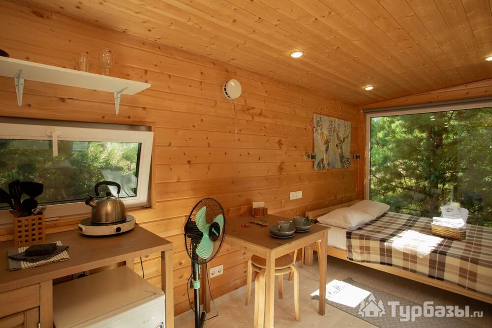 На базе — серия компактных «скандинавских» домиков (одно- и двухмодульные форматы): каждое жильё имеет отделку из дерева, с кухонным уголком, двуспальной кроватью и панорамным окном, через которое видна лесная полянка. Интерьеры тёплые и минималистичные — хороши для пар и небольших семей.