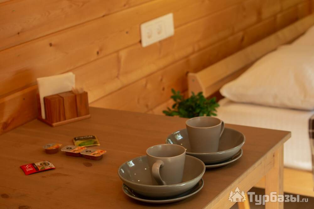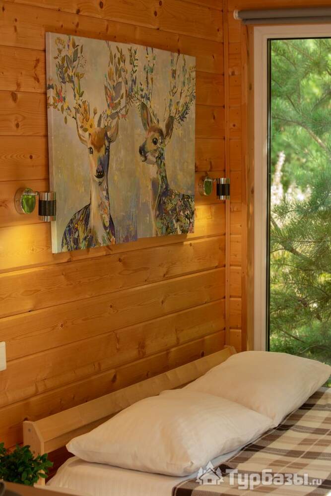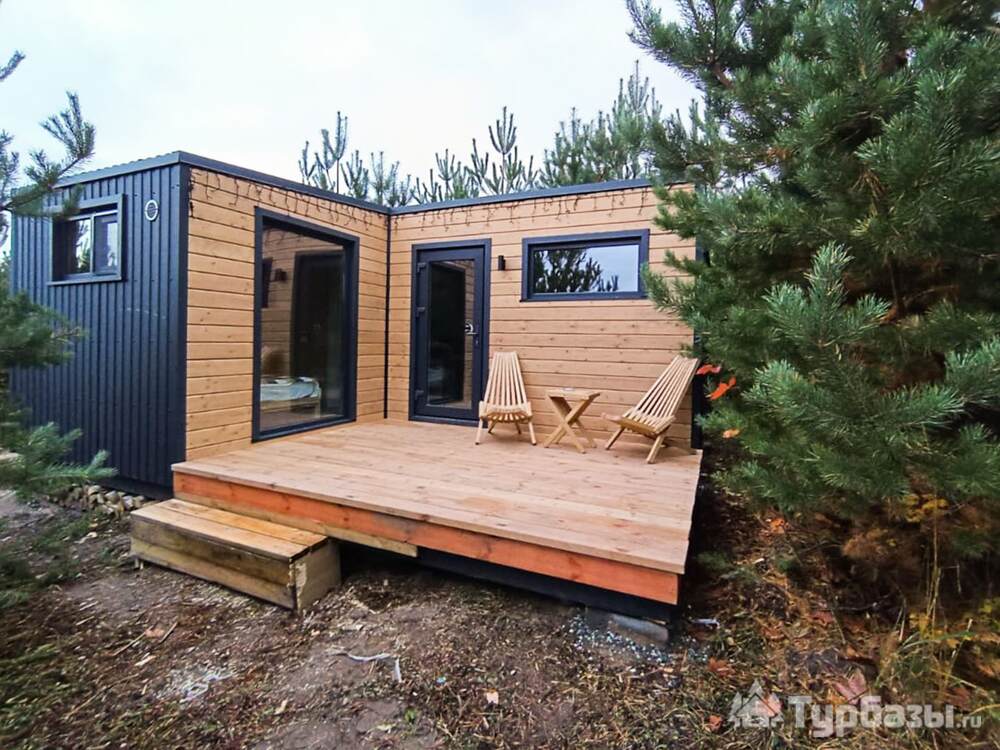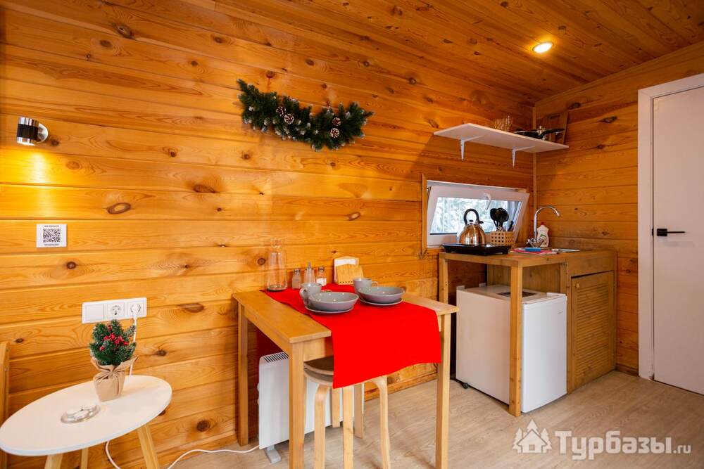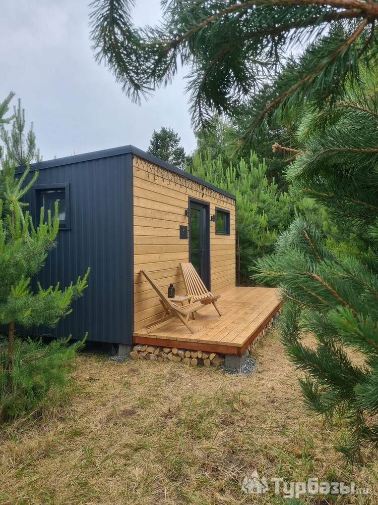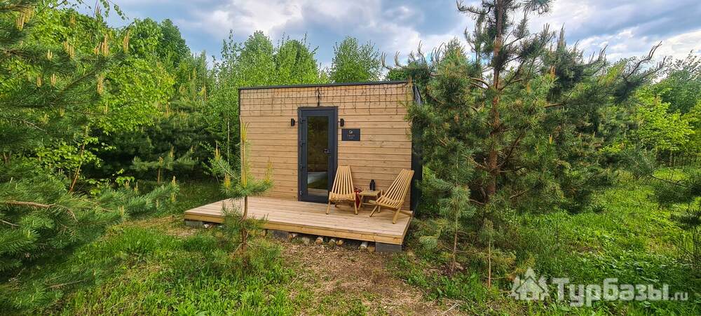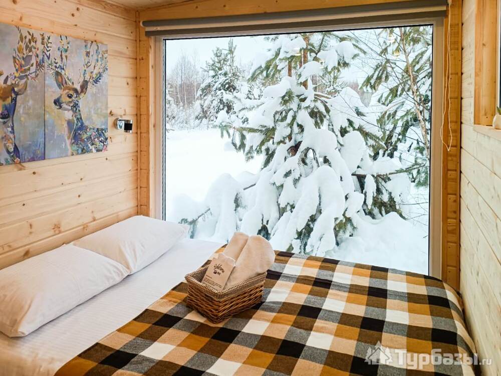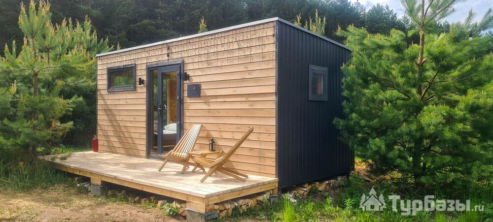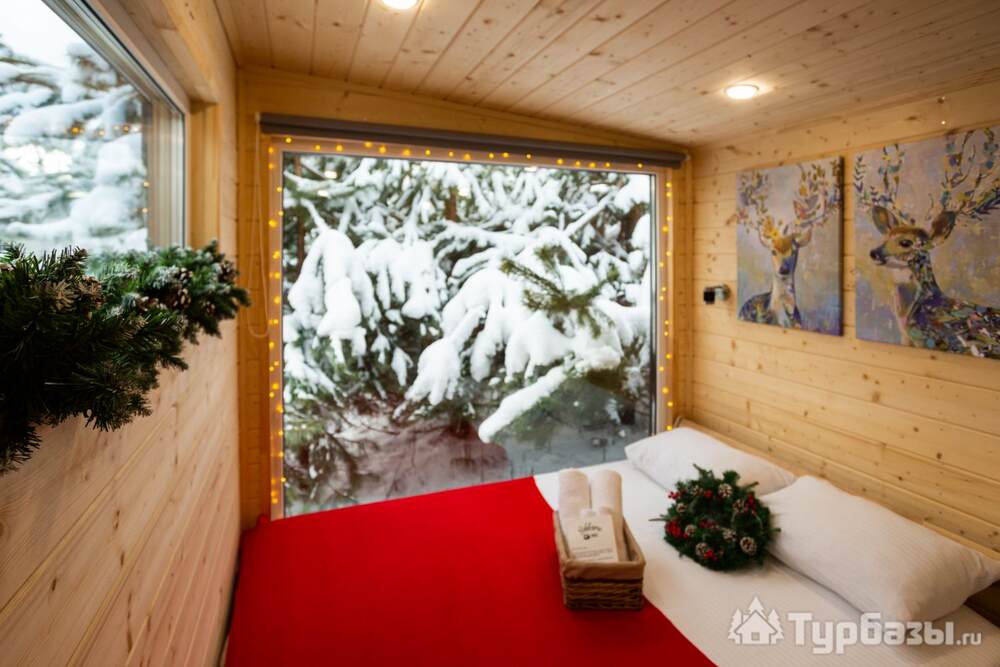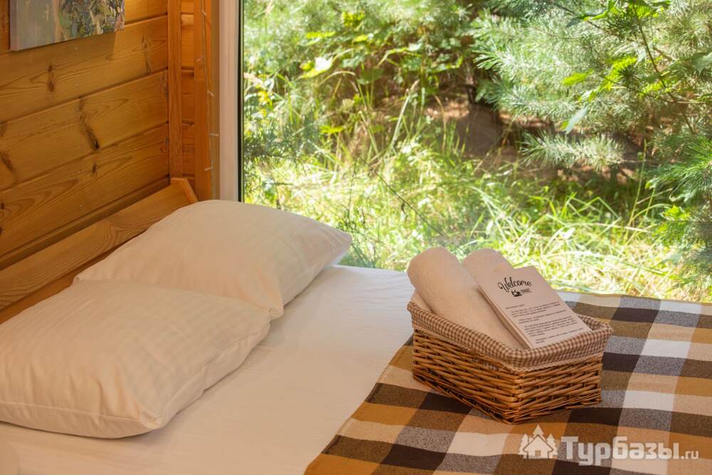На базе — серия компактных «скандинавских» домиков (одно- и двухмодульные форматы): каждое жильё имеет отделку из дерева, с кухонным уголком, двуспальной кроватью и панорамным окном, через которое видна лесная полянка. Интерьеры тёплые и минималистичные — хороши для пар и небольших семей.