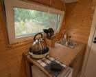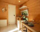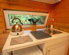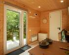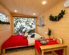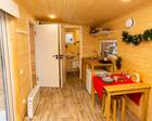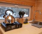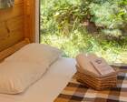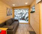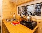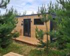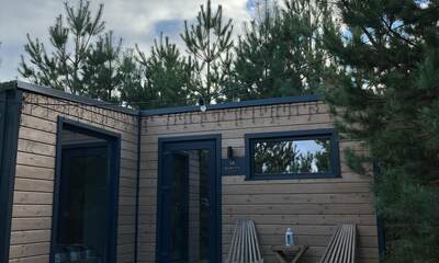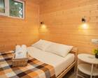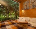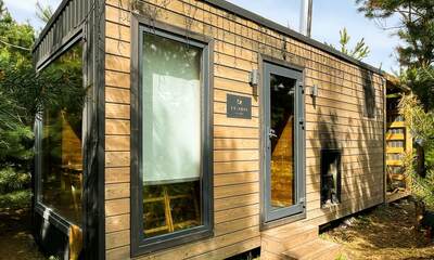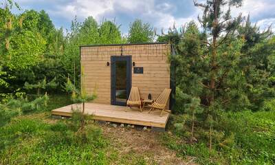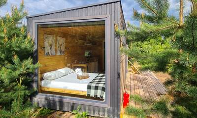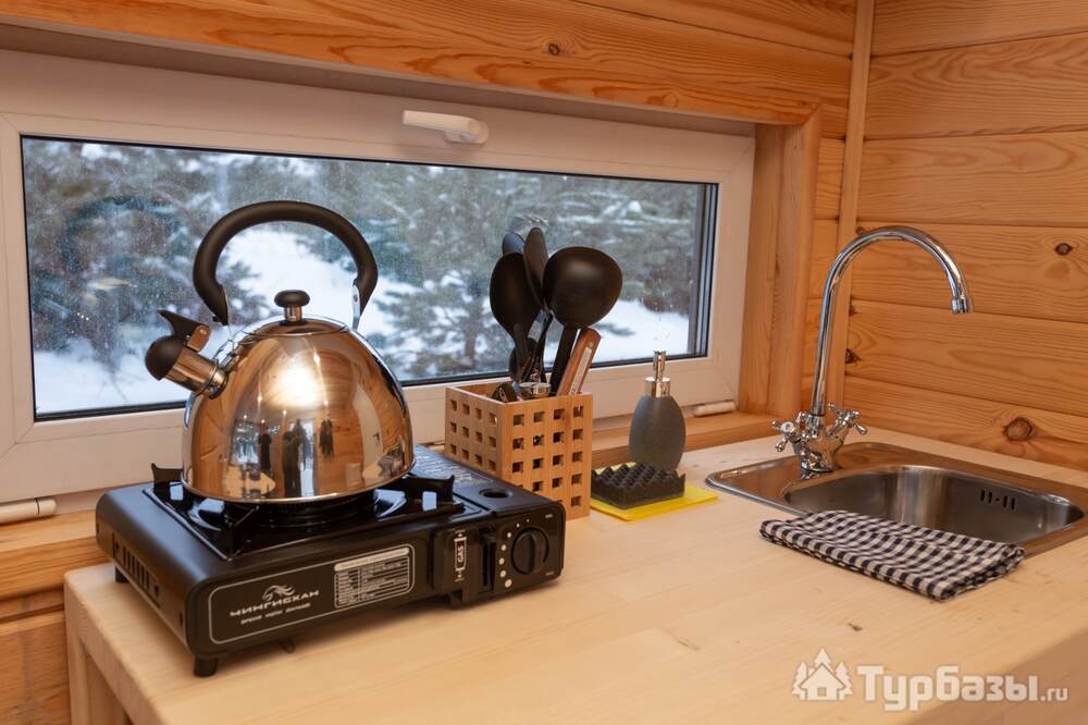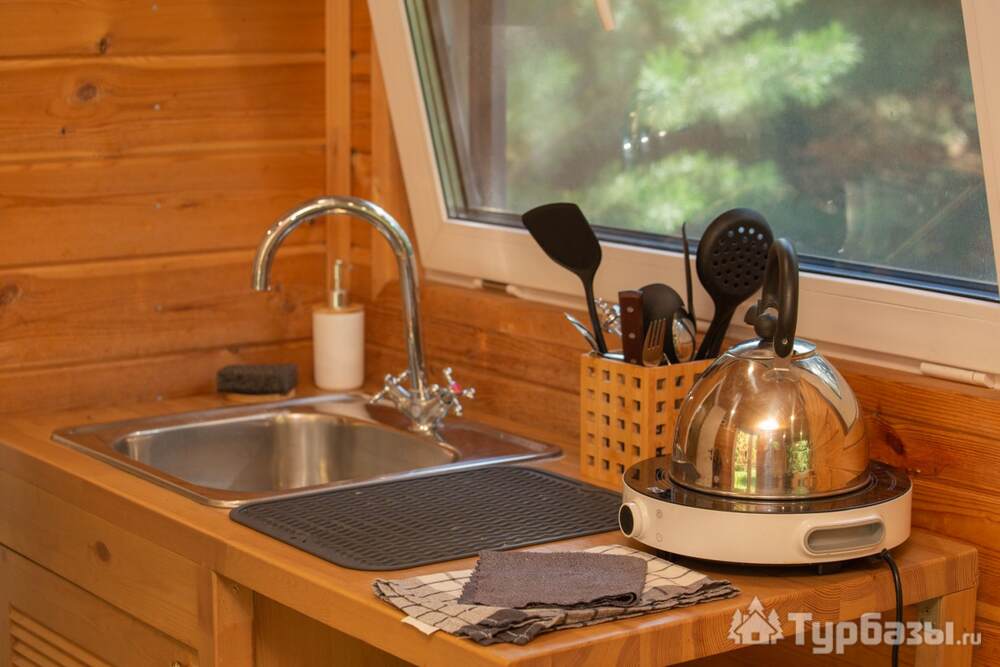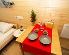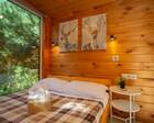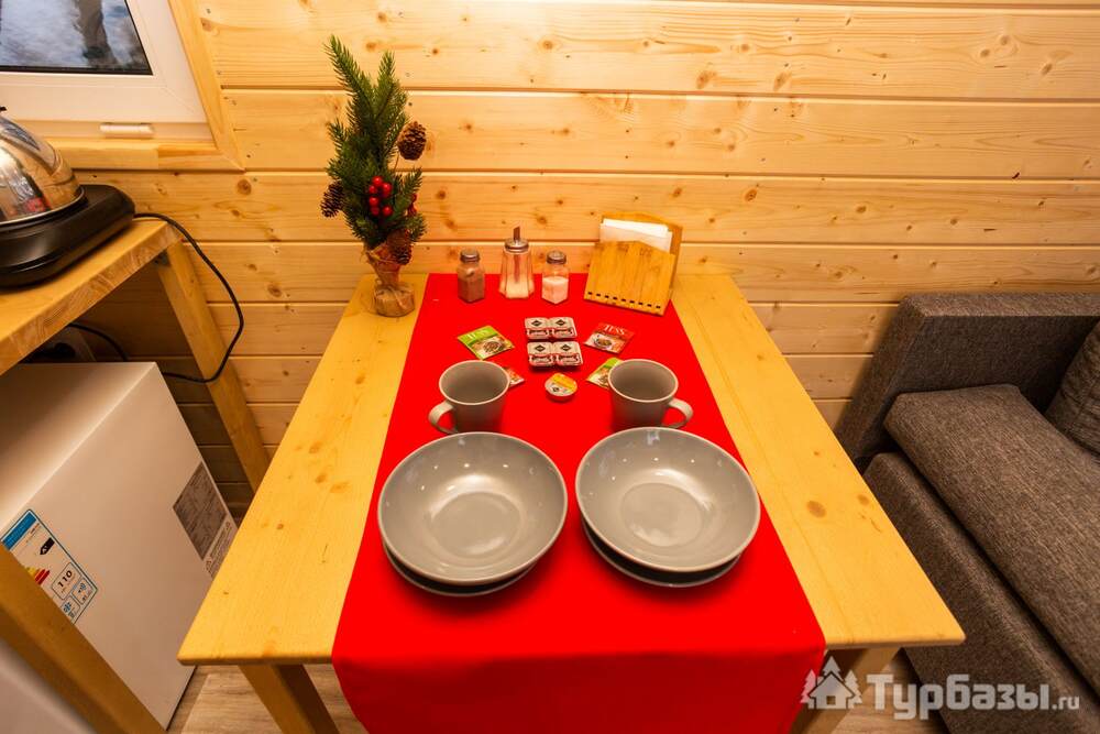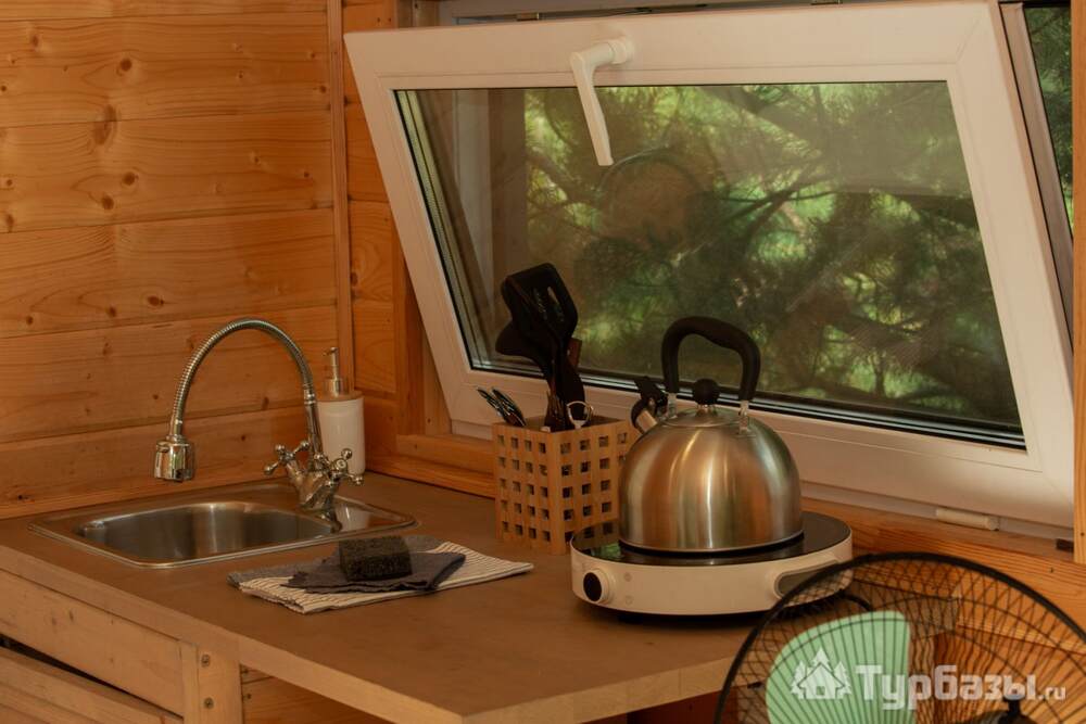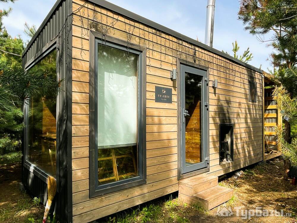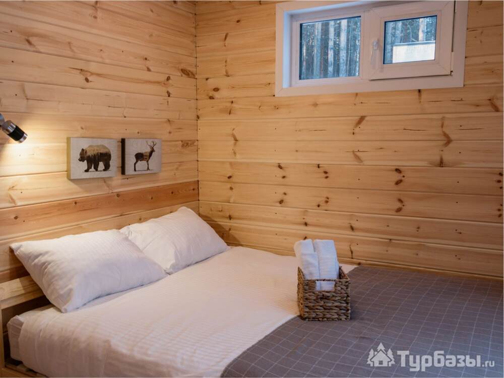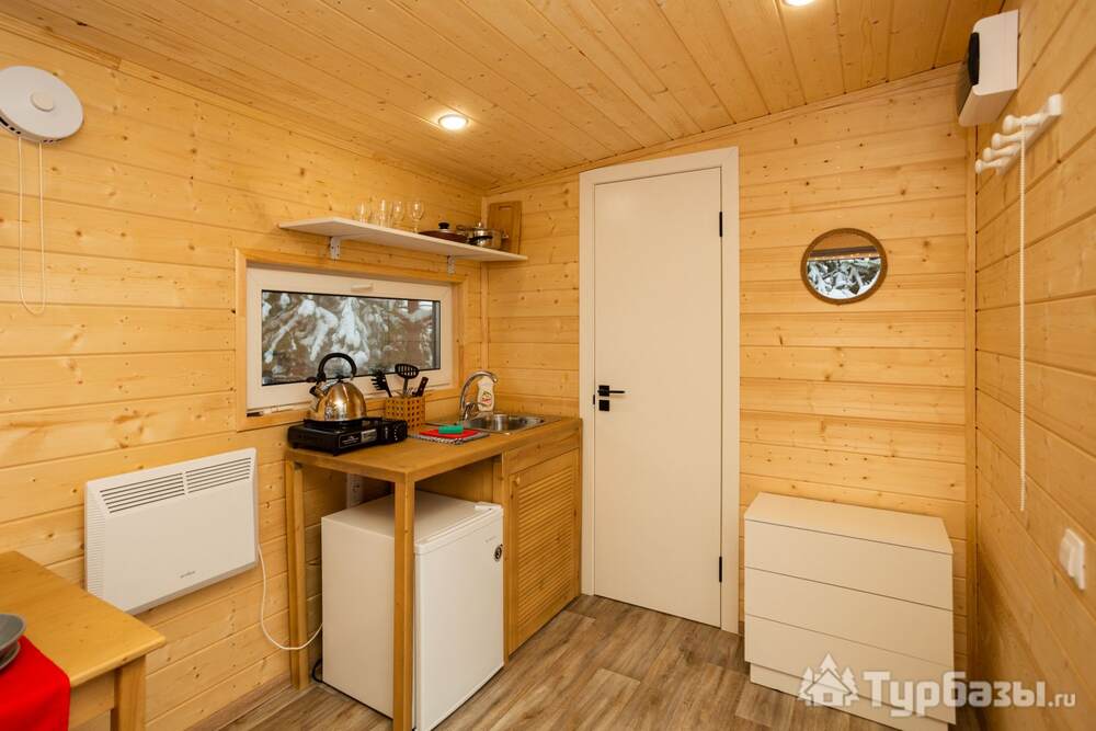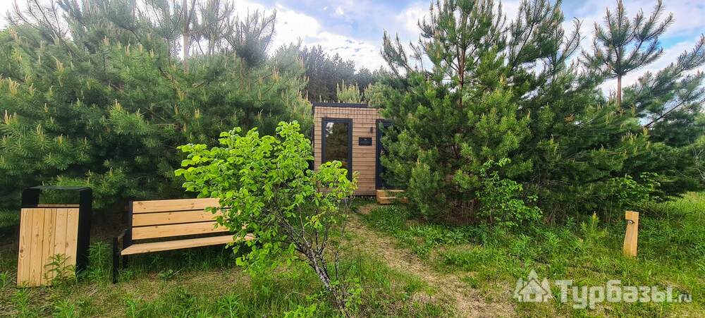 На базе — серия компактных «скандинавских» домиков (одно- и двухмодульные форматы): каждое жильё имеет отделку из дерева, с кухонным уголком, двуспальной кроватью и панорамным окном, через которое видна лесная полянка. Интерьеры тёплые и минималистичные — хороши для пар и небольших семей.