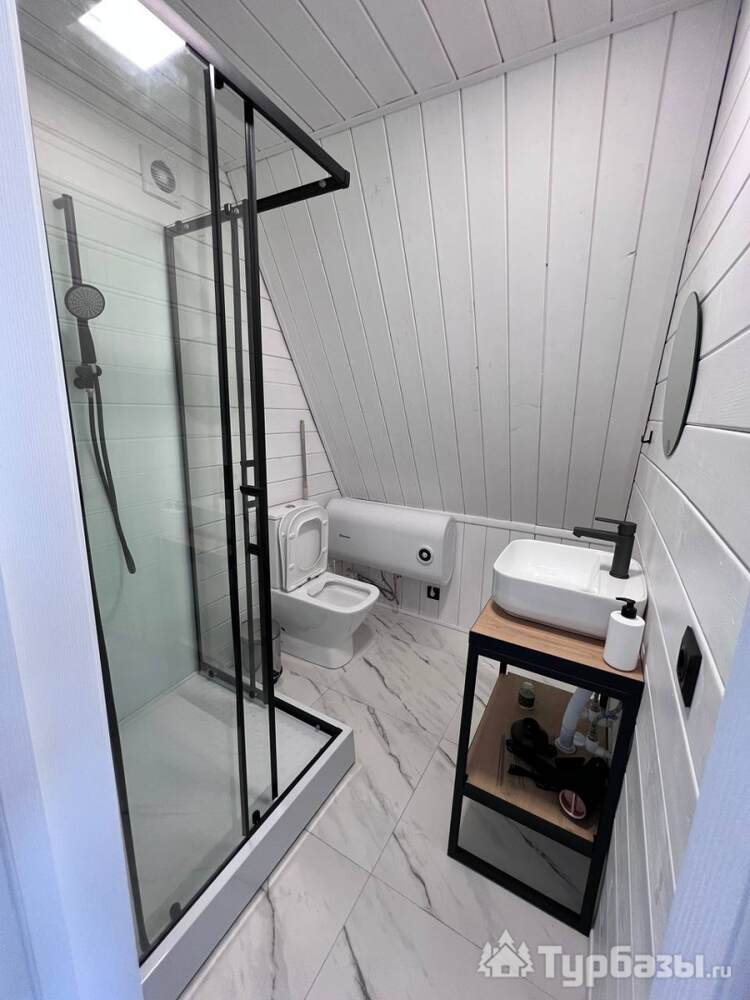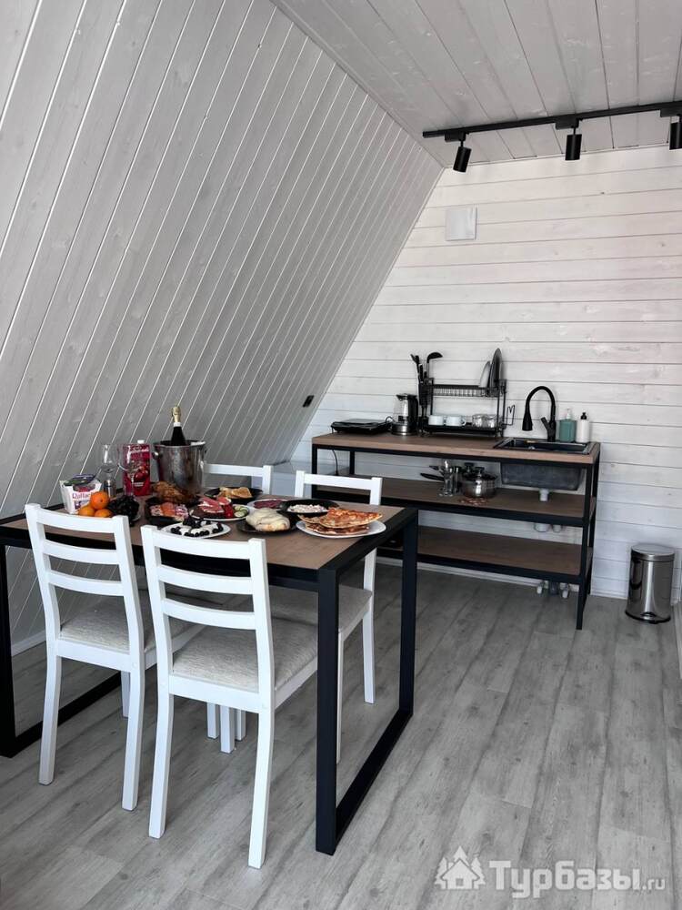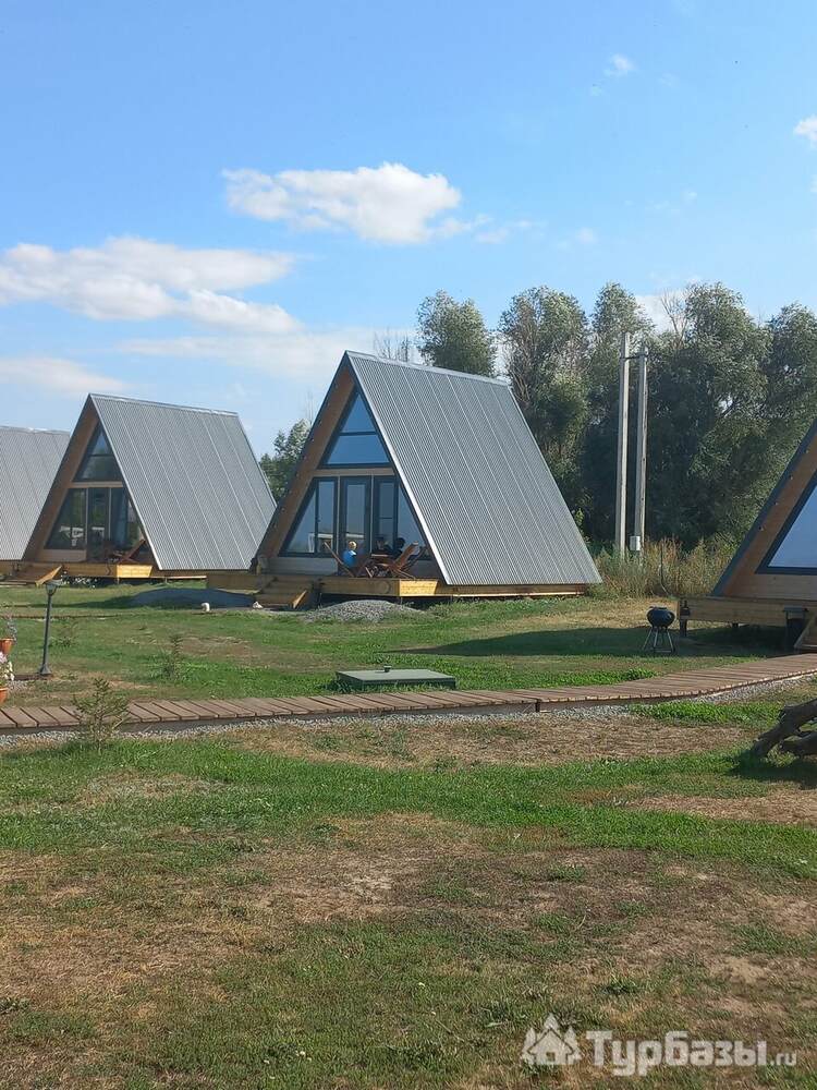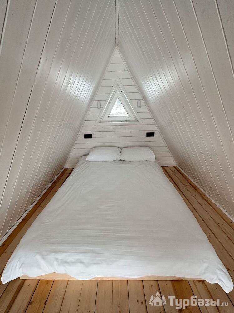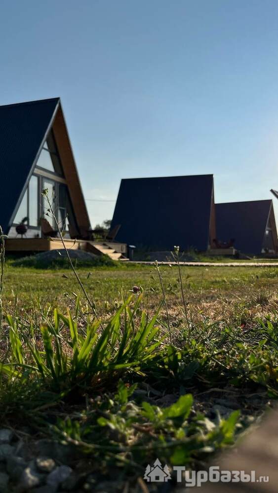 На территории — несколько различных вариантов проживания: A-frame (А-фрейм/сканди-домики) и компактные «барн-хаусы», у каждого — место для мангала и зоны отдыха. Есть отдельный банный комплекс с дровяной парной и горячим чаном, детские качели у воды. В домах есть базовая техника и всё нужное для комфортного проживания.