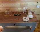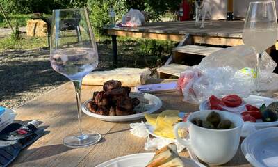 Питание организовано в гибком формате: на территории работает ресторан/кухня, рассчитанная на гостей глэмпинга, а также имеются оборудованные площадки для пикников и мангалов — это позволяет сочетать формальный ресторанный сервис и самостоятельное приготовление.