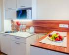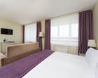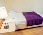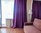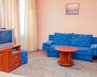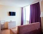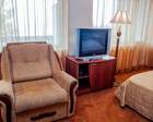 В спальне установлена большая кровать (king-size), а в гостиной диван. В номере: балкон, ламинат, телевизор, миникухня, микроволновая печь, набор посуды, электрочайник, мини-холодильник, душевая кабина, туалет, фен, полотенце.