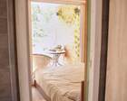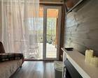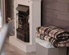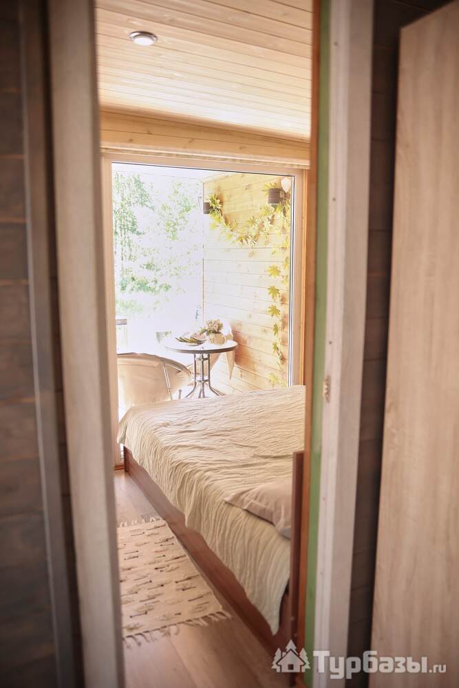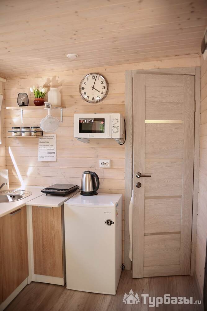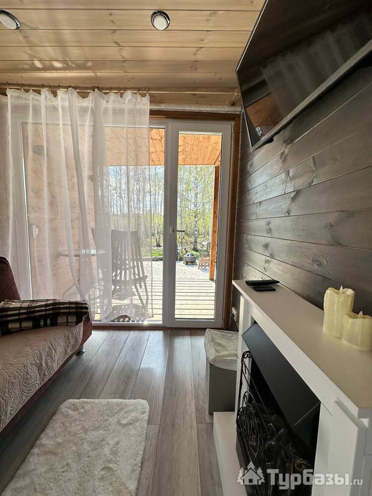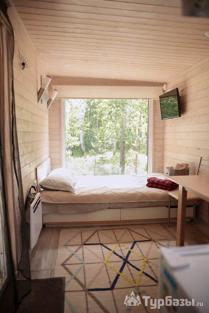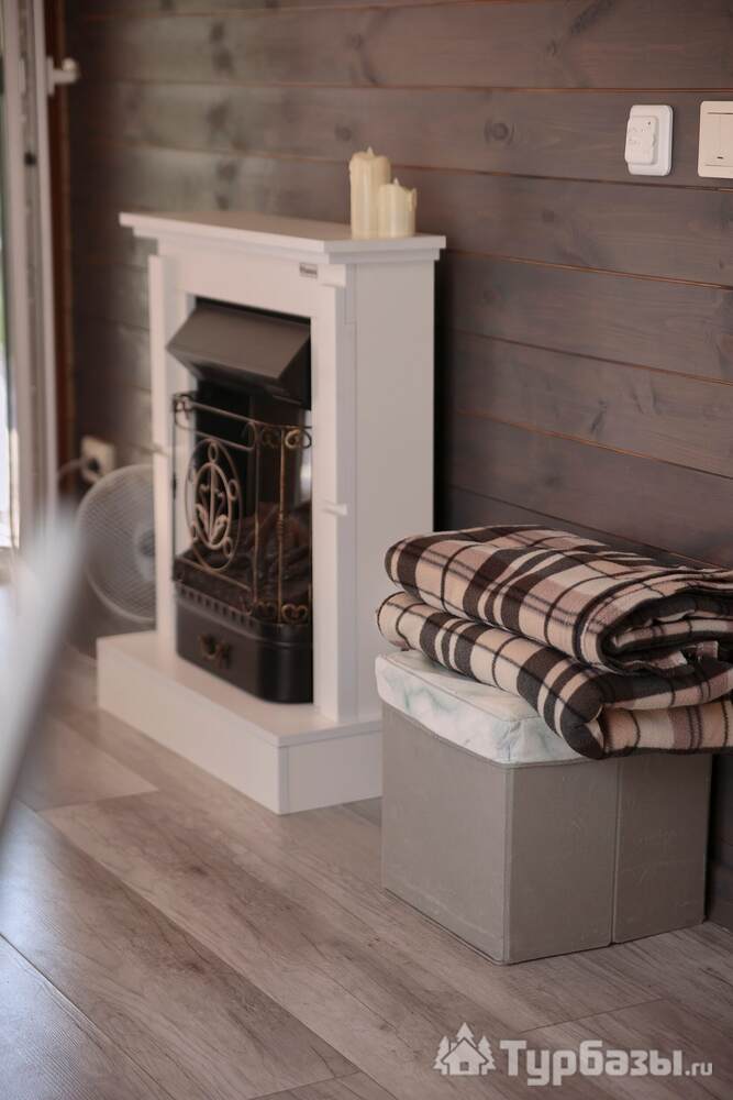 - В домиках: двухспальная кровать, кухня или кухонный уголок, санузел с душем, ТВ, скоростной Wi-Fi; в «доме со спальней» — также гостиная с диваном-местом и электрический камин.