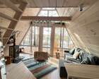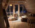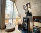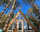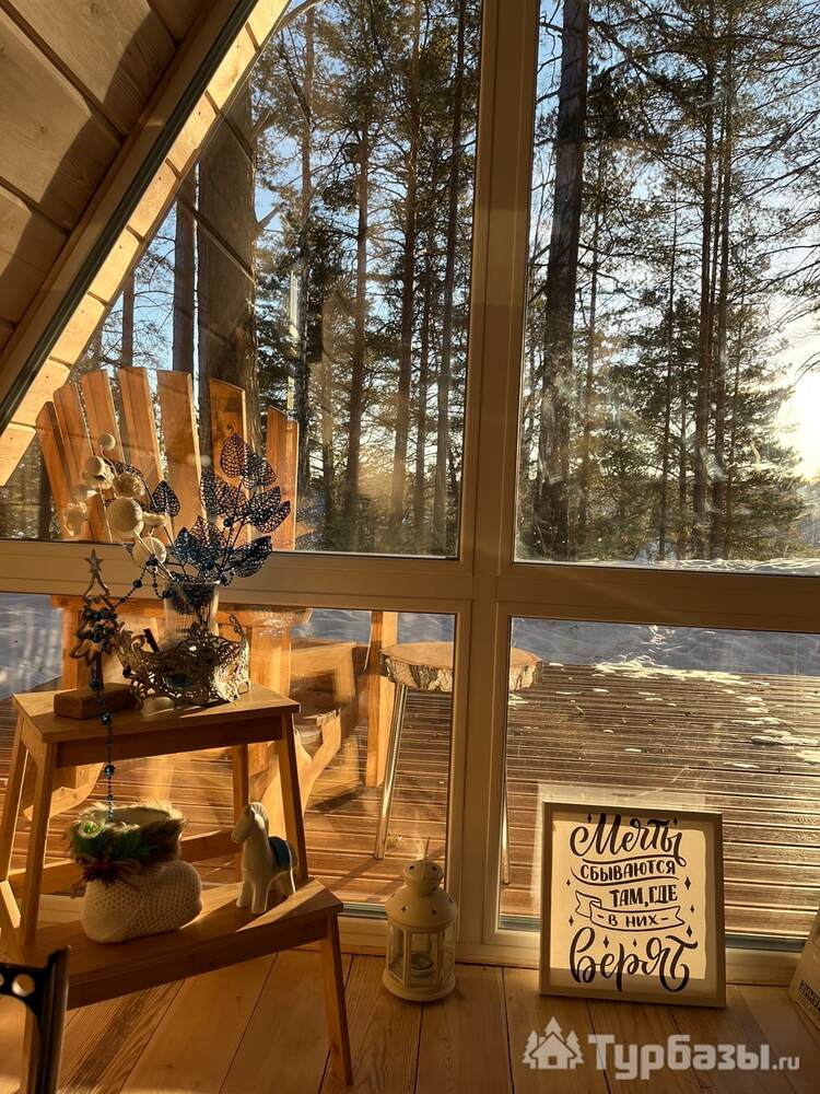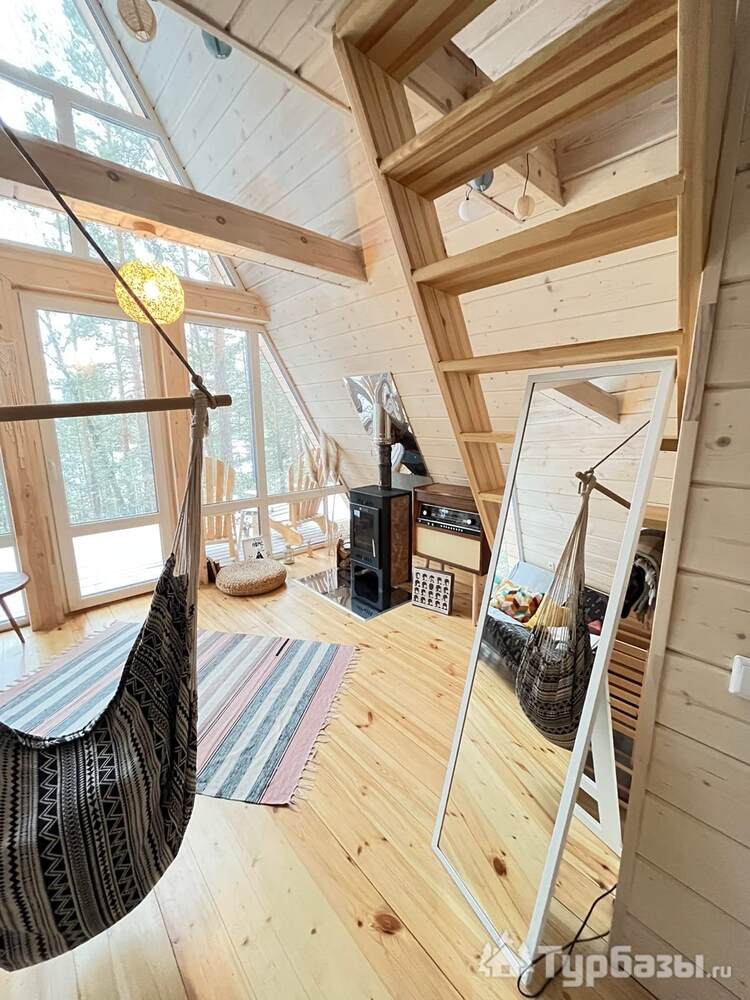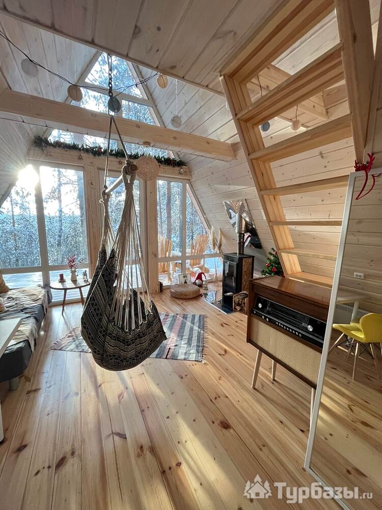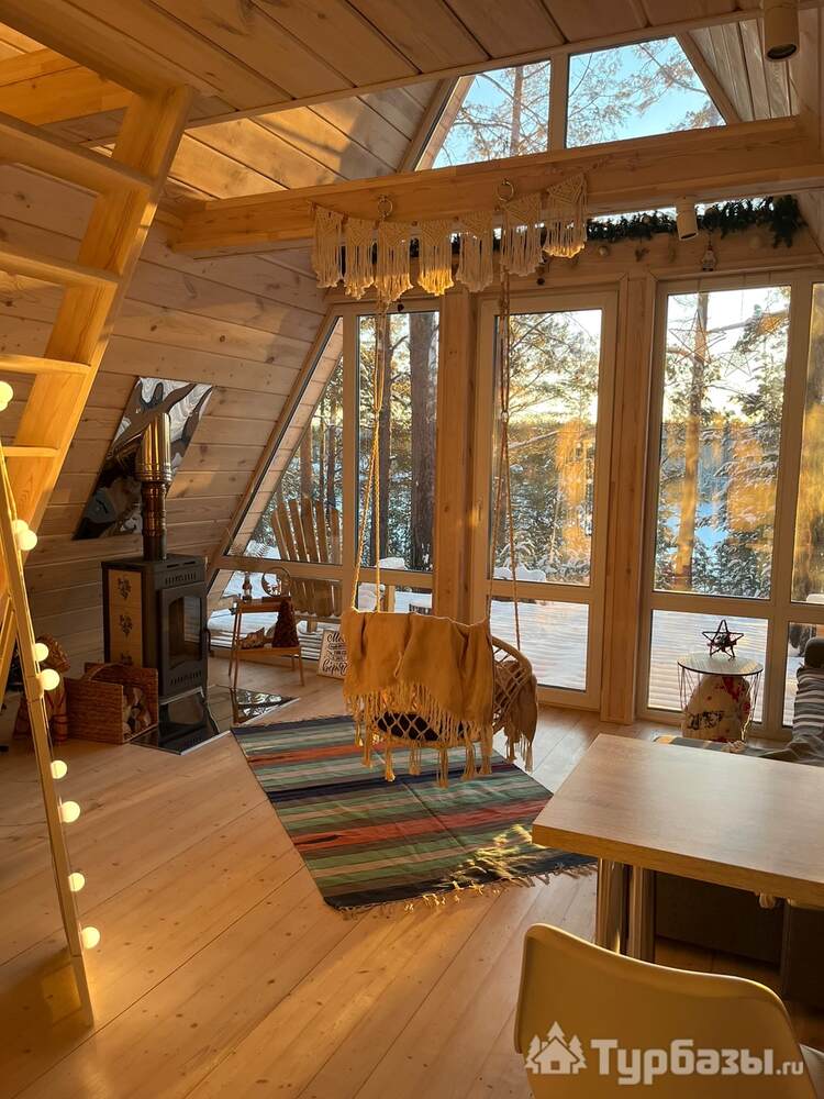 На территории — тёплые деревянные домики A-frame/барн-формата с верандами, общие и частные мангальные площадки, банный модуль и причал для купания и лодок. В домиках обычно есть базовый набор удобств (постель, отопление, мини-кухня в зависимости от типа).