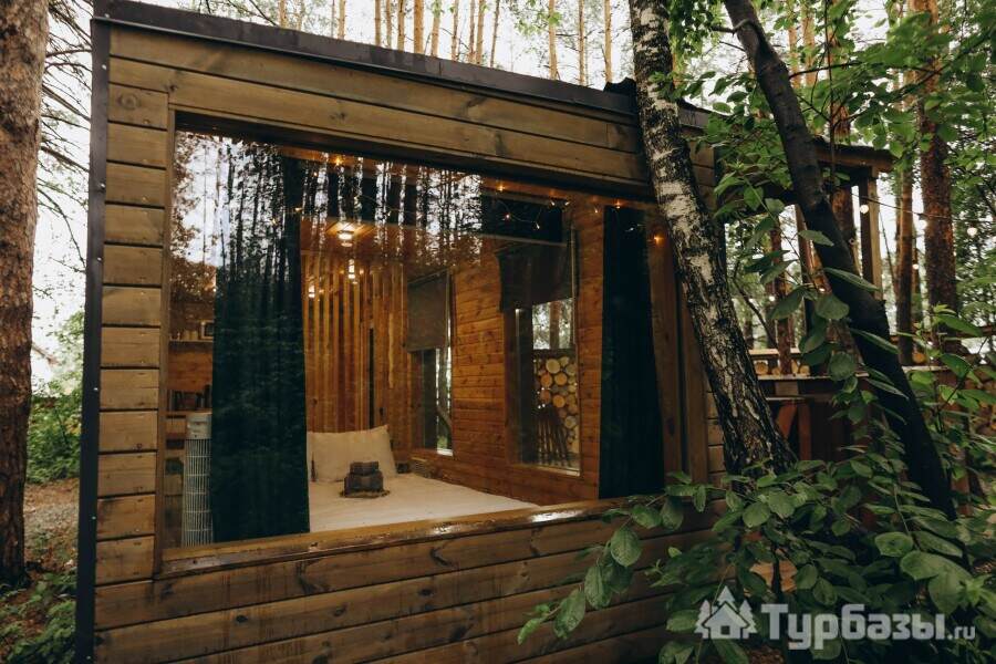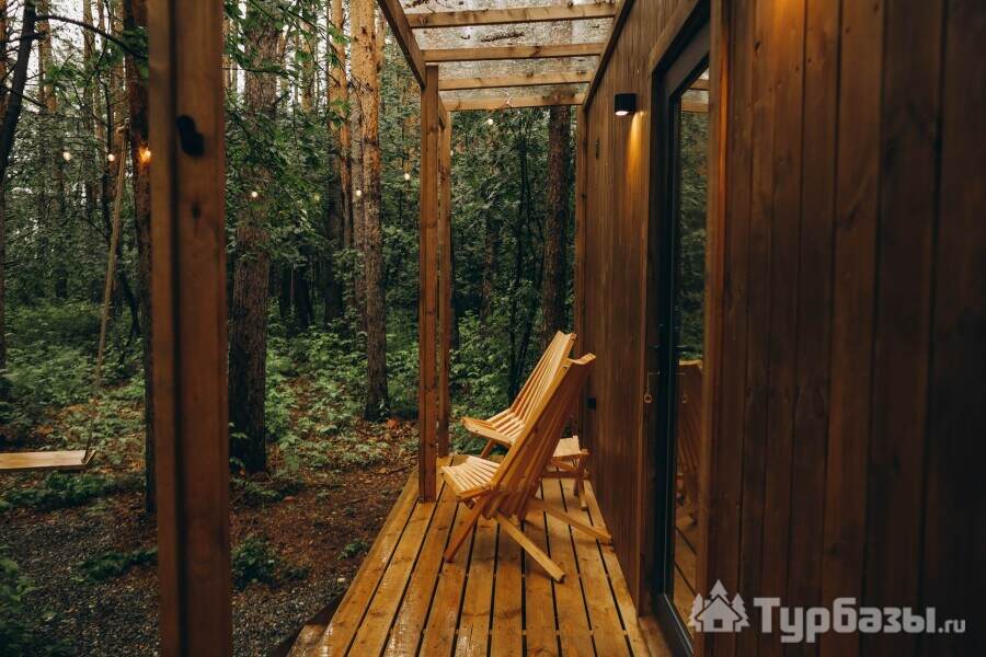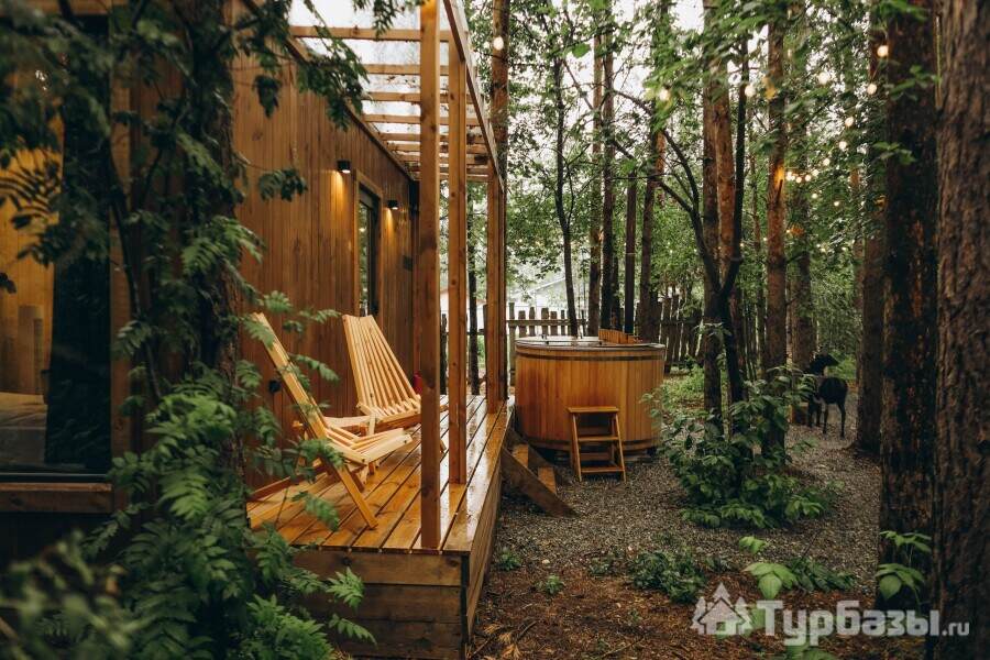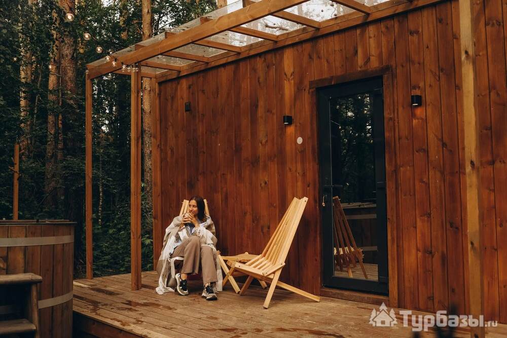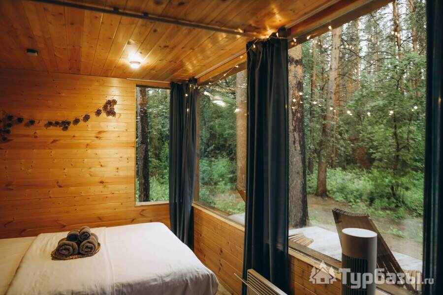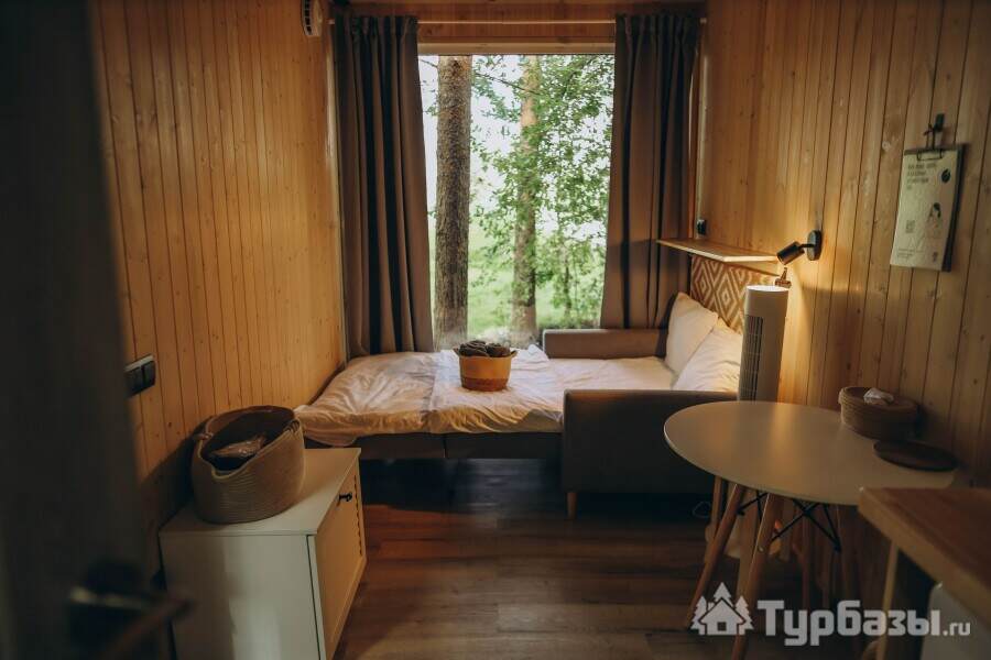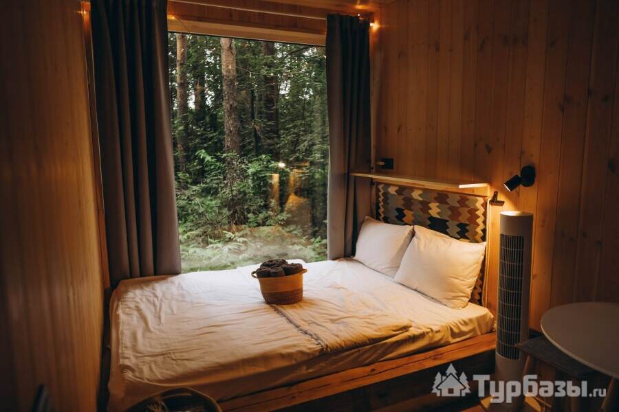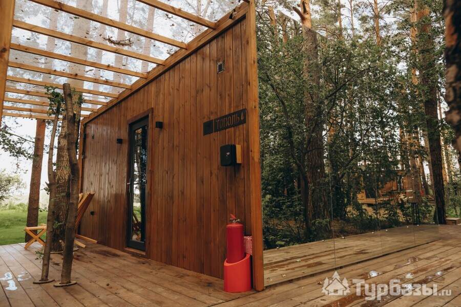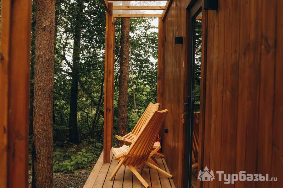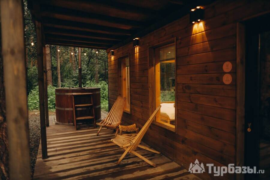- Всего 12 домиков с панорамными окнами (разные типы: «Ива», «Пихта», «Кедр», «Тополь» и др.) и 5 сафари-тентов; у каждого домика — своя веранда и место для отдыха.