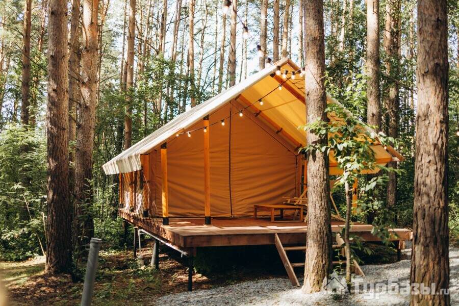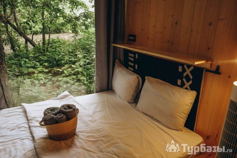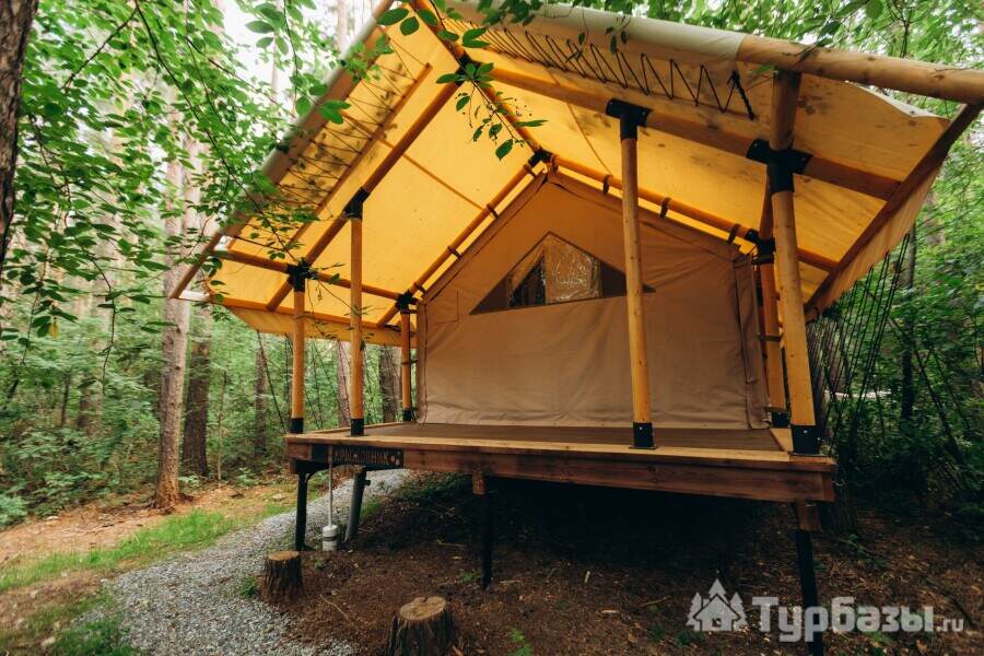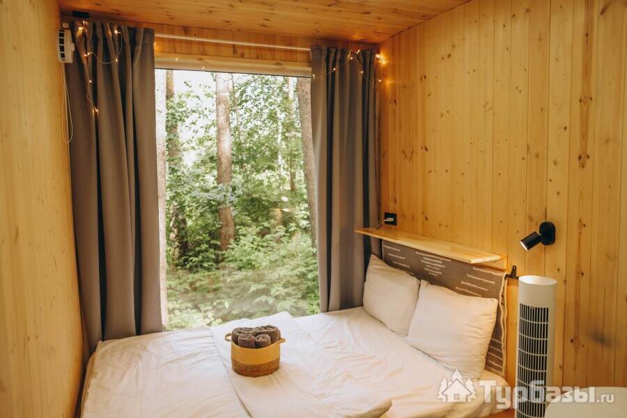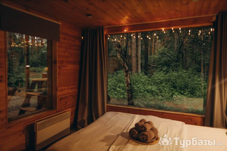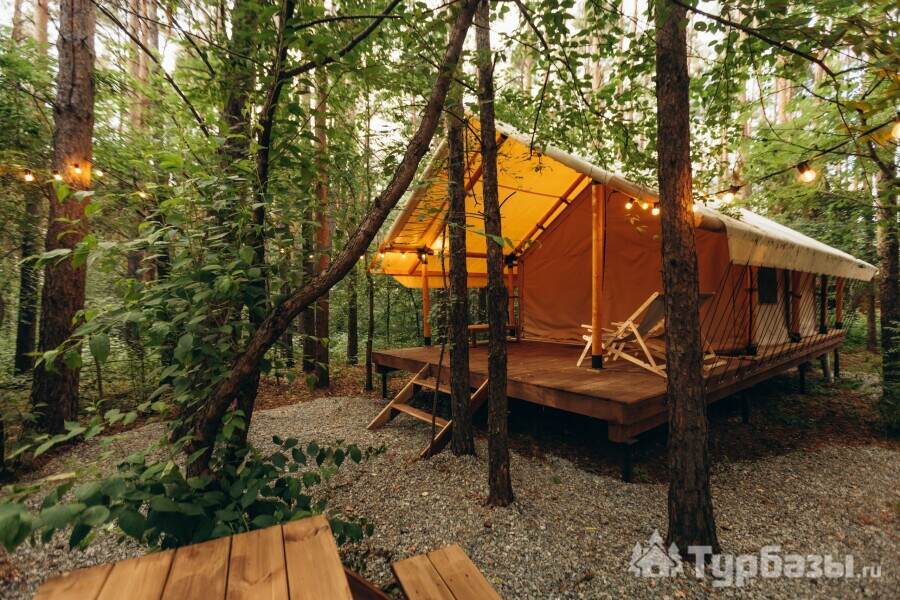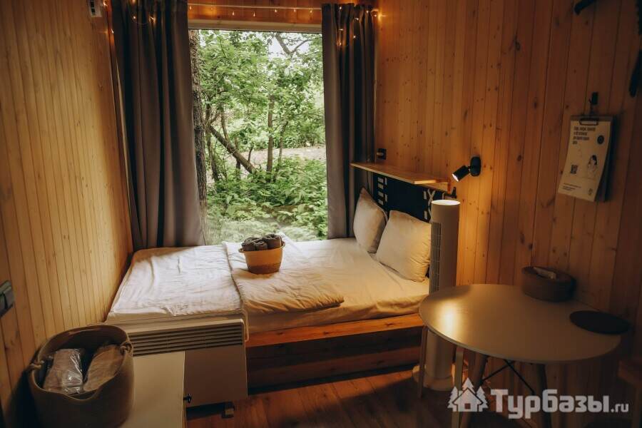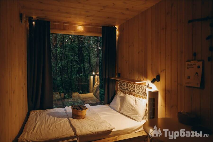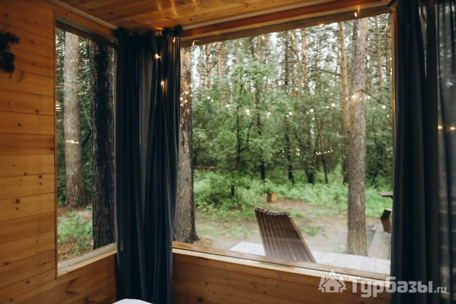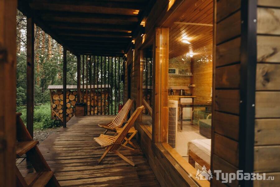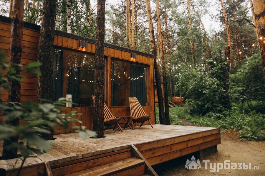 - Всего 12 домиков с панорамными окнами (разные типы: «Ива», «Пихта», «Кедр», «Тополь» и др.) и 5 сафари-тентов; у каждого домика — своя веранда и место для отдыха.