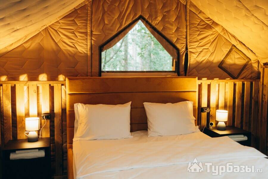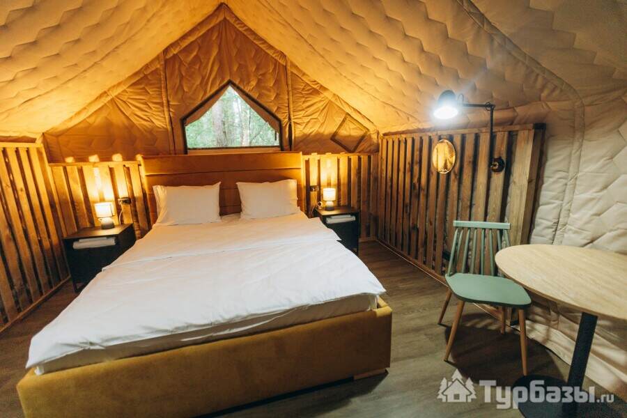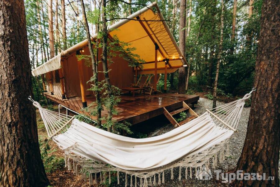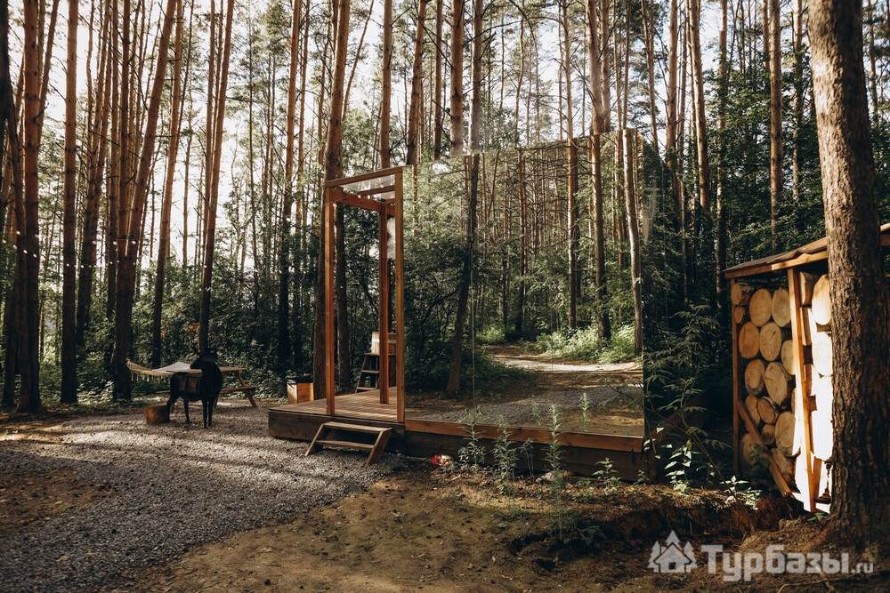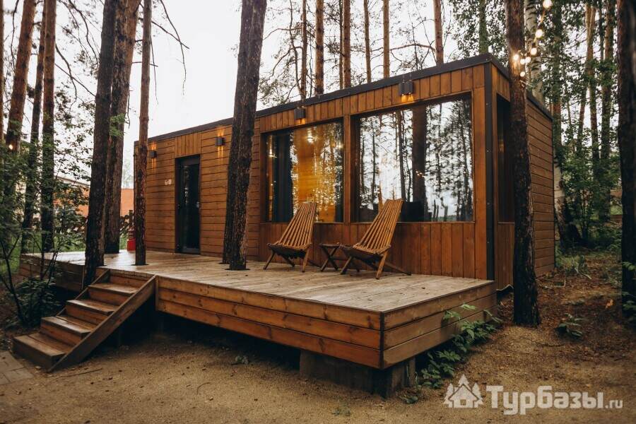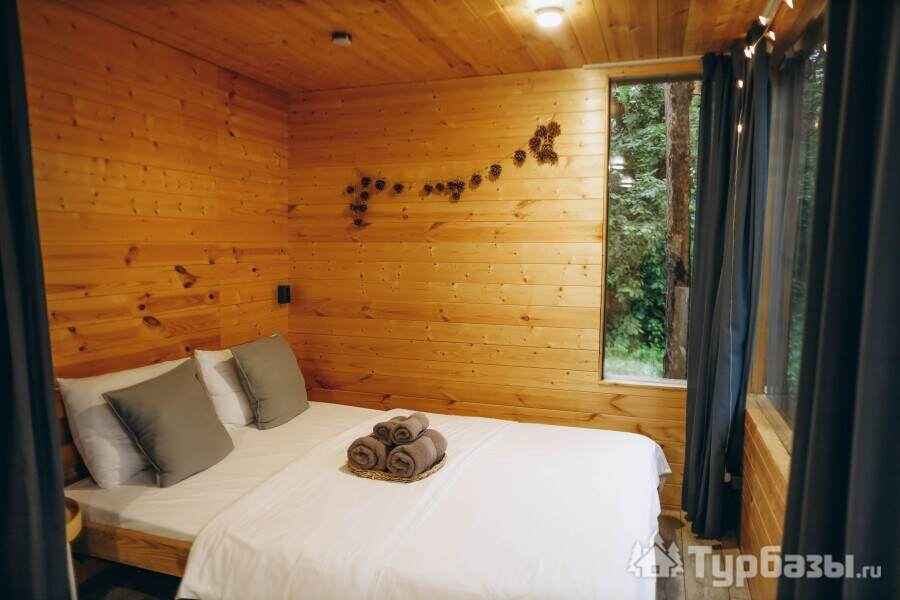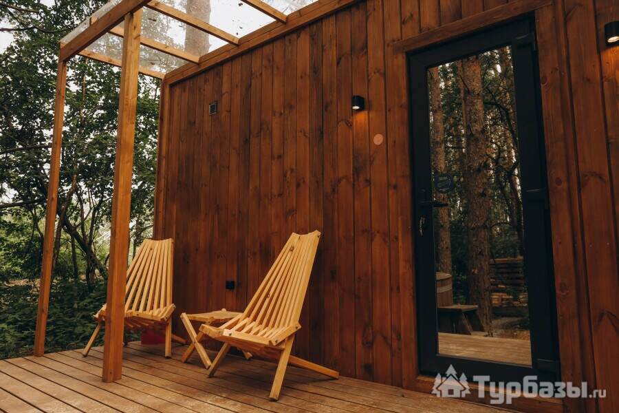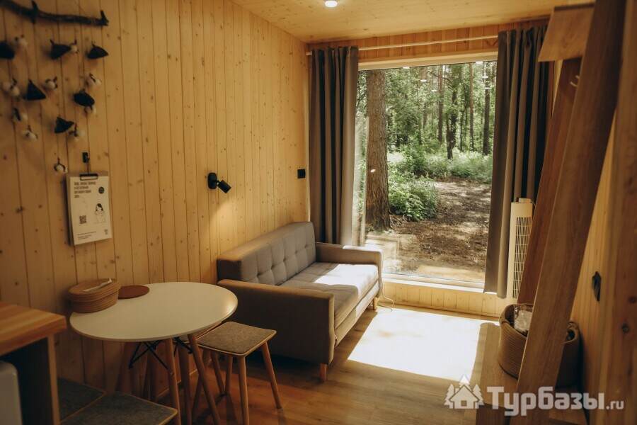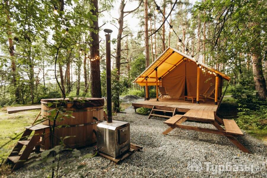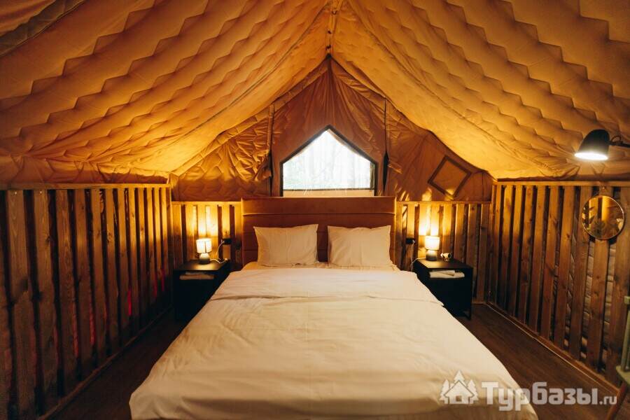 - Всего 12 домиков с панорамными окнами (разные типы: «Ива», «Пихта», «Кедр», «Тополь» и др.) и 5 сафари-тентов; у каждого домика — своя веранда и место для отдыха.
