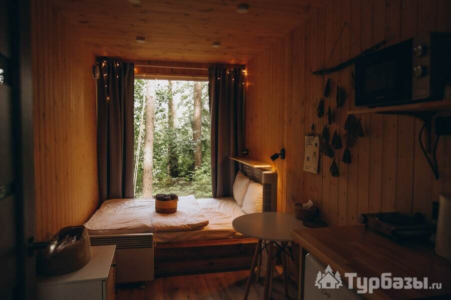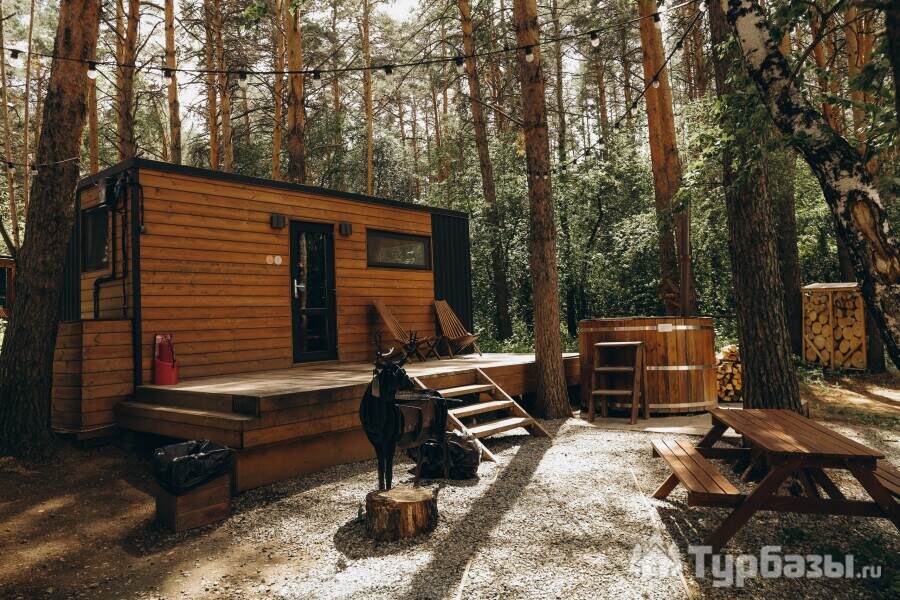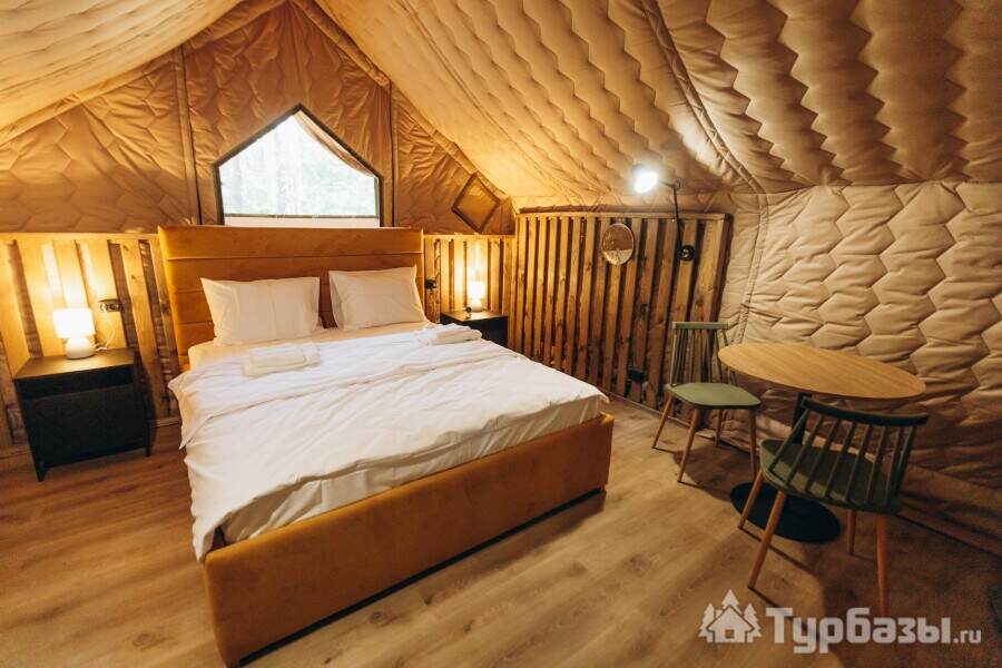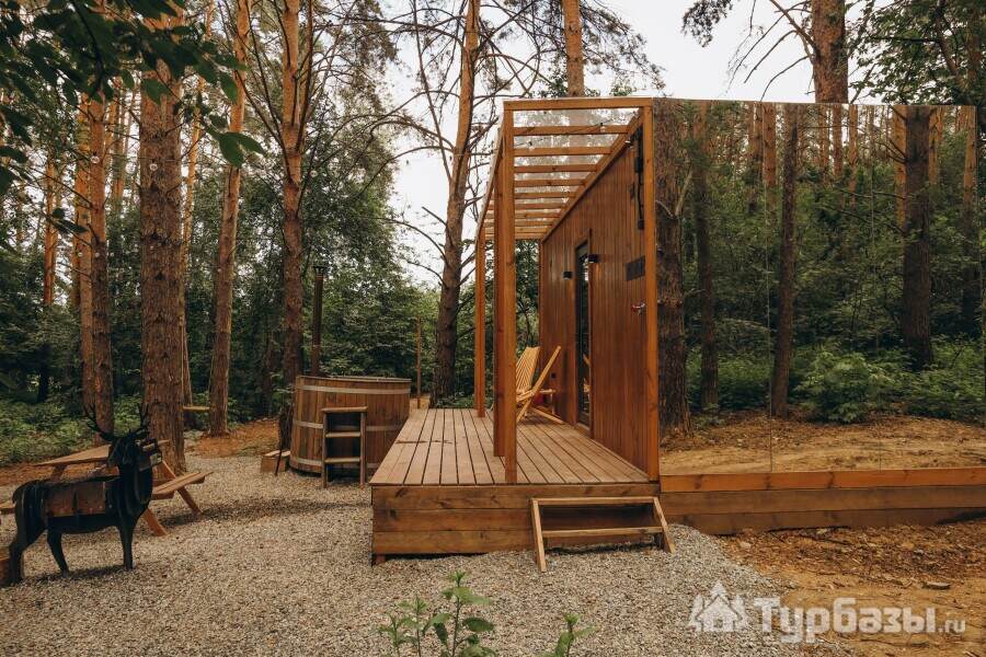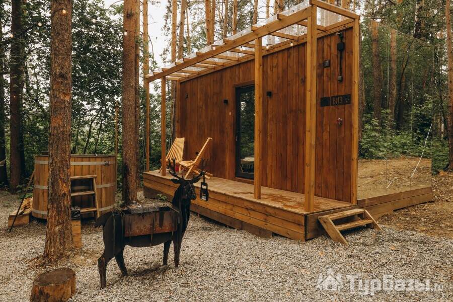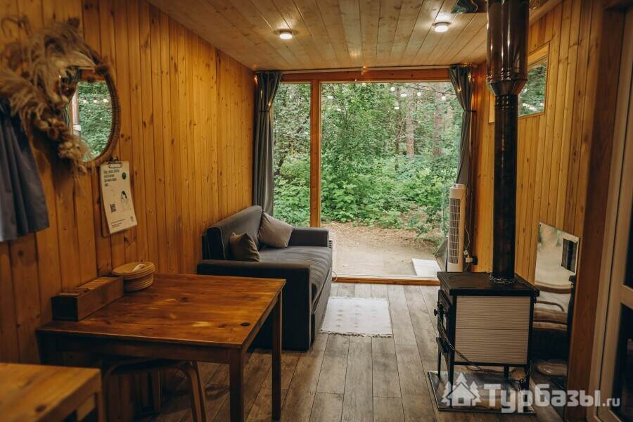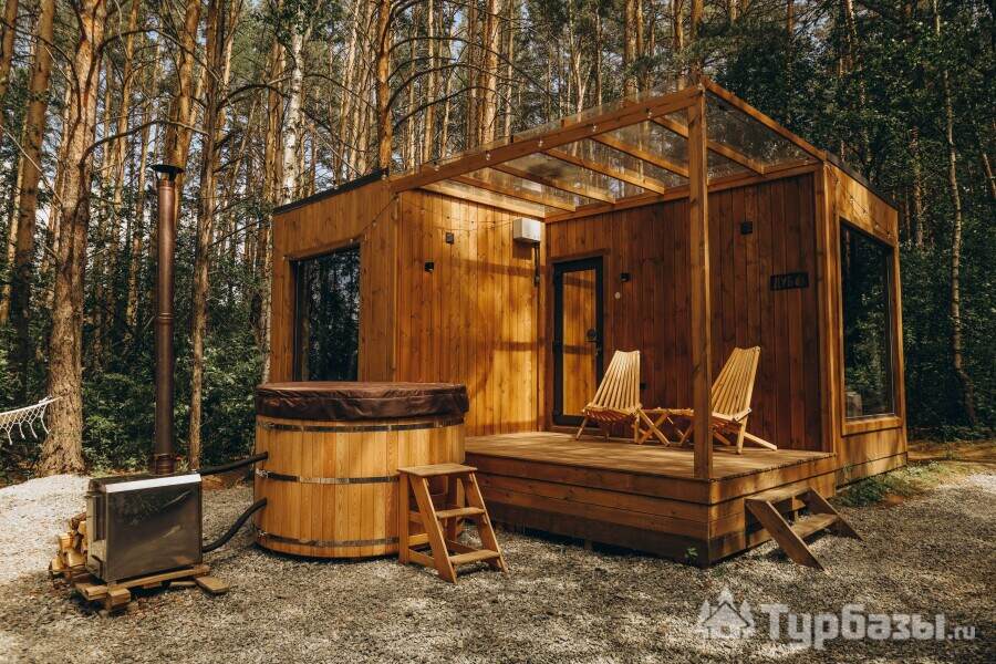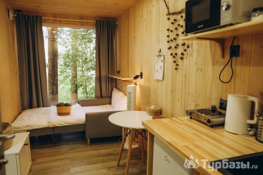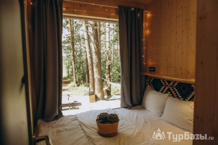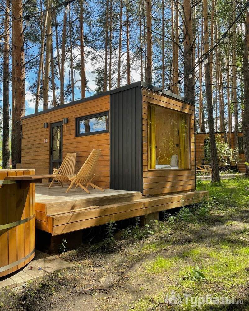 - Всего 12 домиков с панорамными окнами (разные типы: «Ива», «Пихта», «Кедр», «Тополь» и др.) и 5 сафари-тентов; у каждого домика — своя веранда и место для отдыха.