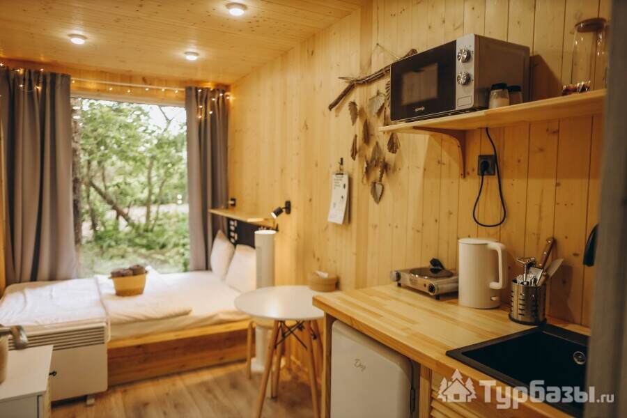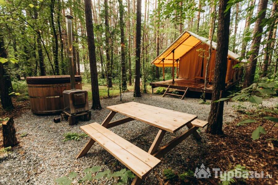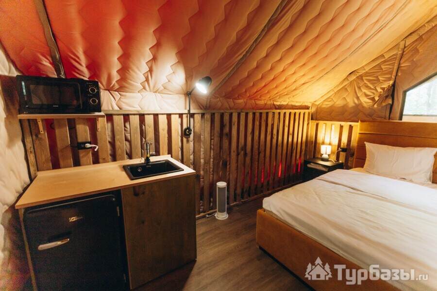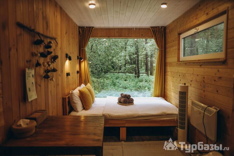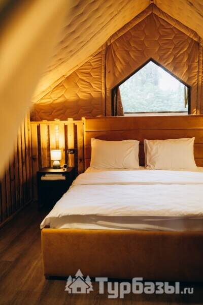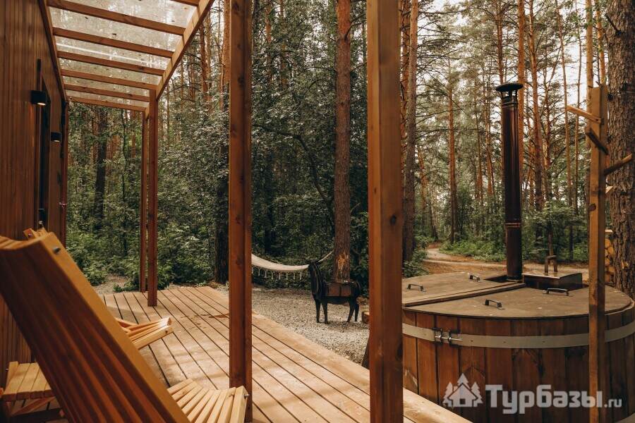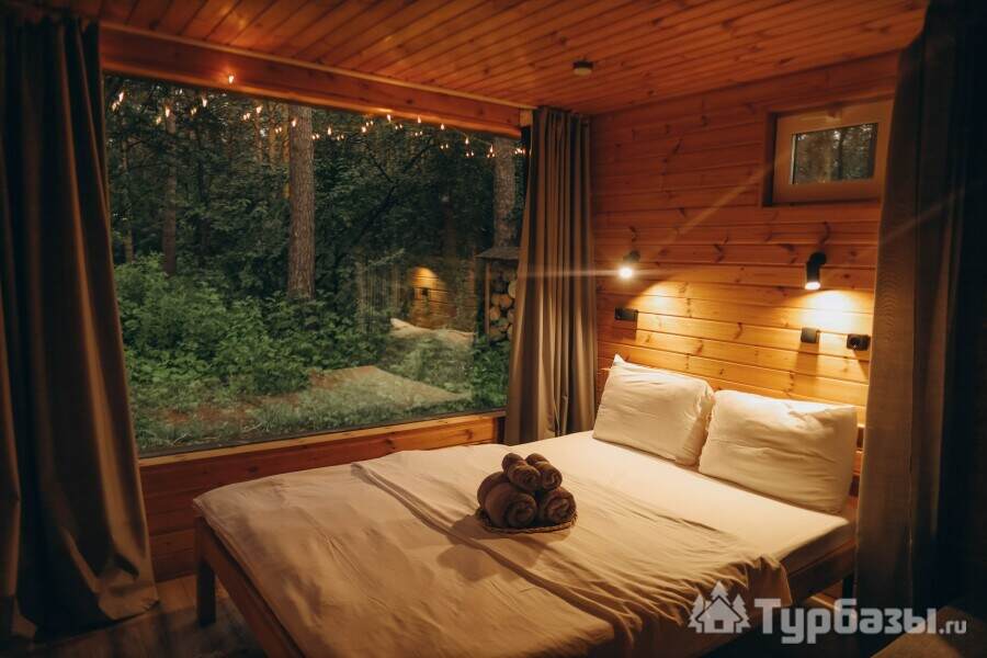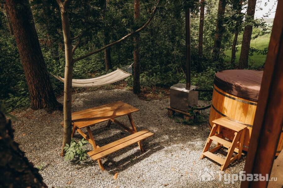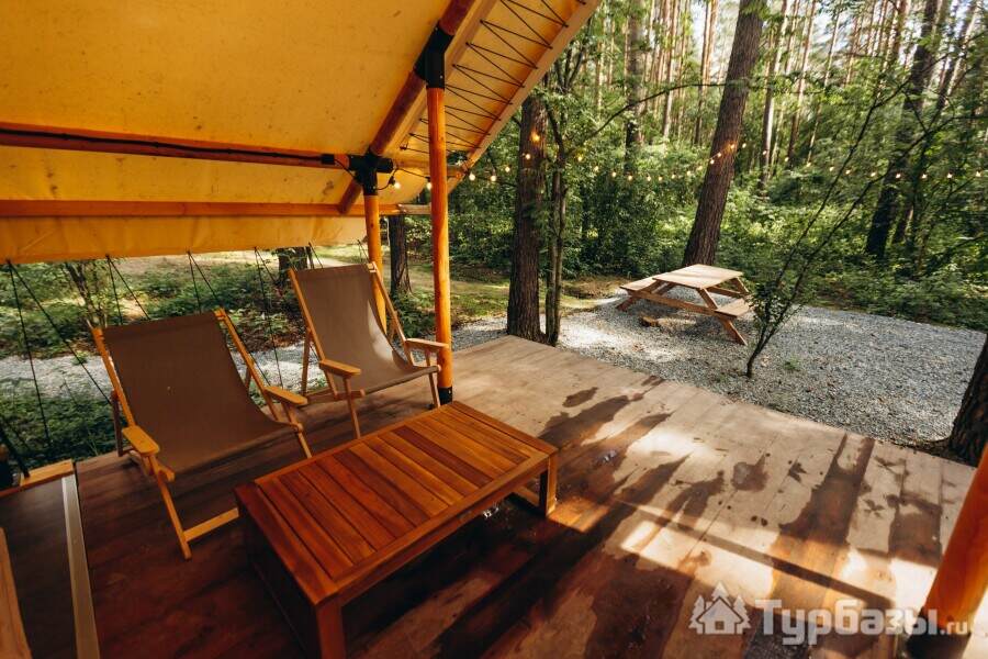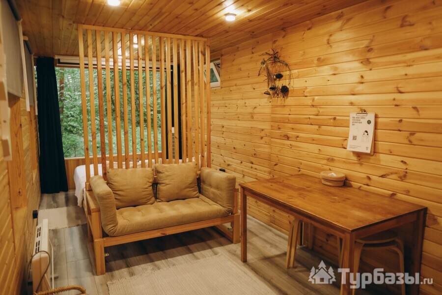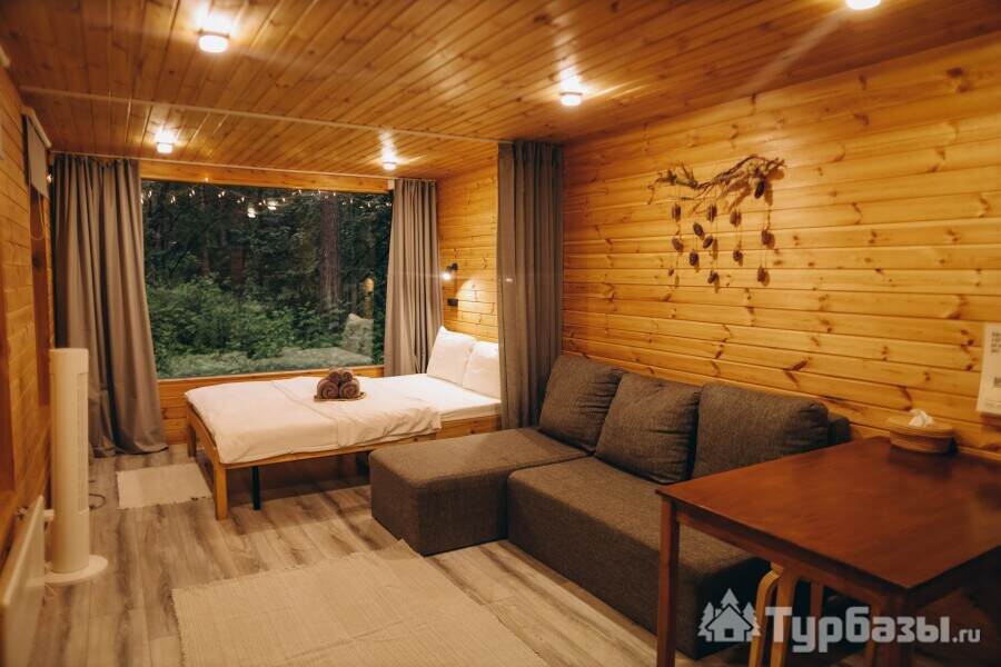 - Всего 12 домиков с панорамными окнами (разные типы: «Ива», «Пихта», «Кедр», «Тополь» и др.) и 5 сафари-тентов; у каждого домика — своя веранда и место для отдыха.