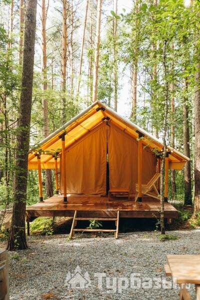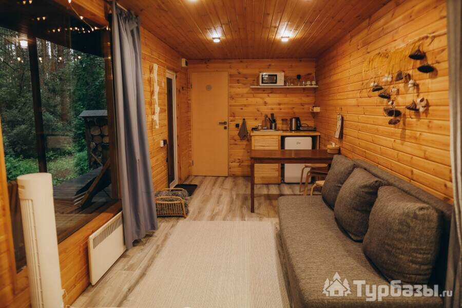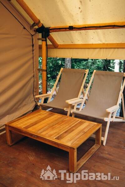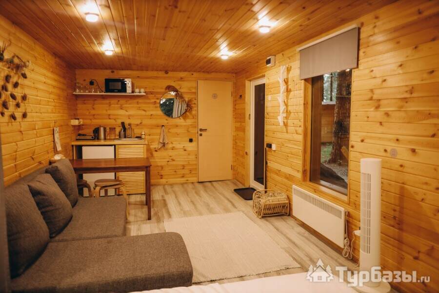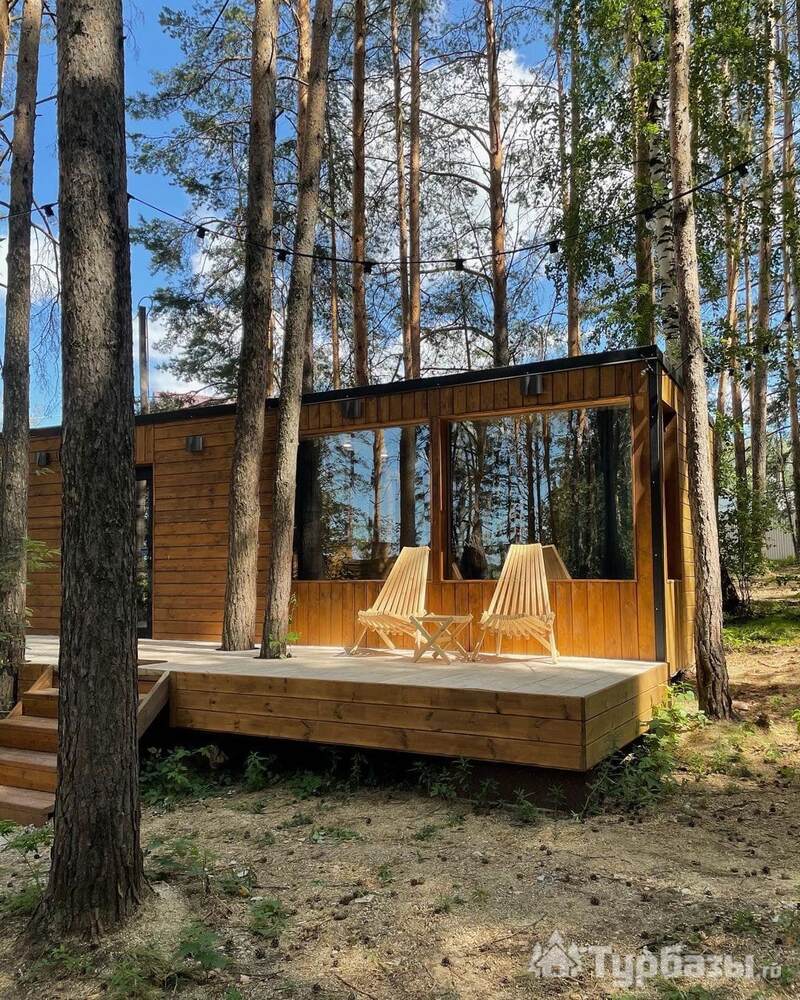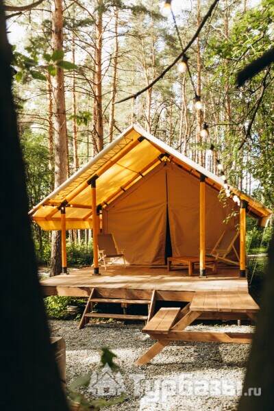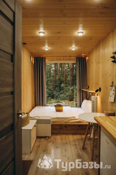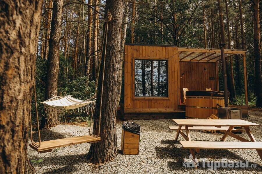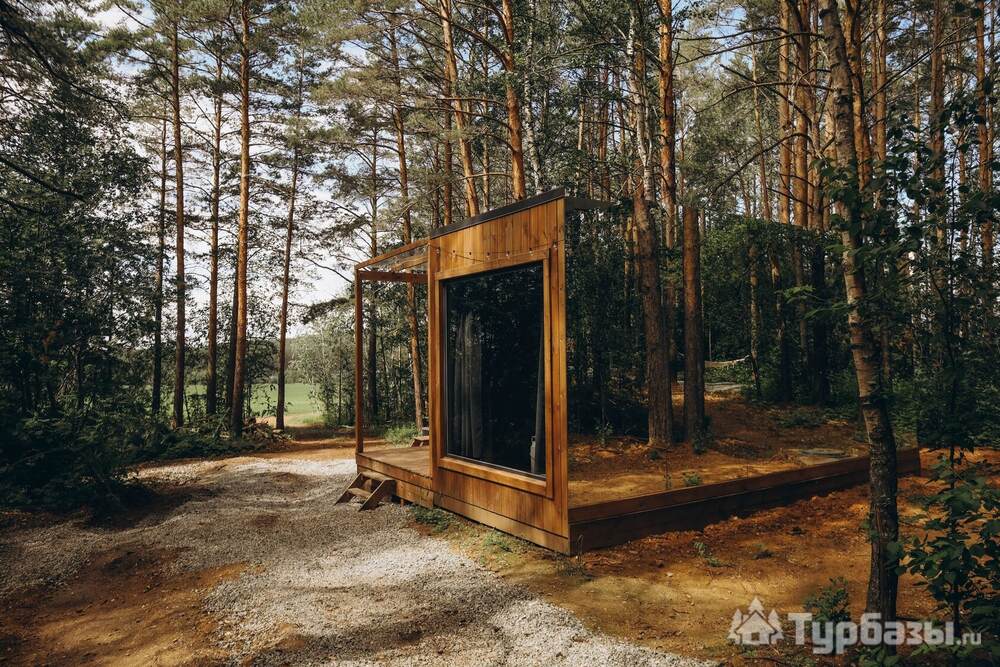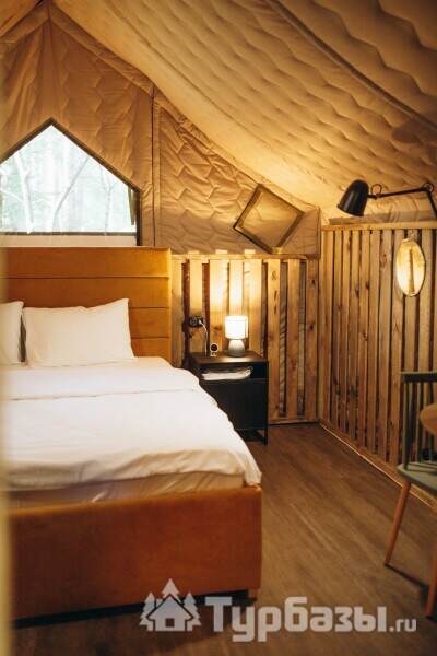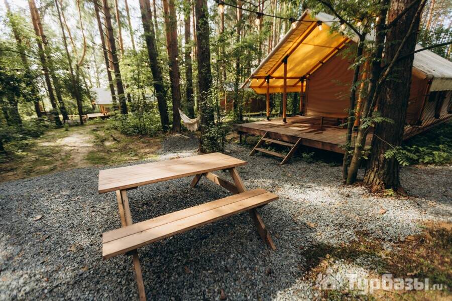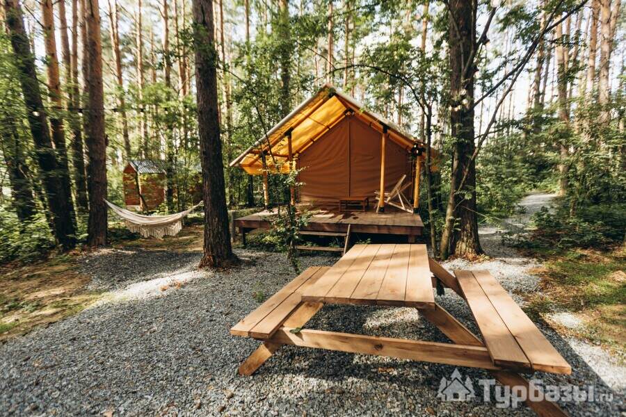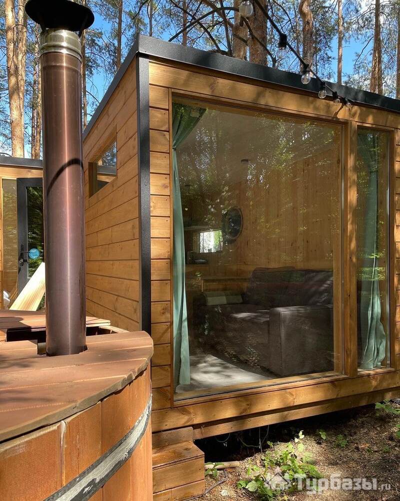 - Всего 12 домиков с панорамными окнами (разные типы: «Ива», «Пихта», «Кедр», «Тополь» и др.) и 5 сафари-тентов; у каждого домика — своя веранда и место для отдыха.