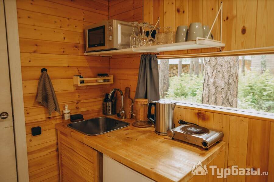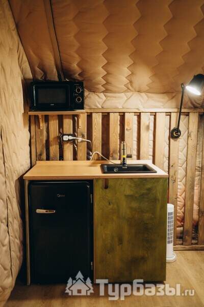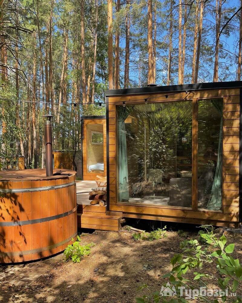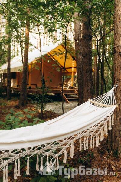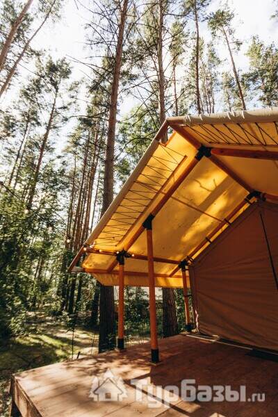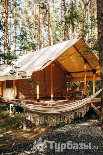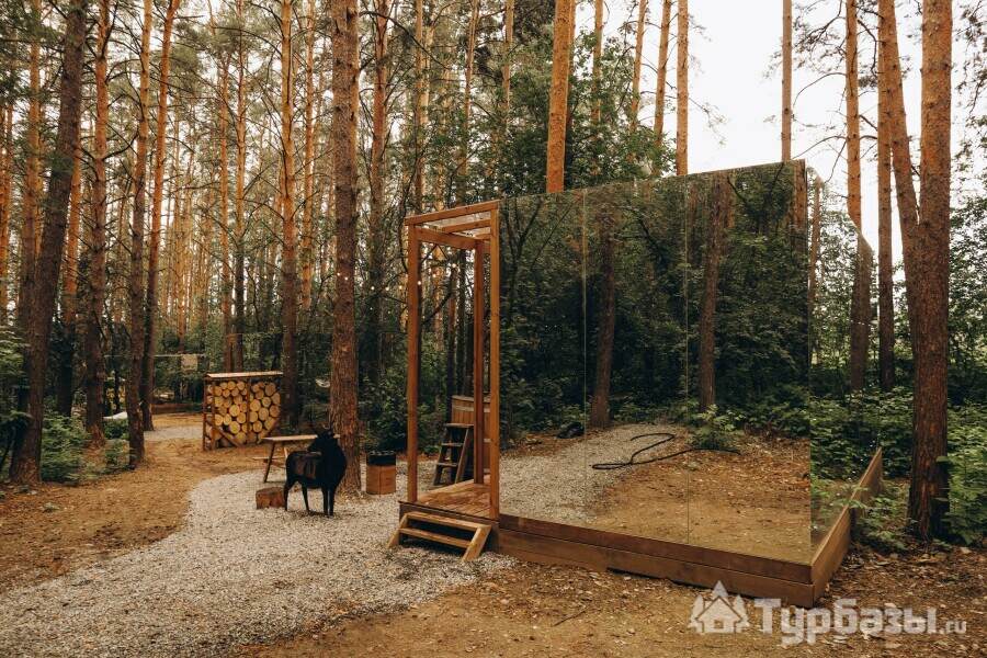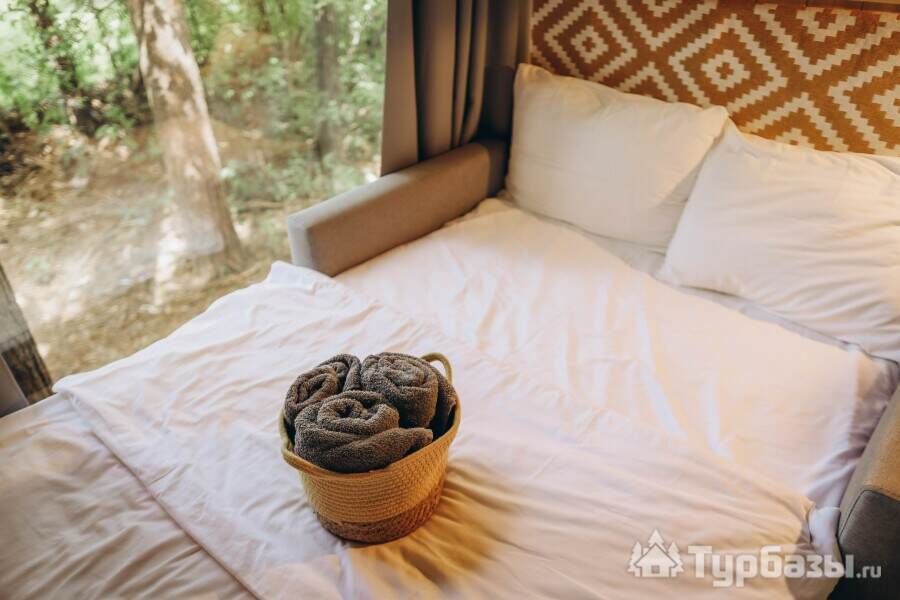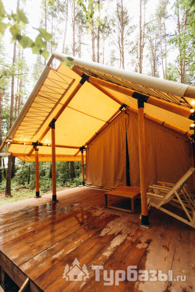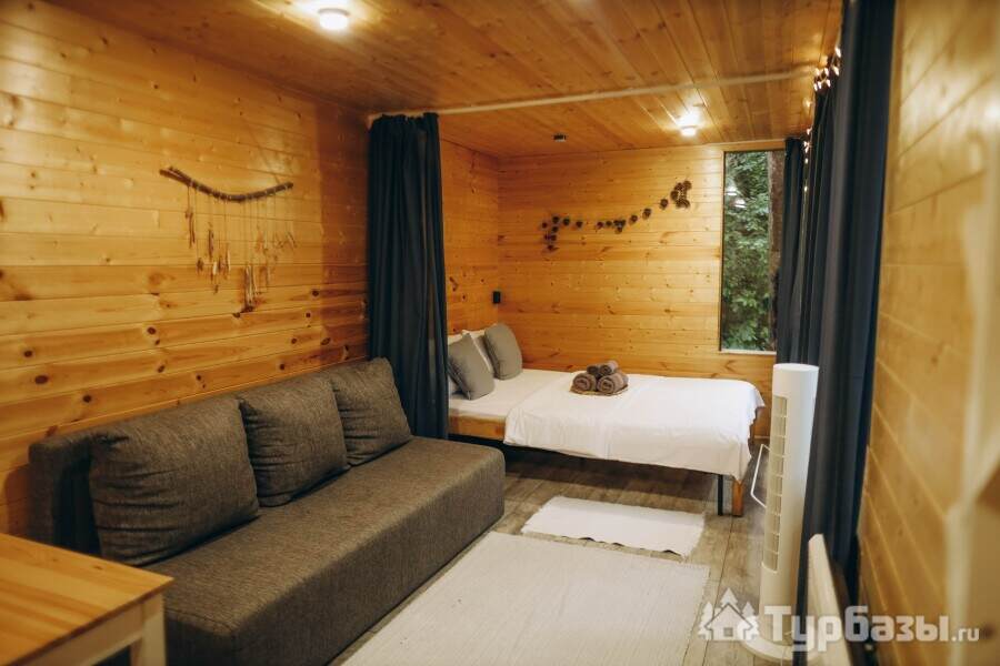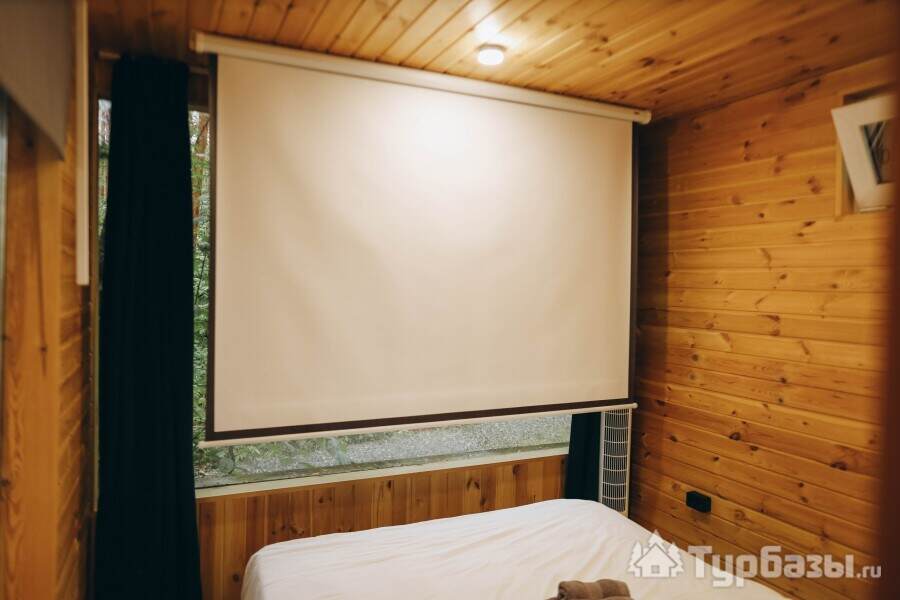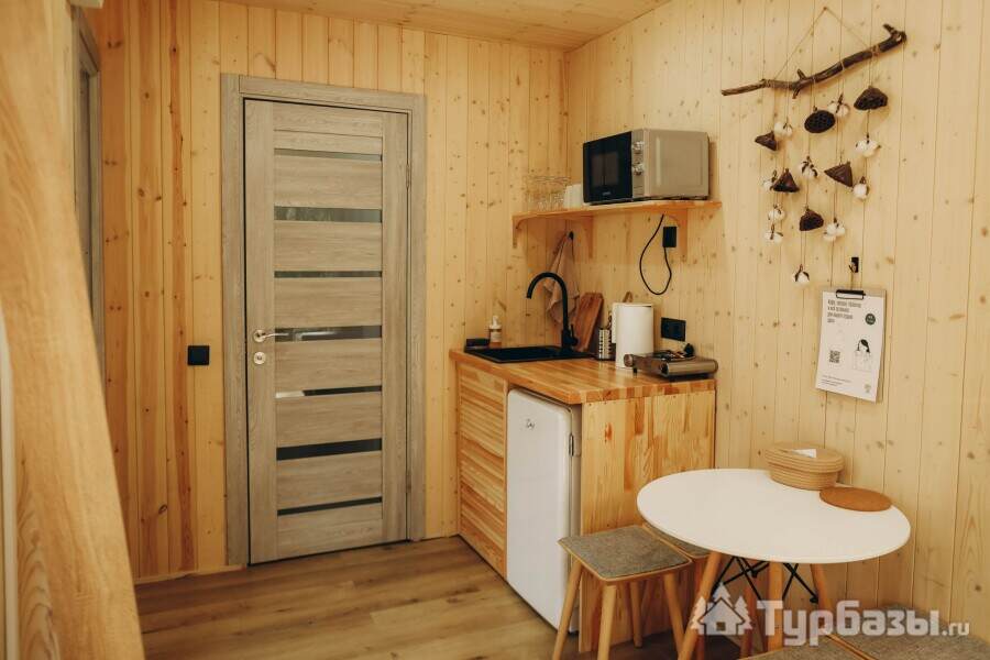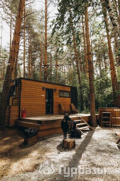 - Всего 12 домиков с панорамными окнами (разные типы: «Ива», «Пихта», «Кедр», «Тополь» и др.) и 5 сафари-тентов; у каждого домика — своя веранда и место для отдыха.