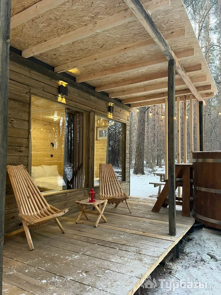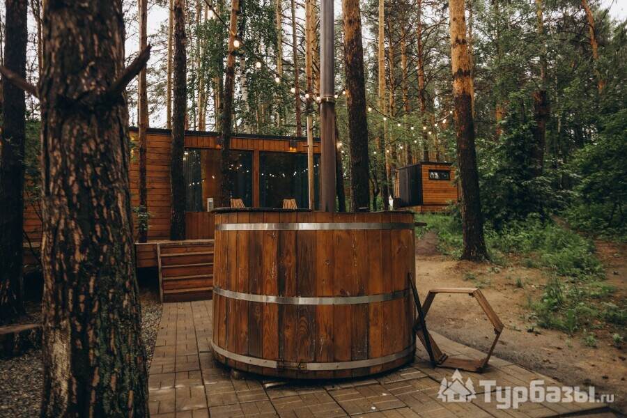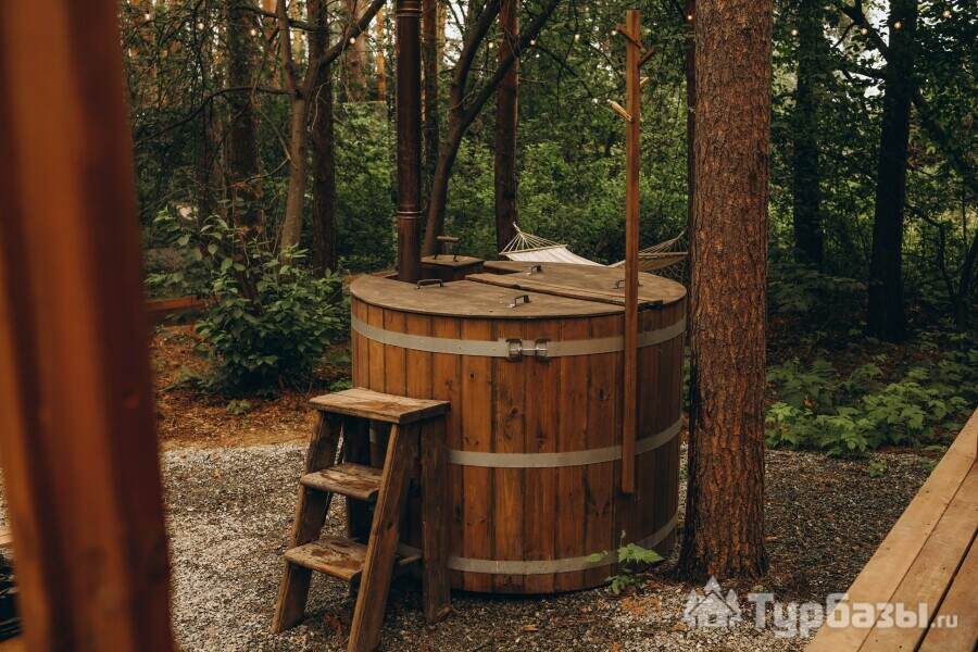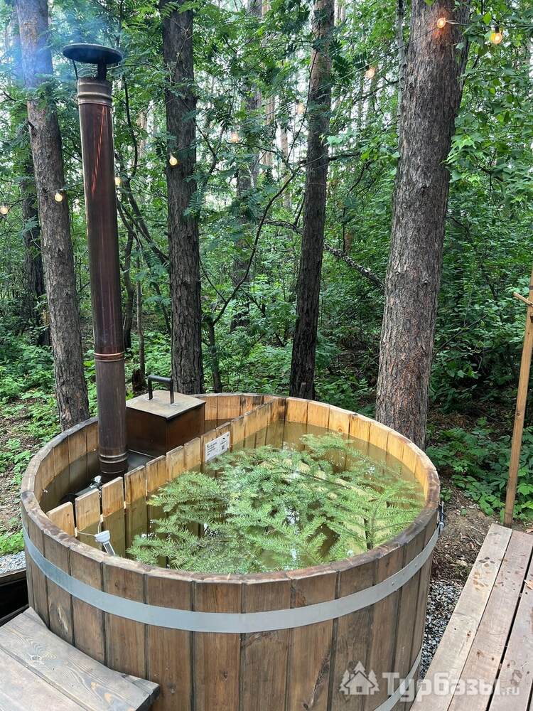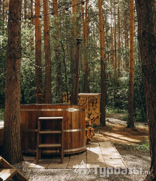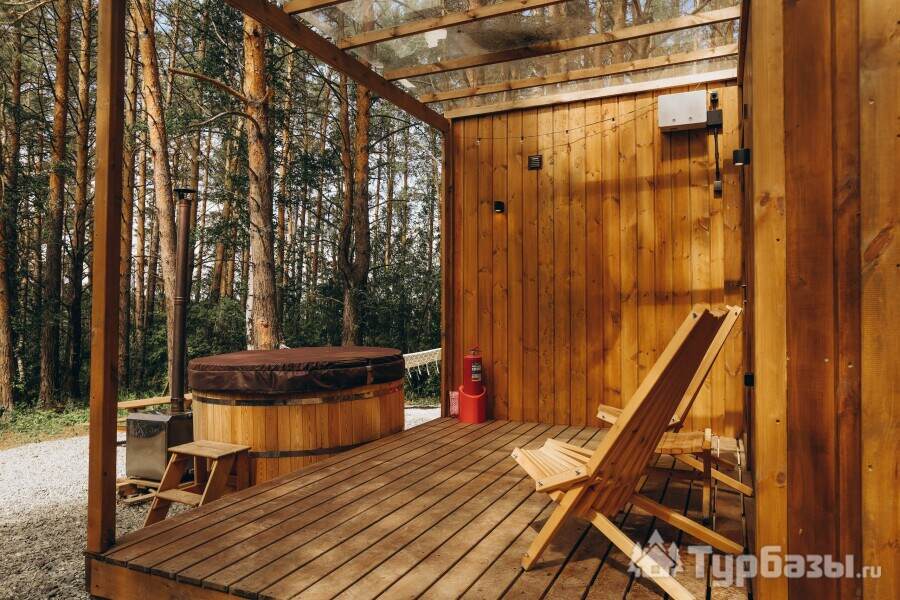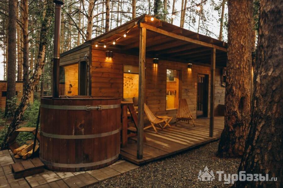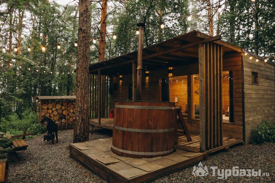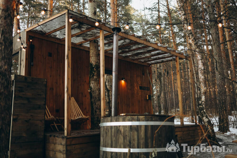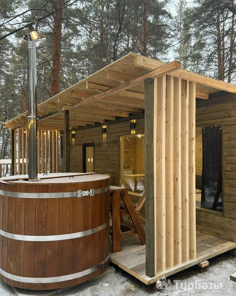 - Баня на дровах с холодной купелью доступна для аренды. Прямо перед террасой каждого домика есть своя купель, которую по запросу растапливают.
