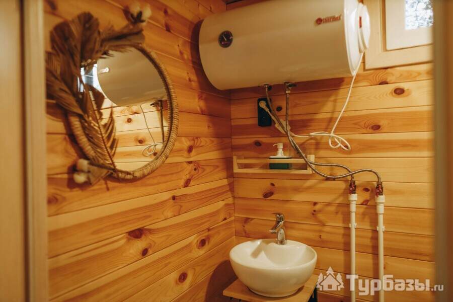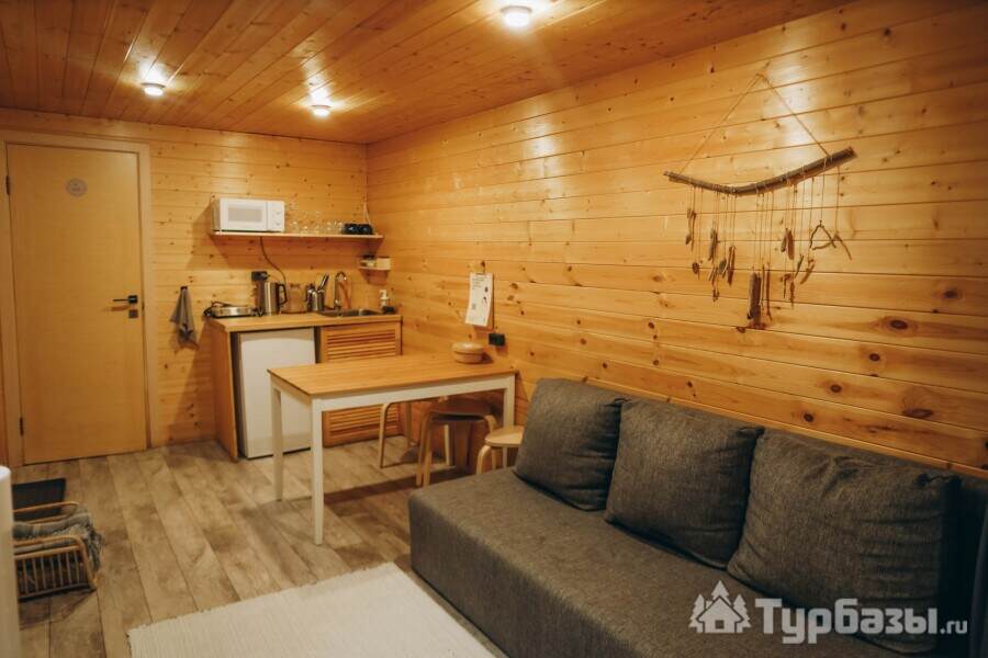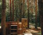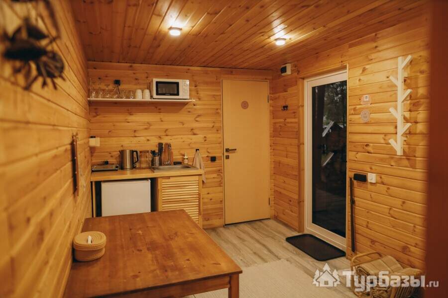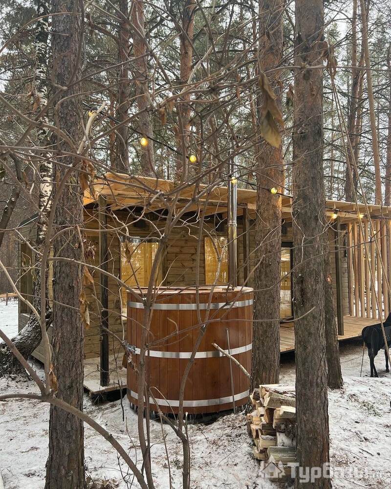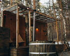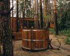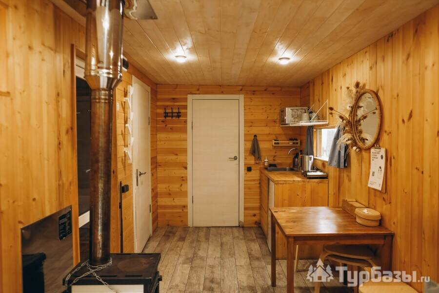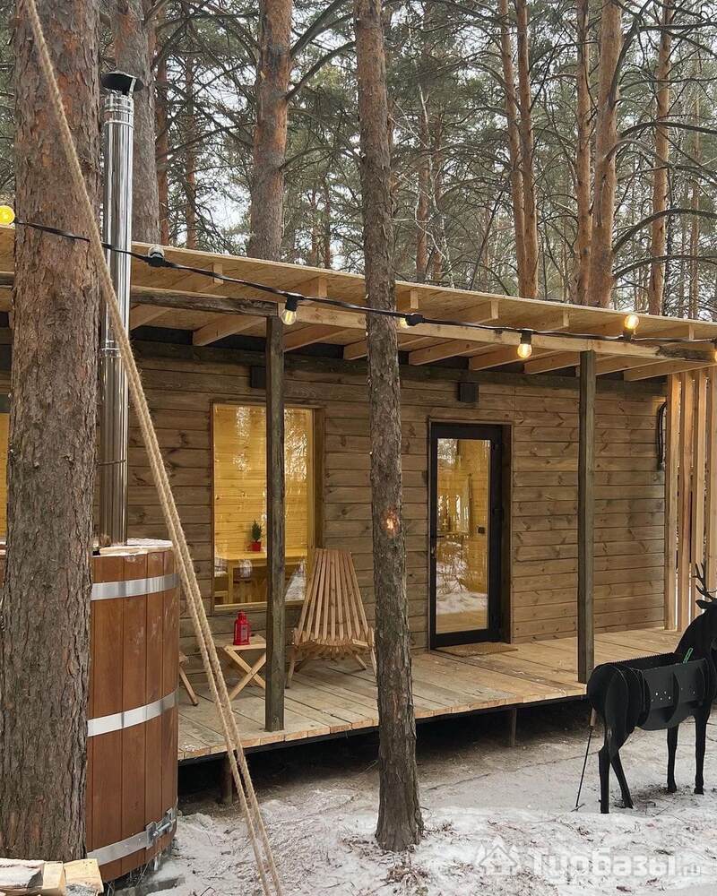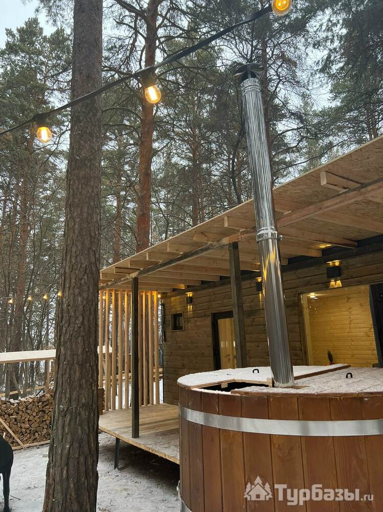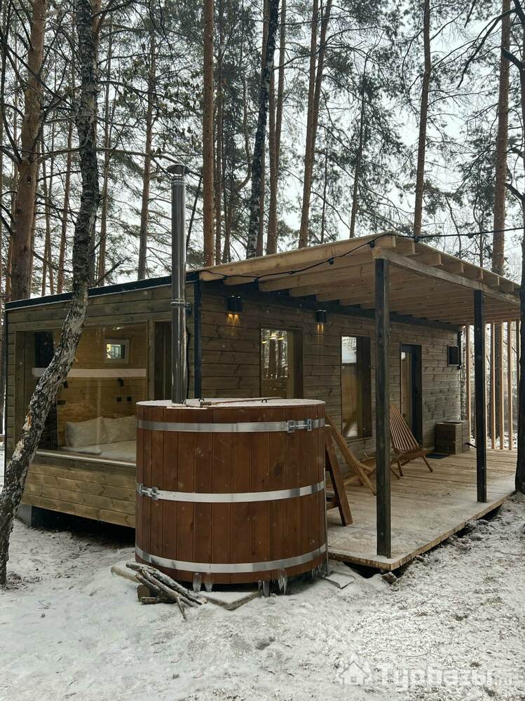 - Баня на дровах с холодной купелью доступна для аренды. Прямо перед террасой каждого домика есть своя купель, которую по запросу растапливают.