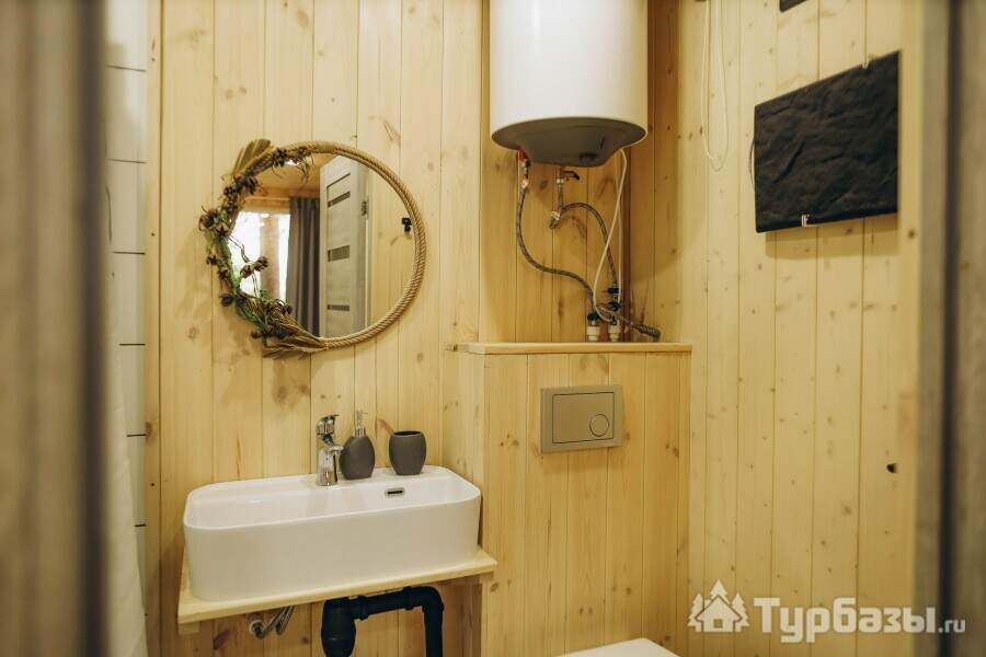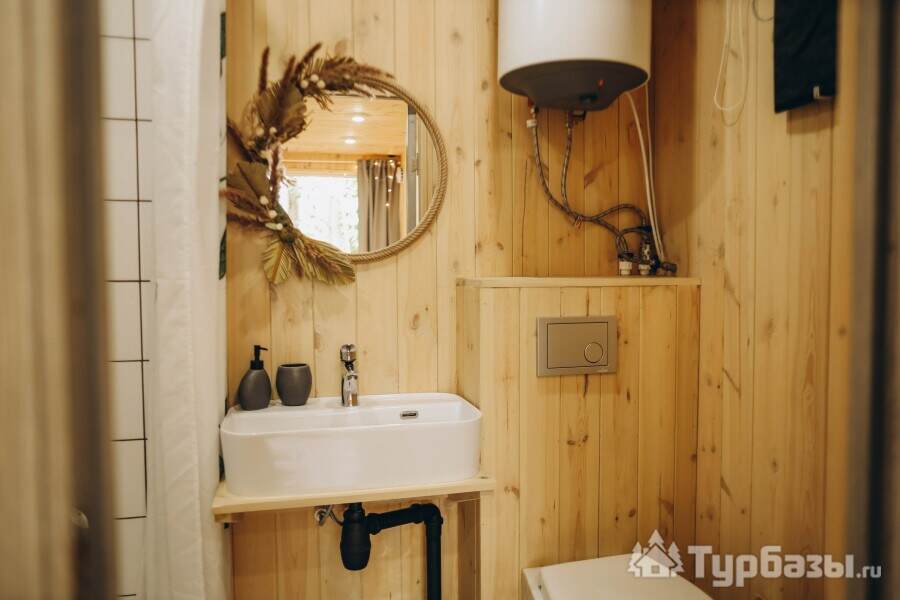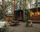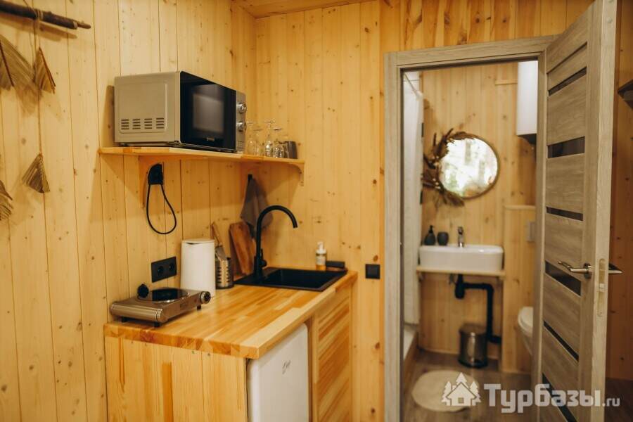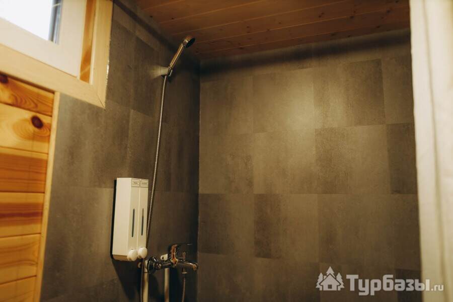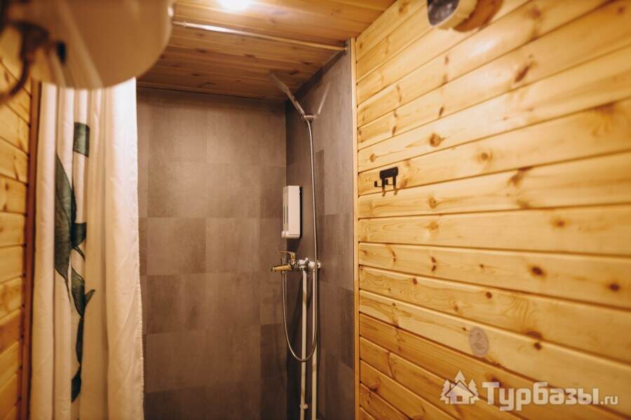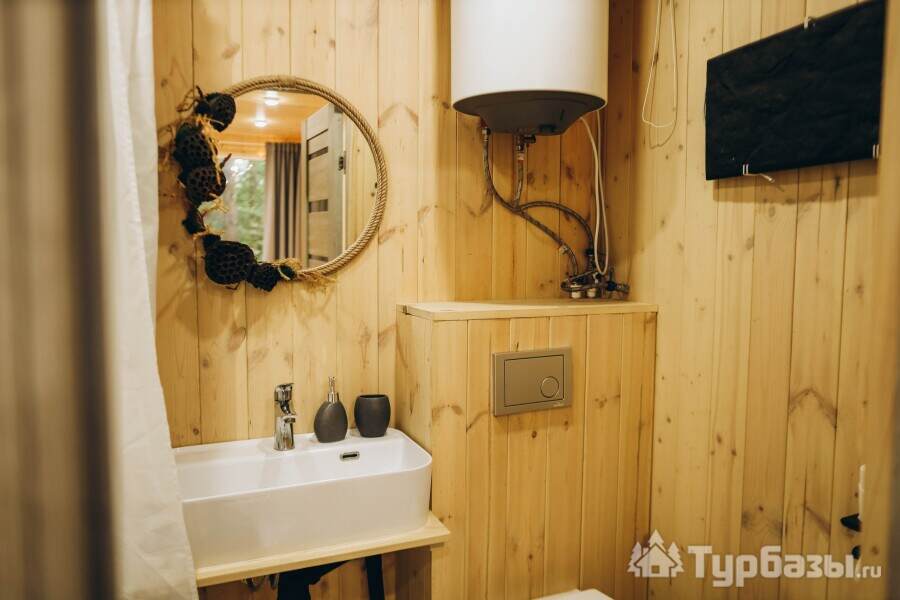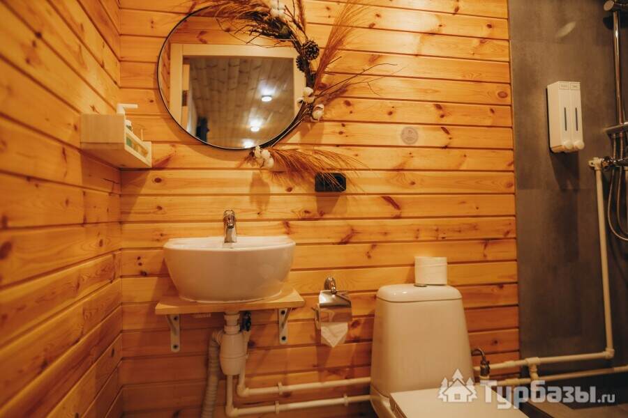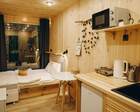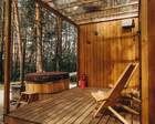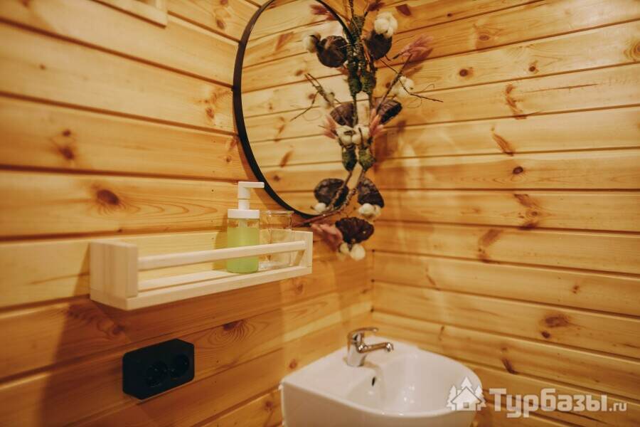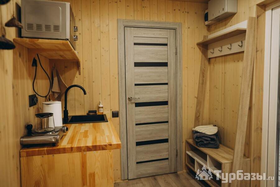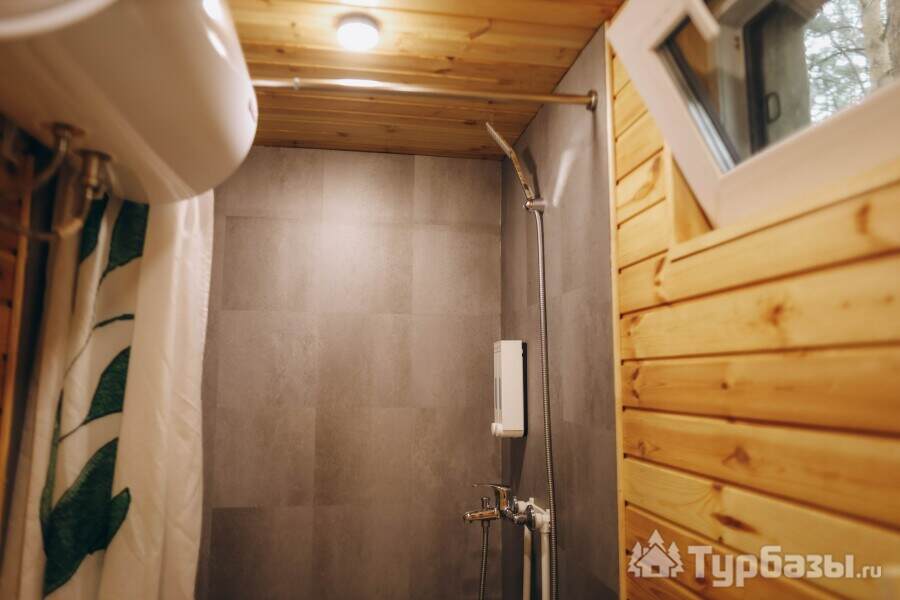 - Баня на дровах с холодной купелью доступна для аренды. Прямо перед террасой каждого домика есть своя купель, которую по запросу растапливают.