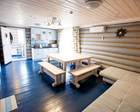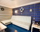 На первом этаже: Кухня-столовая с кухонным гарнитуром, столами и стульями (вместимость за столом до 16 человек), большой тв, туалетная комната, холл с диваном (2 спальных места), большая сауна, душевая, комната отдыха с диваном (2 спальнх места) и тв.
