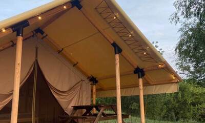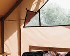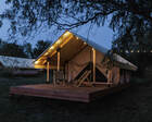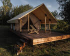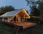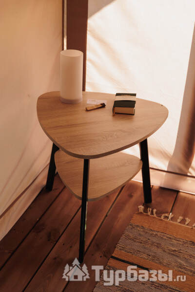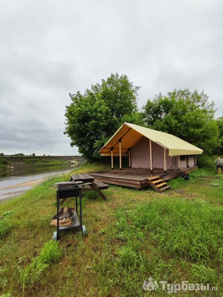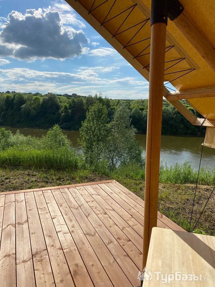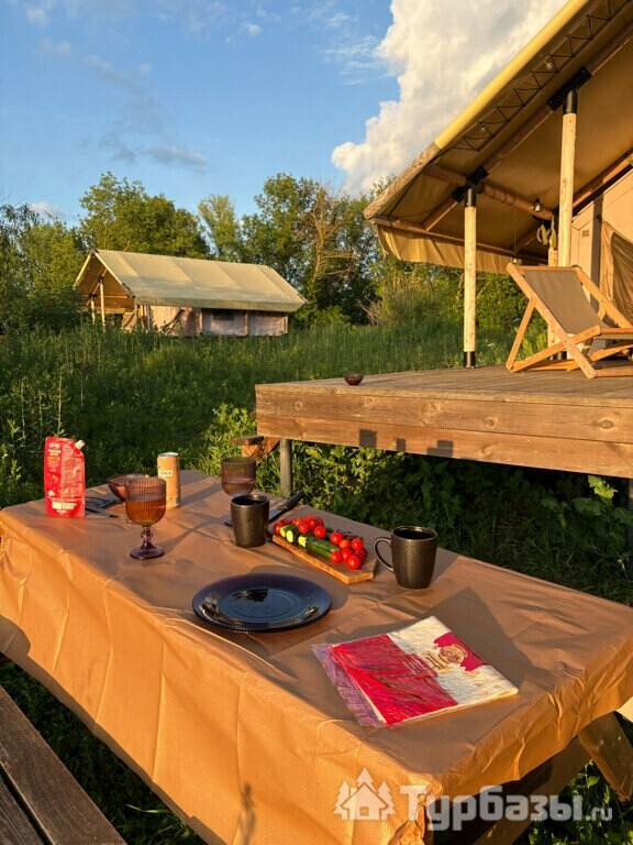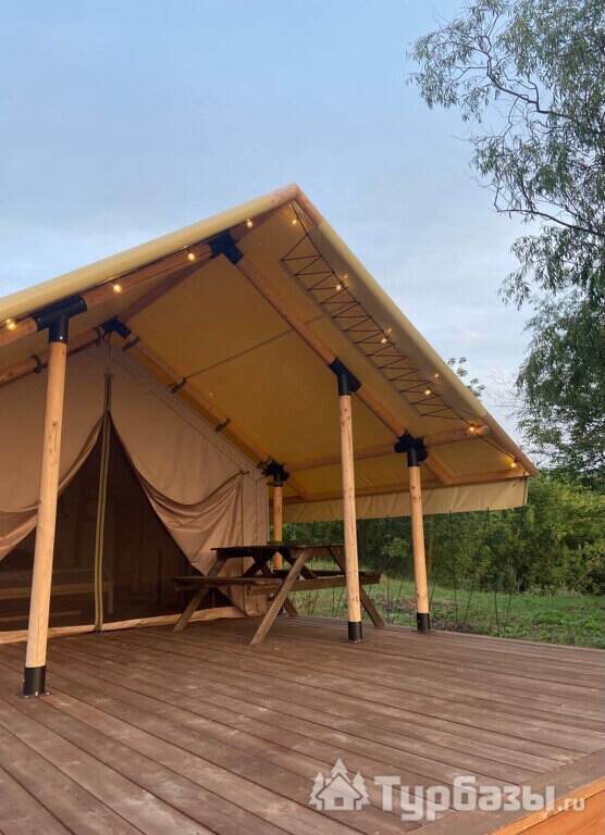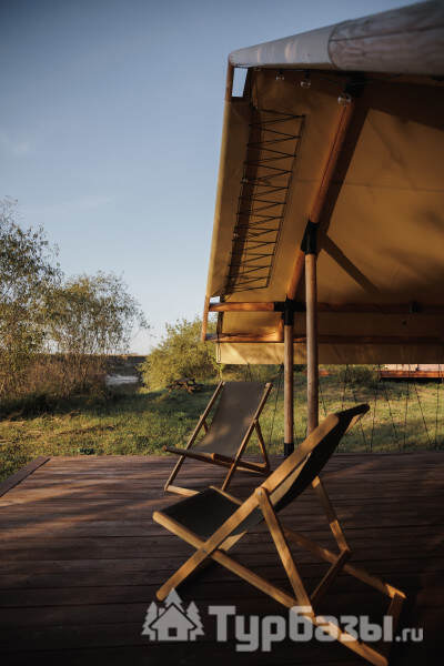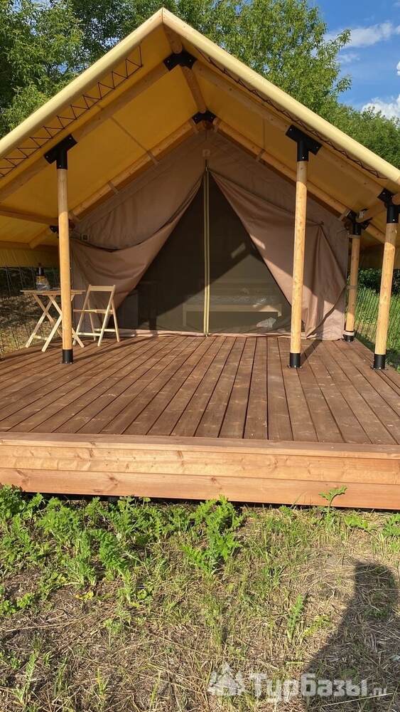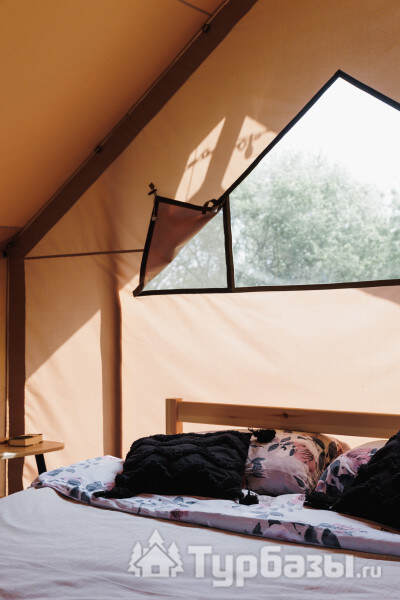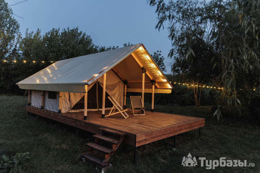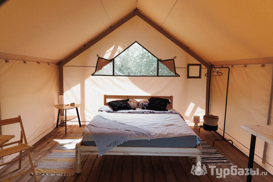 - Glamp-шатры — лёгкие укрытия в стиле глэмпинг с террасой и видом на природу; комнаты оснащены компактной кухней, спальным местом и зоной для отдыха.