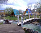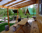 Территория базы имеет ухоженный вид. Отдыхающие могут прогуливаться по каменным тропинкам по роскошному саду. Есть живописный пруд с перекидным мостиком. Гости могут воспользоваться мобильной баней. На территории комплекса есть мангалы и уютные беседки, в которых можно прекрасно отдохнуть.