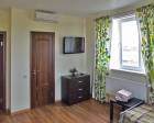 В номере двуспальная кровать, прикроватные тумбочки, комод, журнальный столик, два кресла, телевизор, сплит-система, санузел с душем и туалетом.