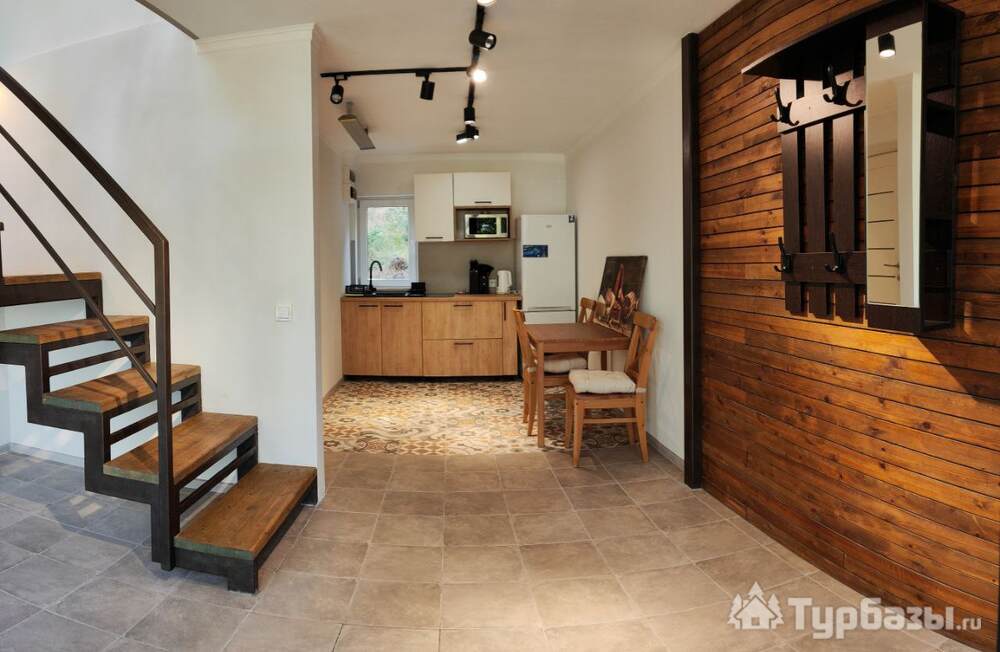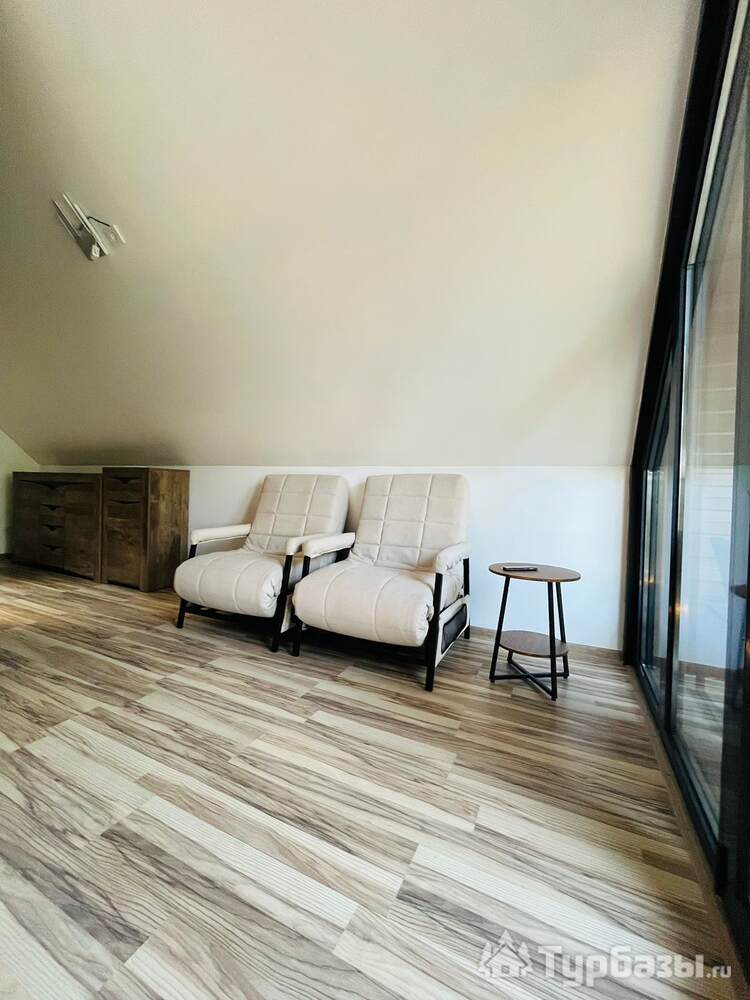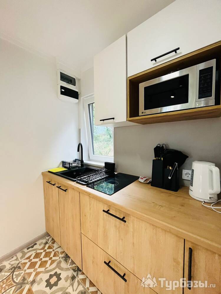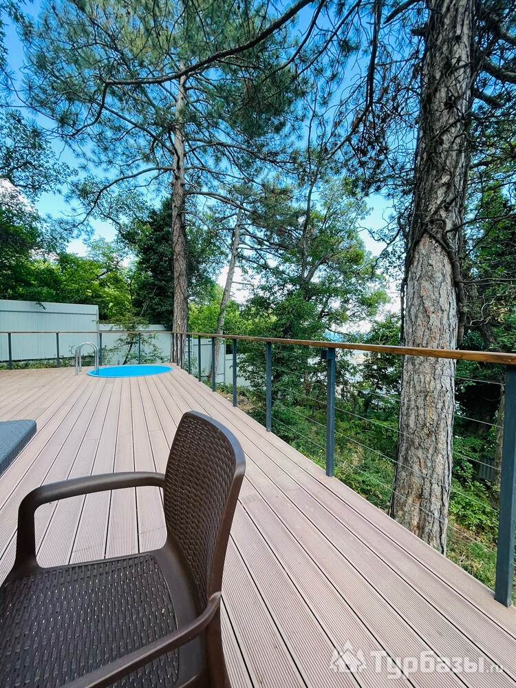 На территории расположен 2-х этажный домик с отдельным входом, широкими балконами на первом и втором этажах. Дом рассчитан на проживание до 4-х человек (2-х спальная кровать и два кресло-кровати). На первом этаже кухня-гостиная и санузел с душем. В домике новое оборудование, включая кофемашину.