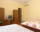 Первый этаж состоит из двухместных номеров. Они оборудованы таким же образом, как и номера на втором этаже. Есть балконы со столиками. Так же на первом этаже имеется номер без удобств на 3 спальных места. В нем есть вентилятор. Этот номер достаточно просторный. Его жильцы пользуются удобствами во дворе. На улице имеется туалет и летний душ с горячей водой.